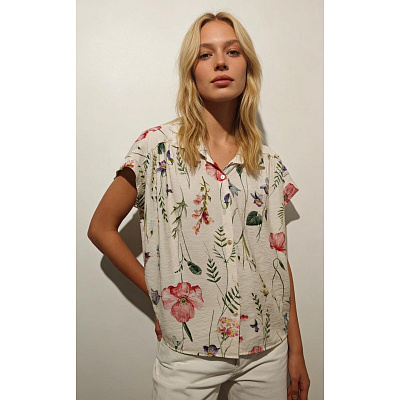 Dámská košile s potiskem drobných kvítků. Košile je propínací a má krátký rukáv.