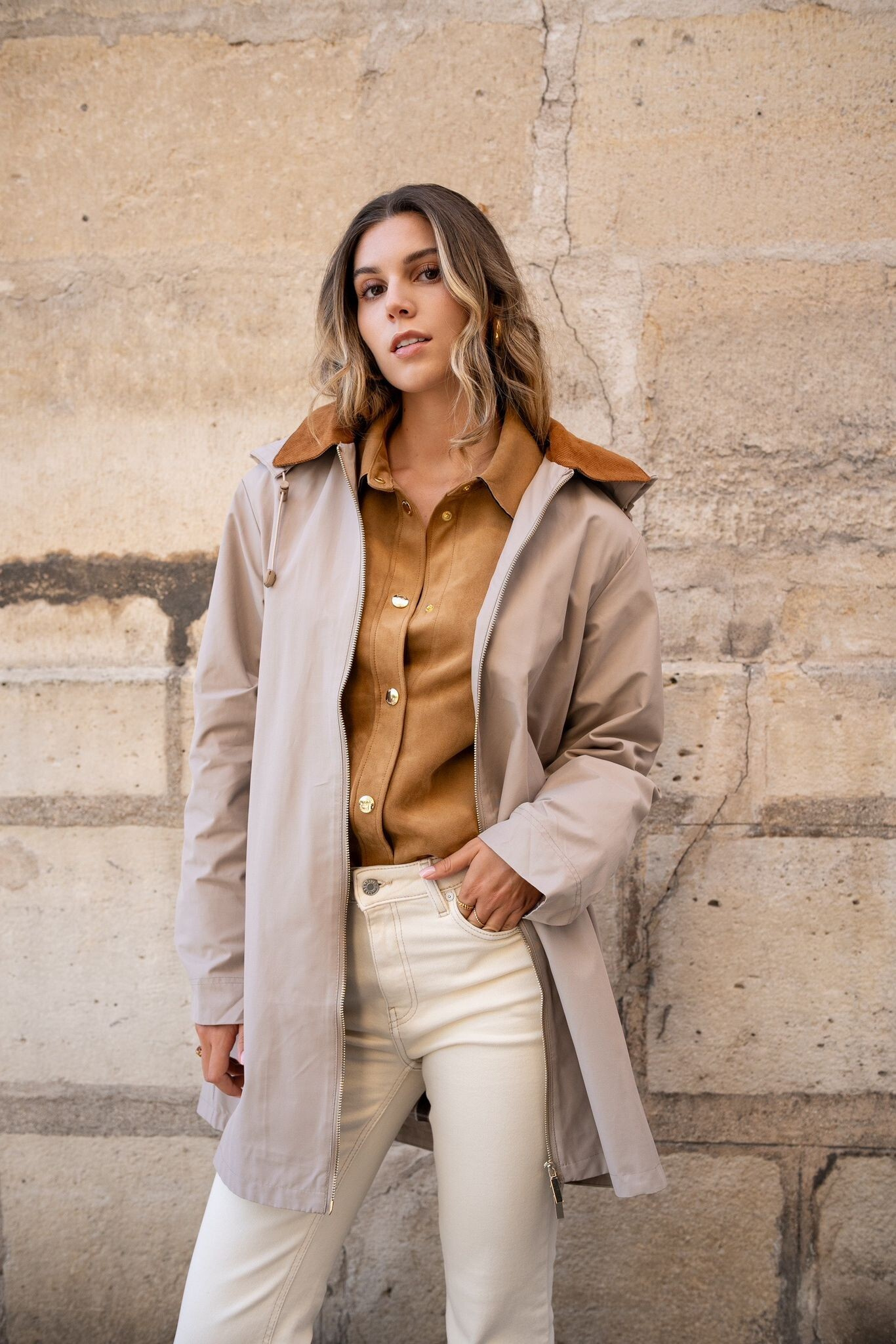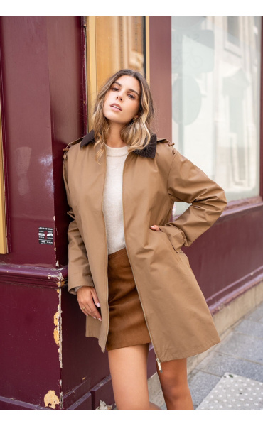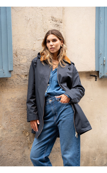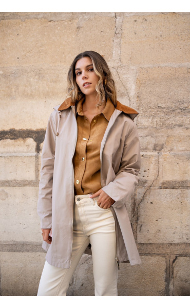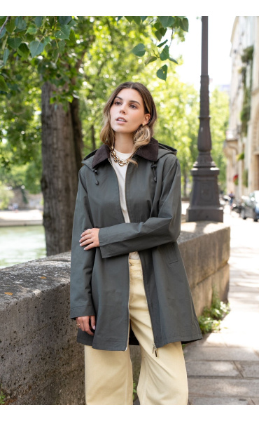 Stylový dámský kabátek se všitými kapsami po stranách. Jedná se o velice módní kousek, který je vhodný i do deště. Kabát má odnímatelnou kapuci a manšestrový límec.