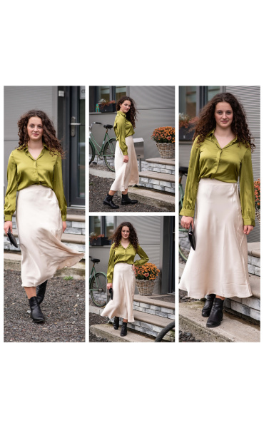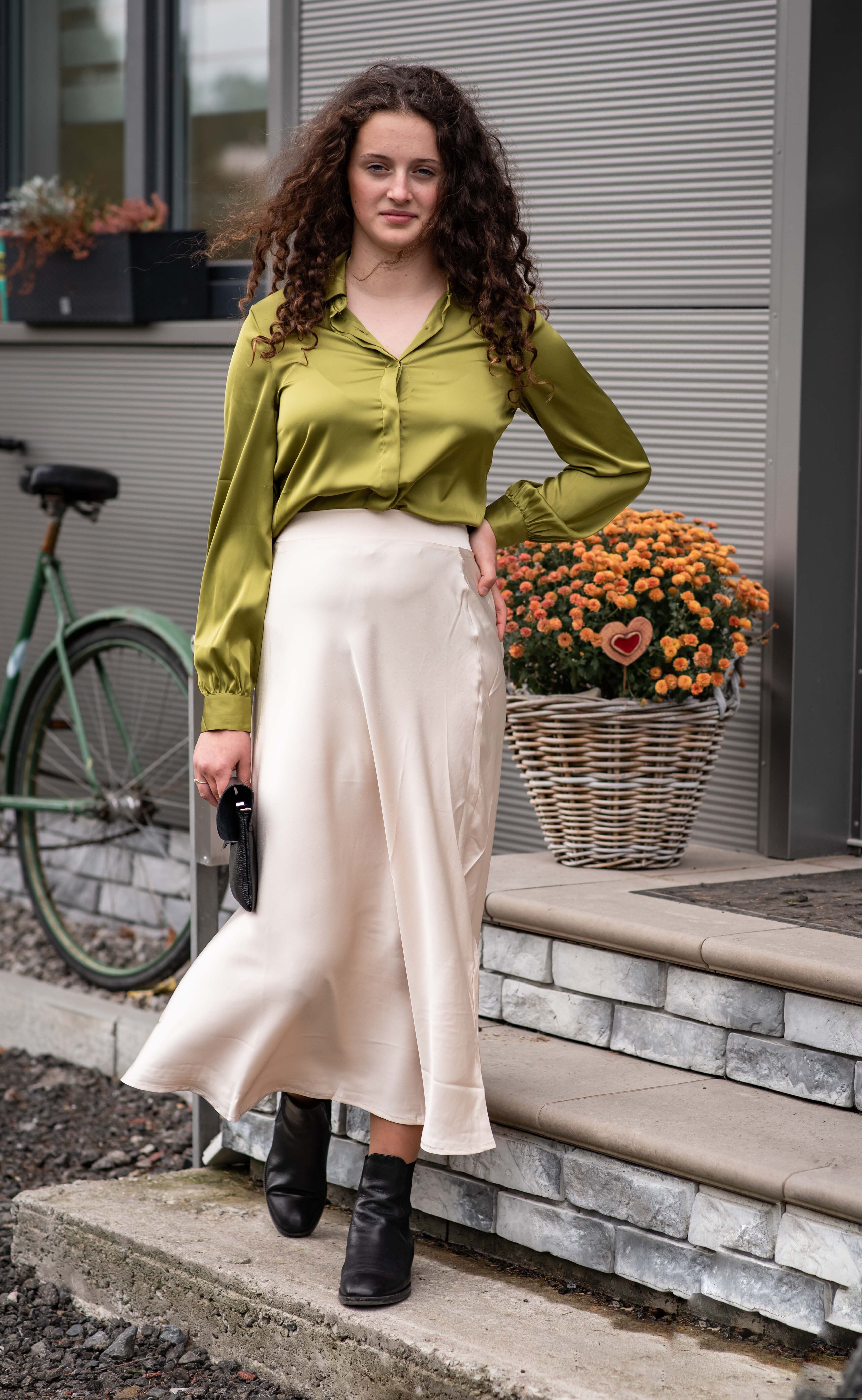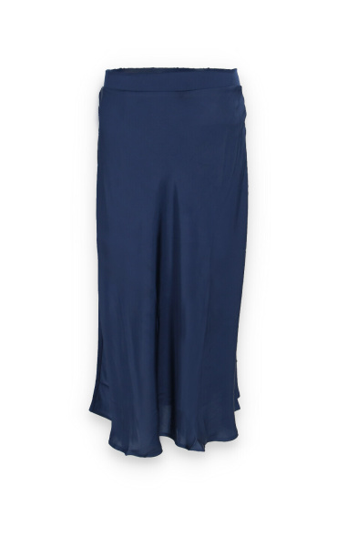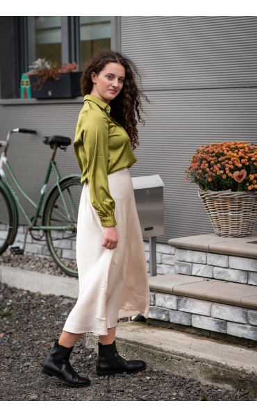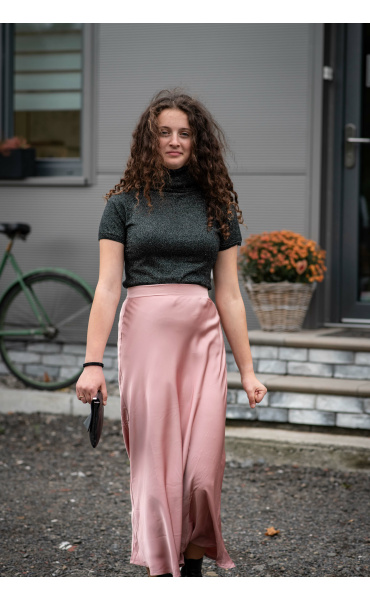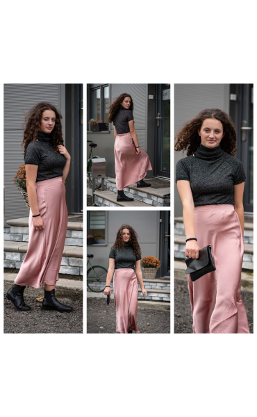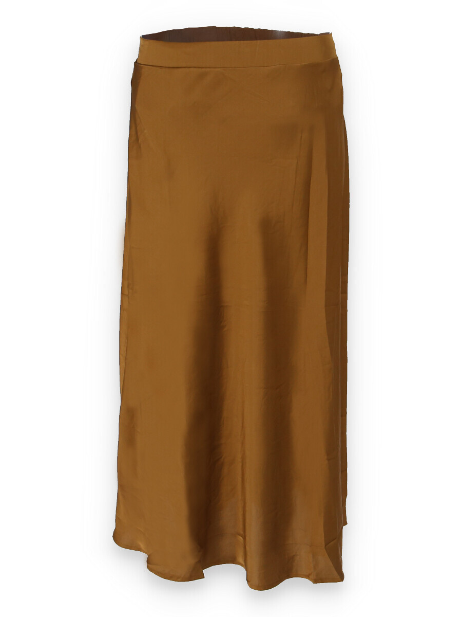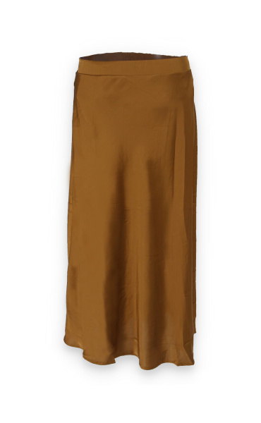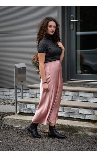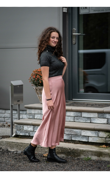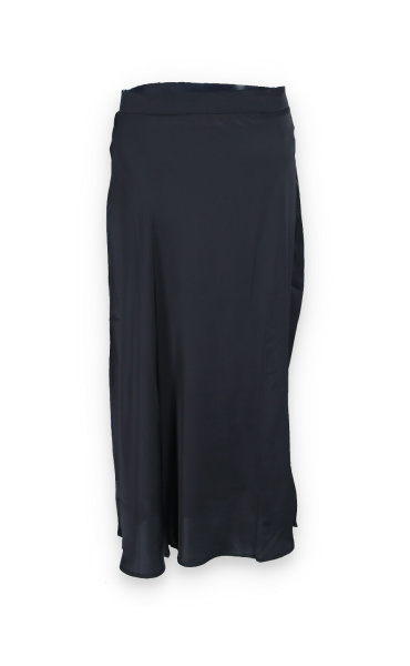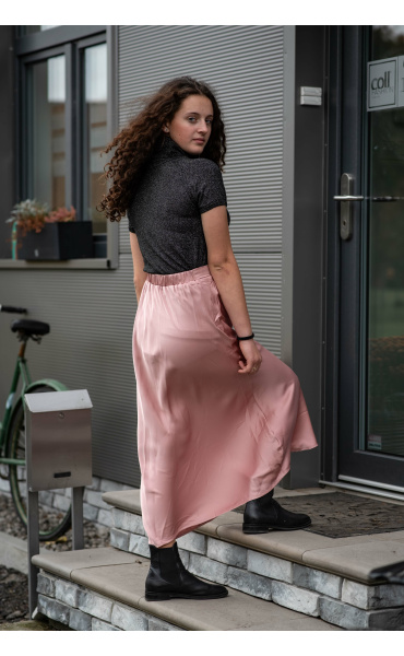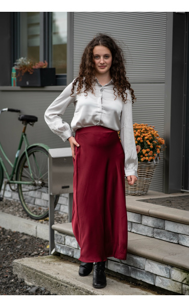 Dlouhá sukně s páskem z mačkaného materiálu doplněná páskem. Sukně má podšívku a v pase je do gumy.