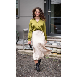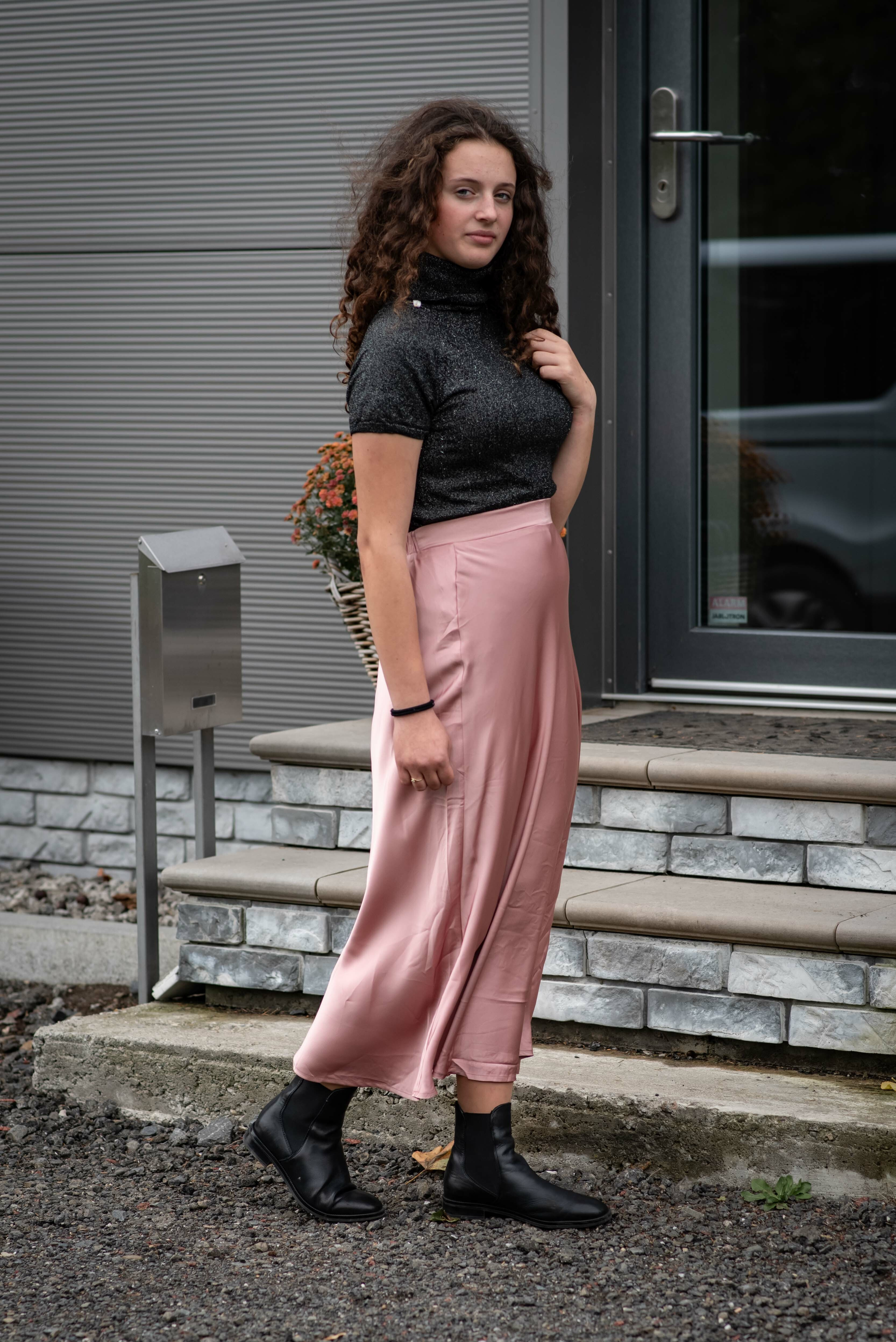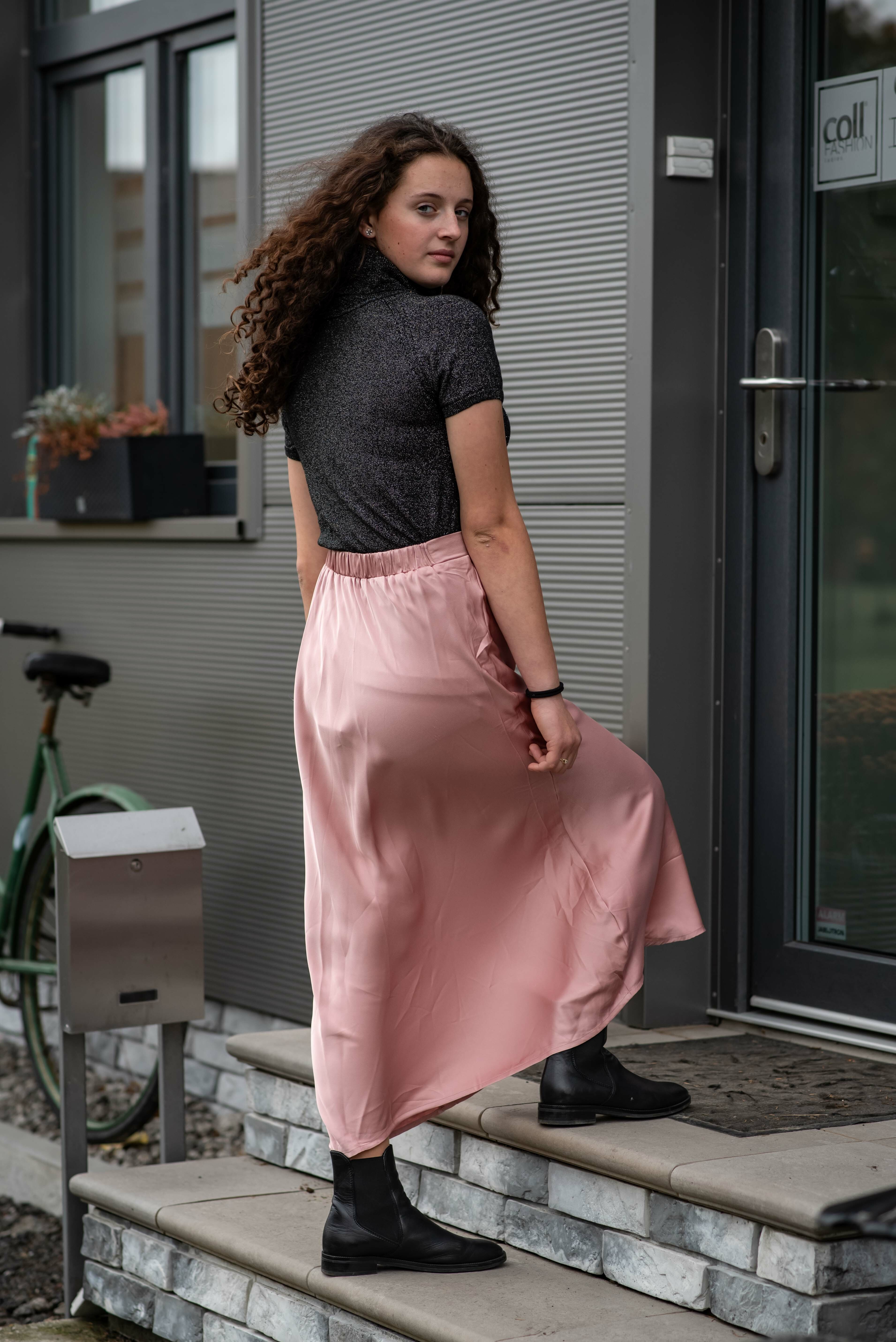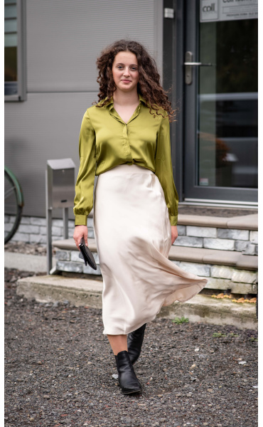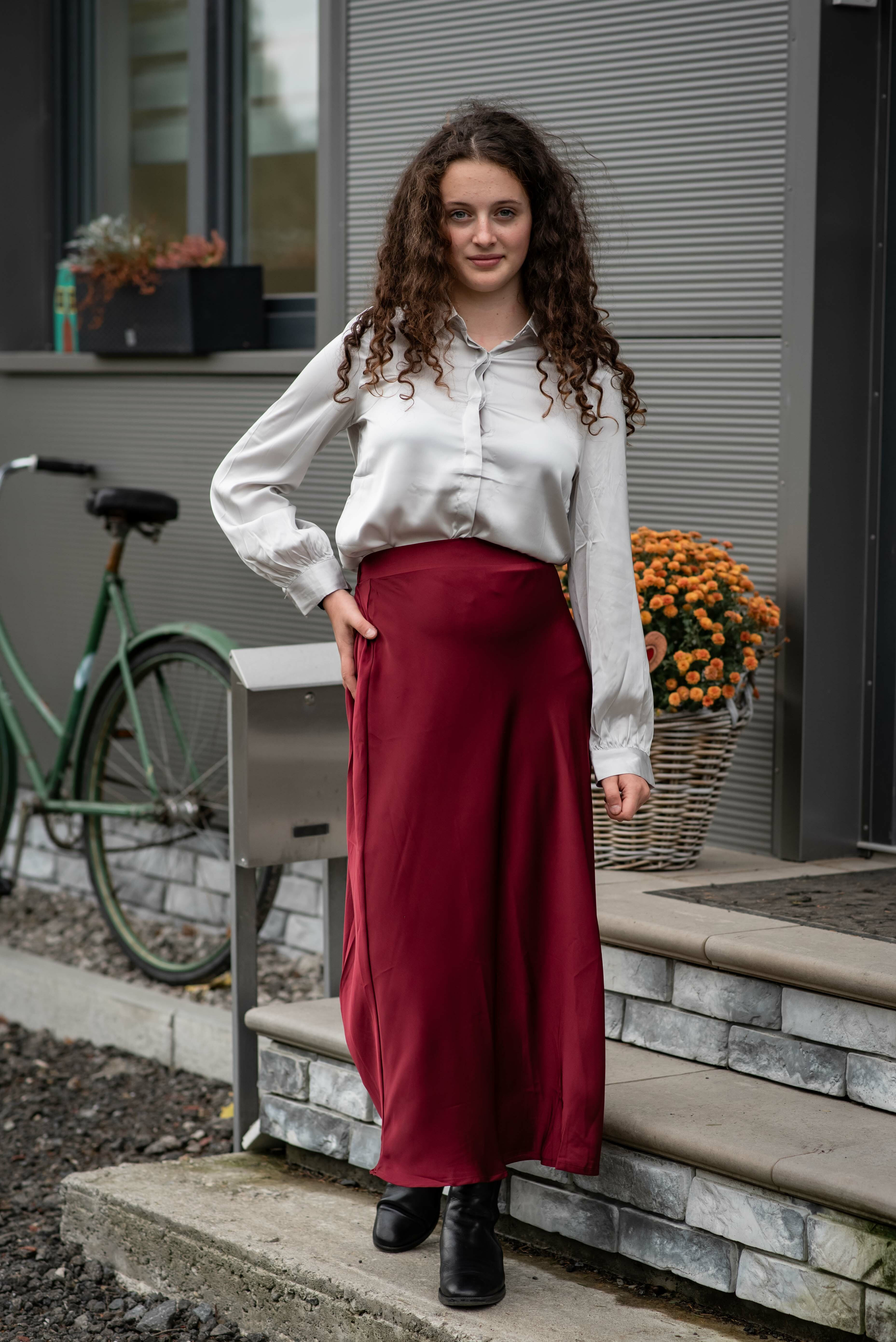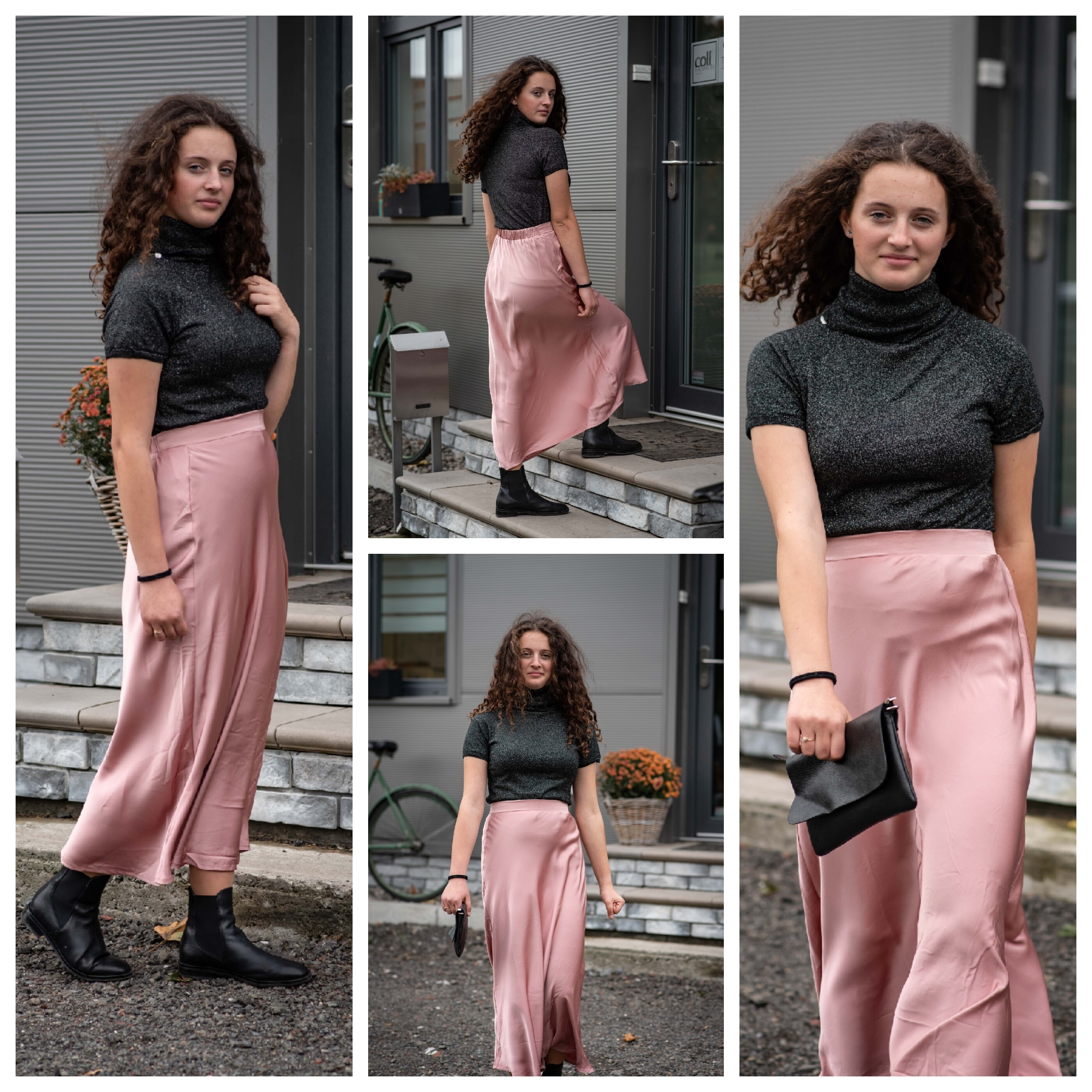 Dlouhá sukně s páskem z mačkaného materiálu doplněná páskem. Sukně má podšívku a v pase je do gumy.