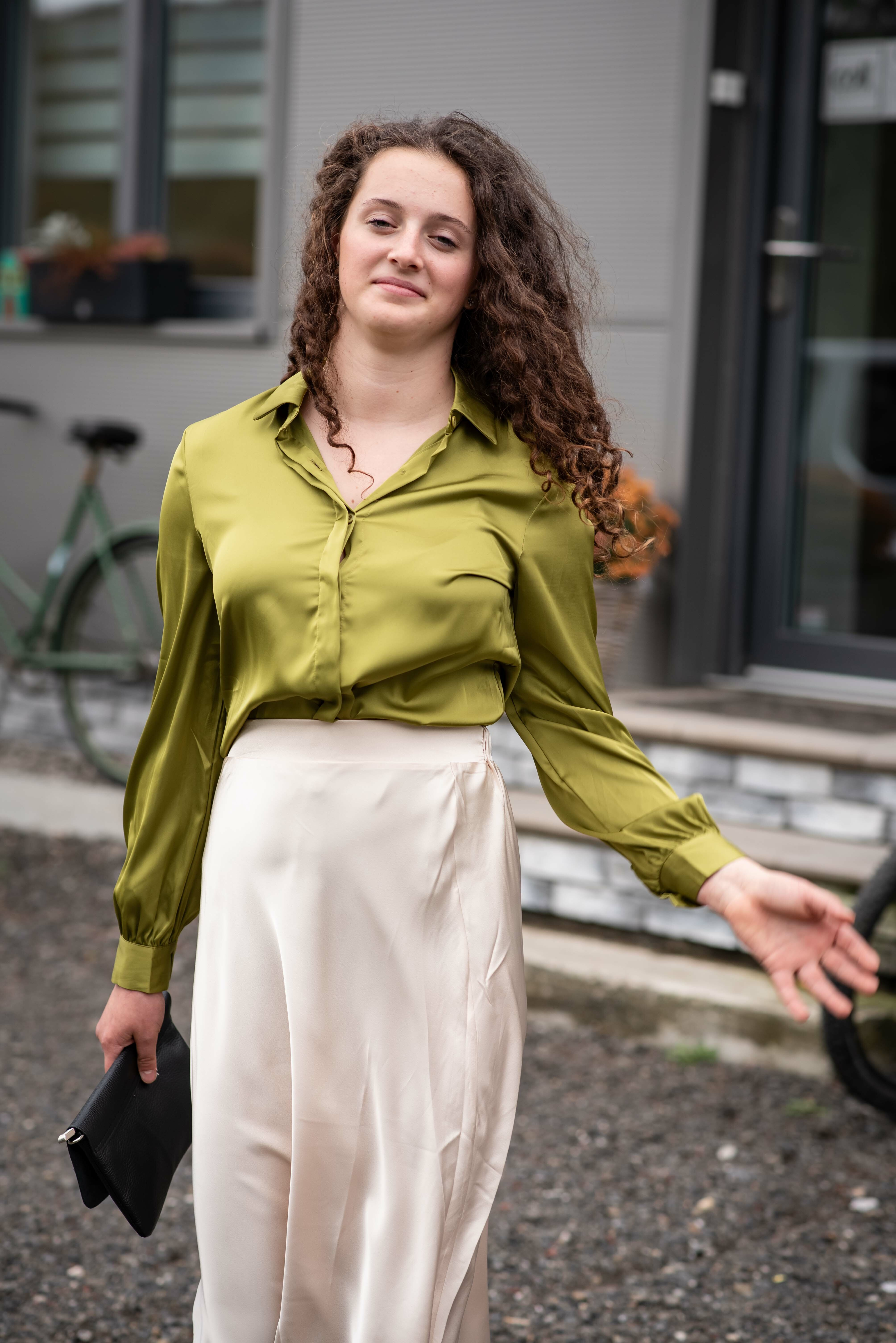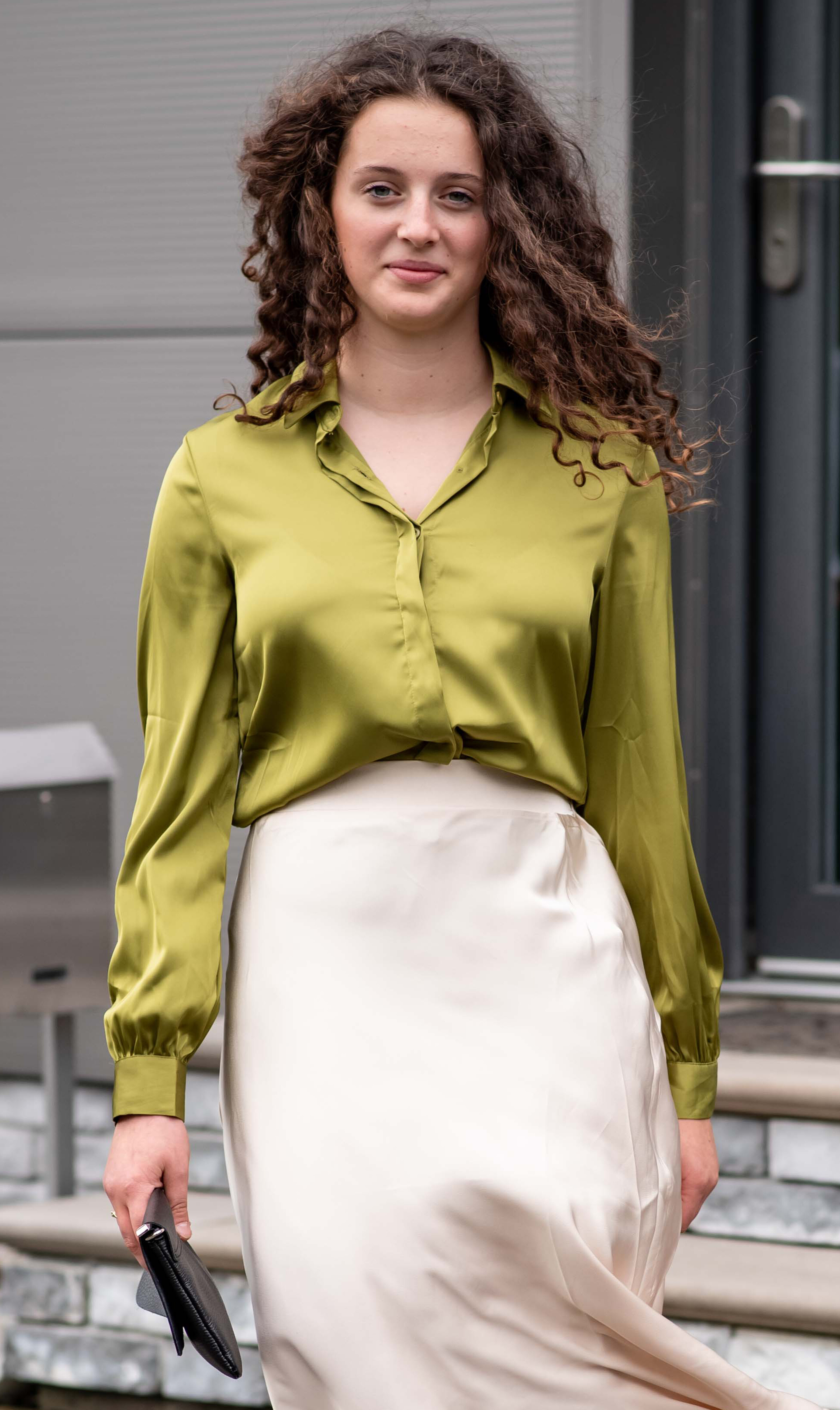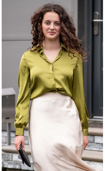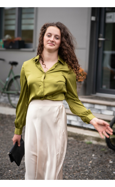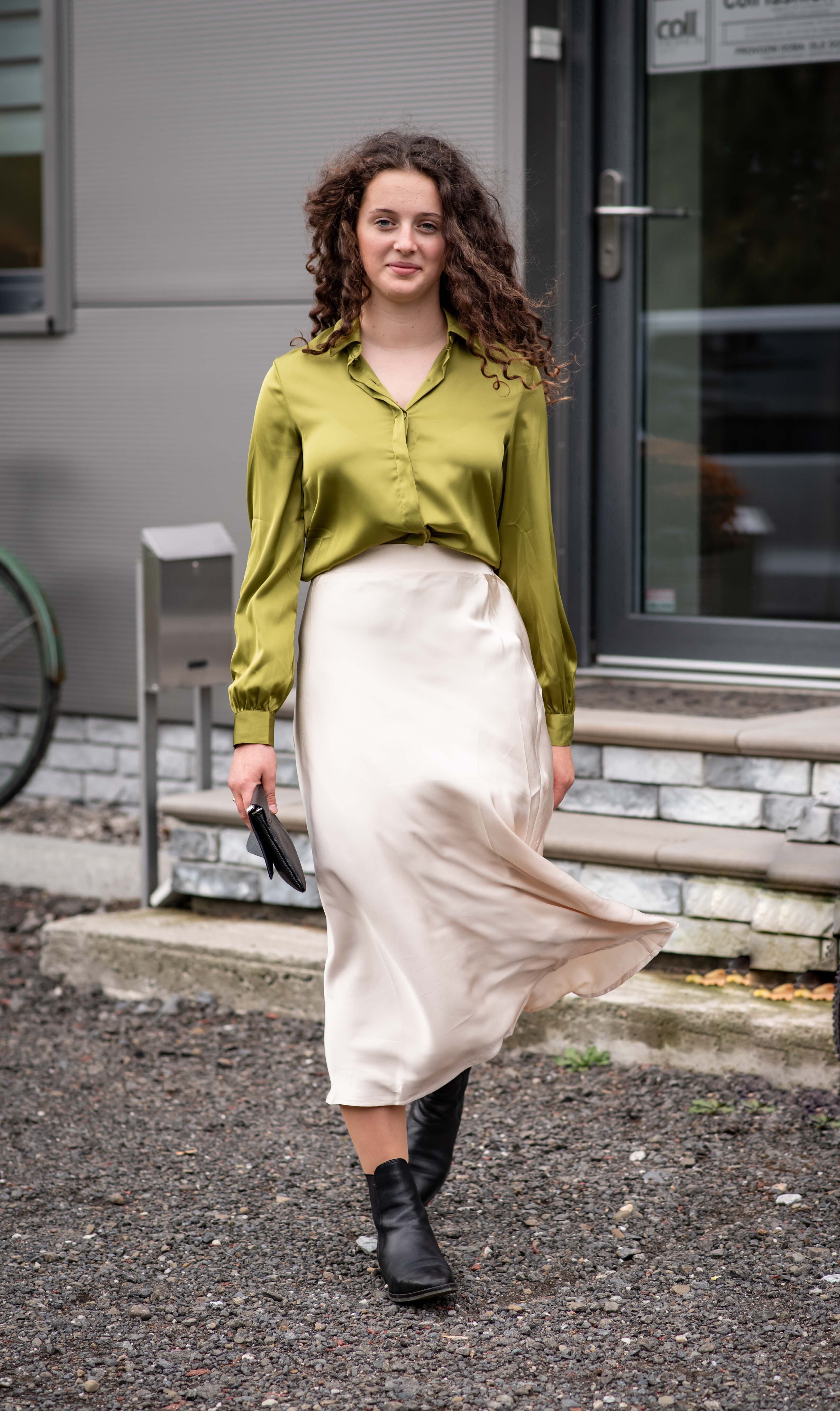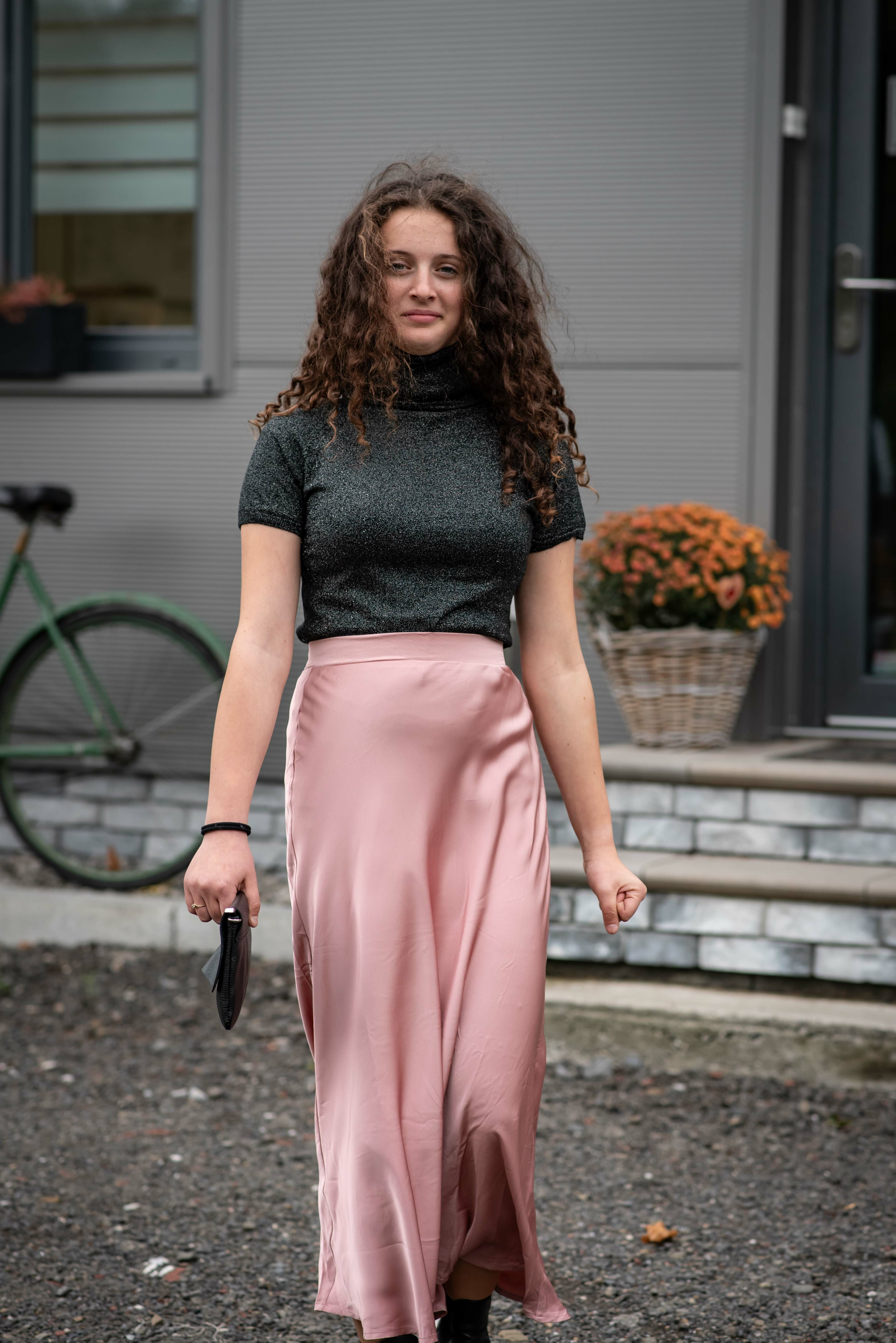 Dlouhá sukně s páskem z mačkaného materiálu doplněná páskem. Sukně má podšívku a v pase je do gumy.