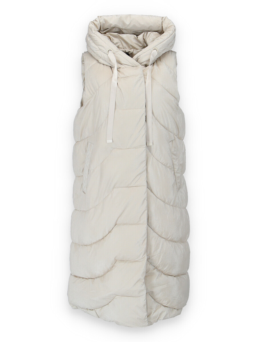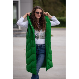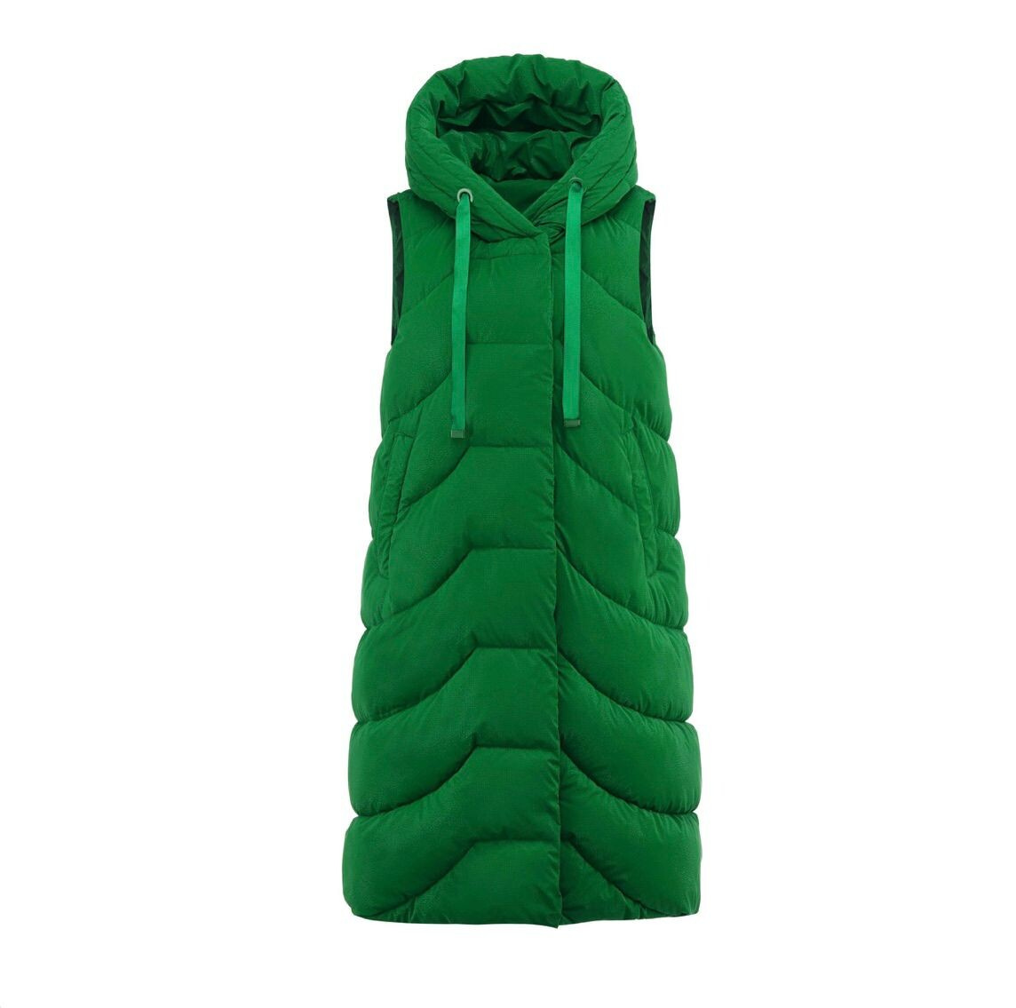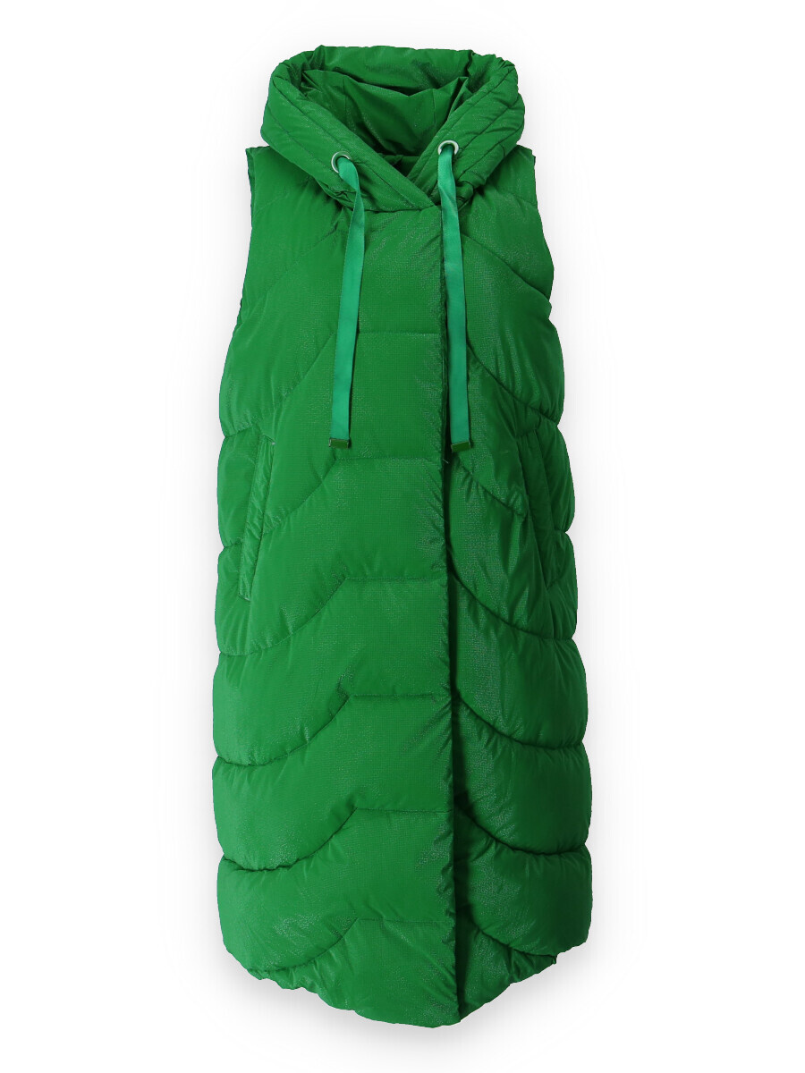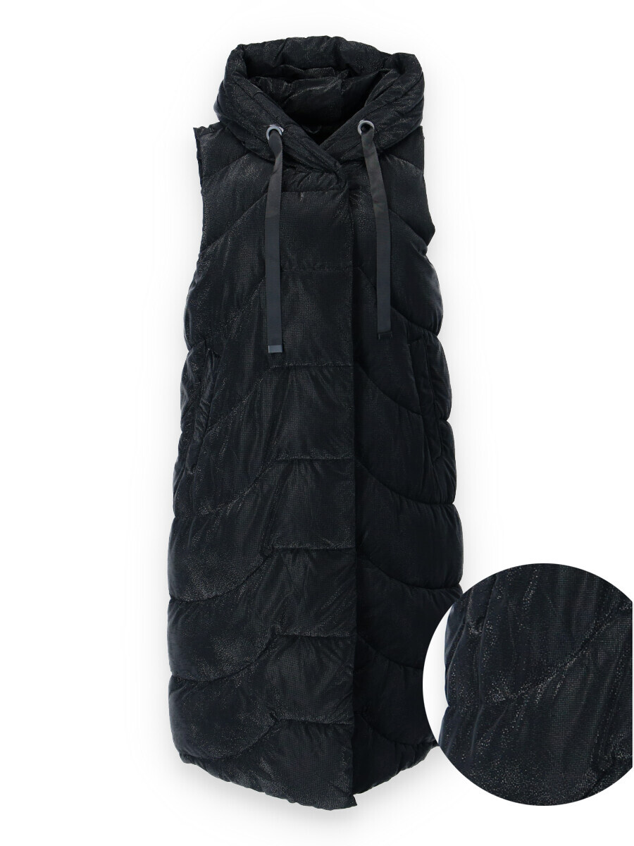 Dlouhá zimní vesta s kapucí. Vesta má lesklý povrch a zapínání na druky. Dovoz Itálie