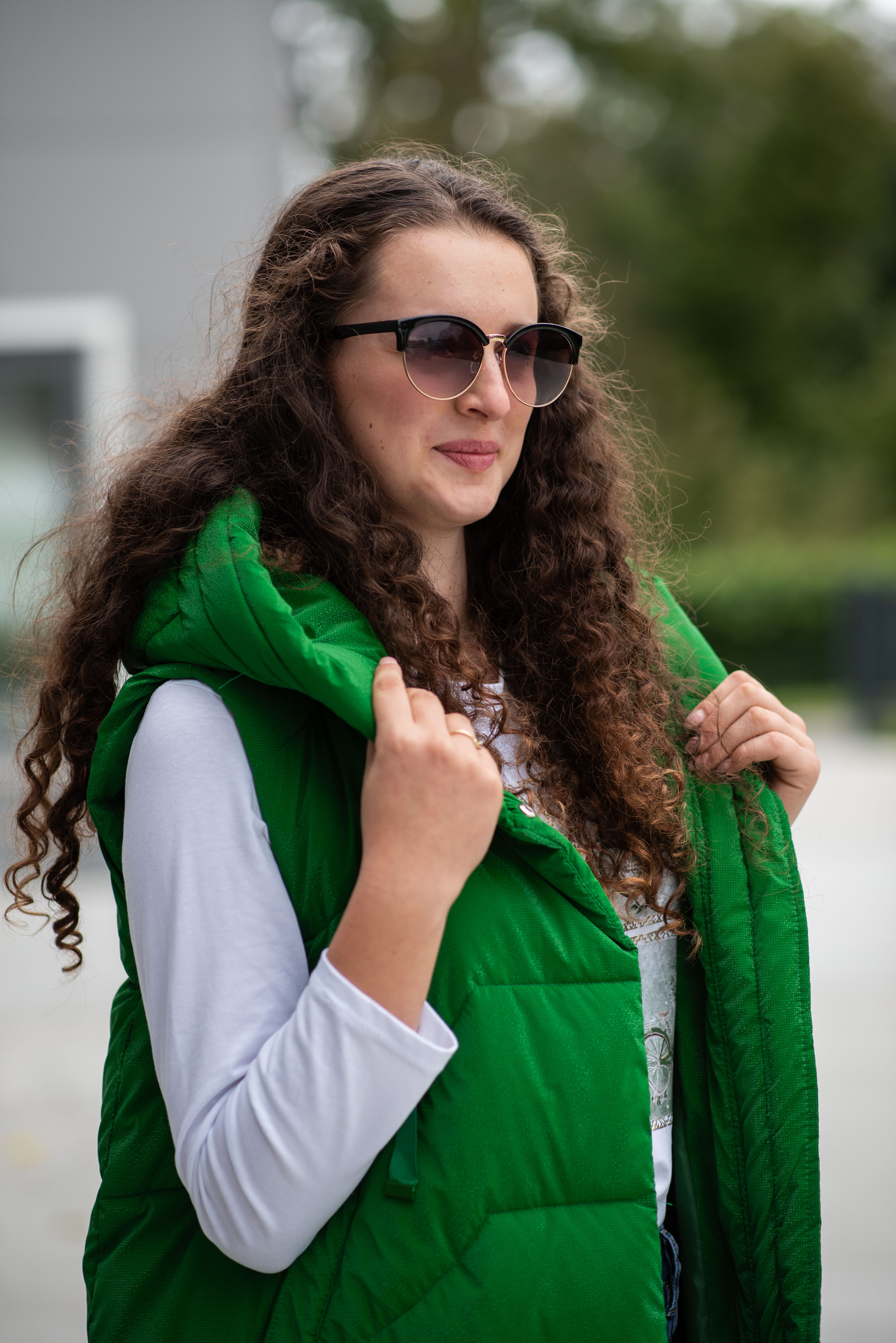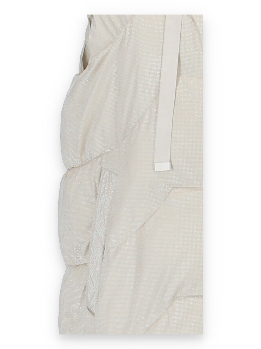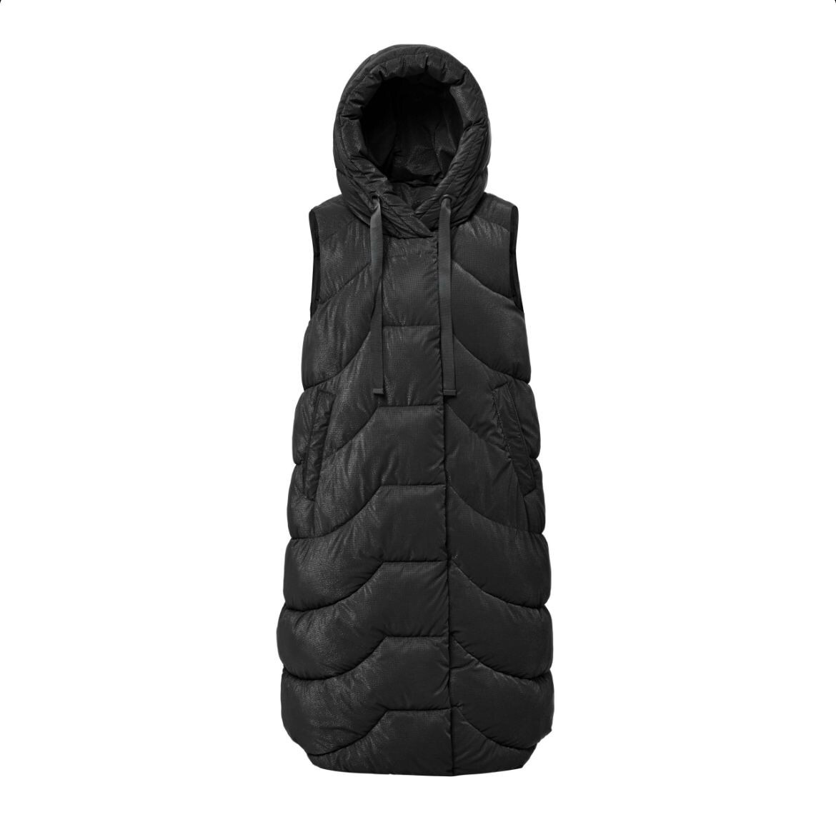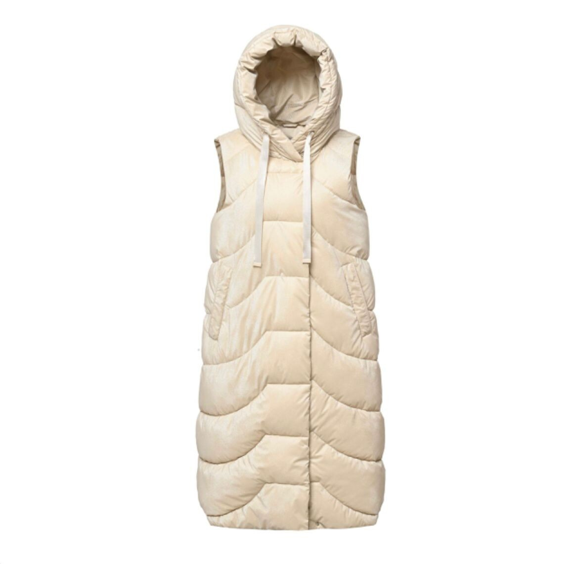 Dlouhá zimní vesta s kapucí. Vesta má lesklý povrch a zapínání na druky. Dovoz Itálie
