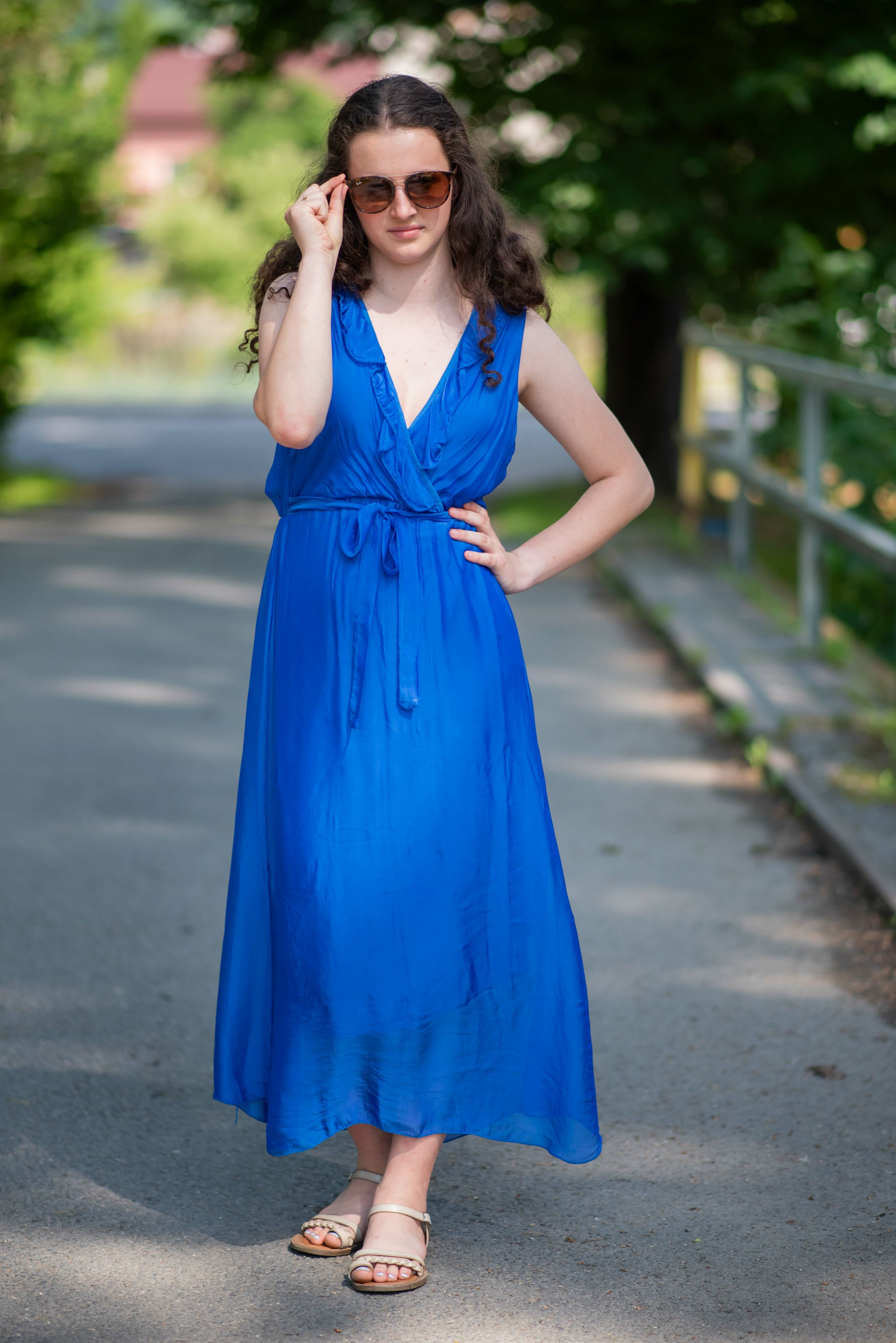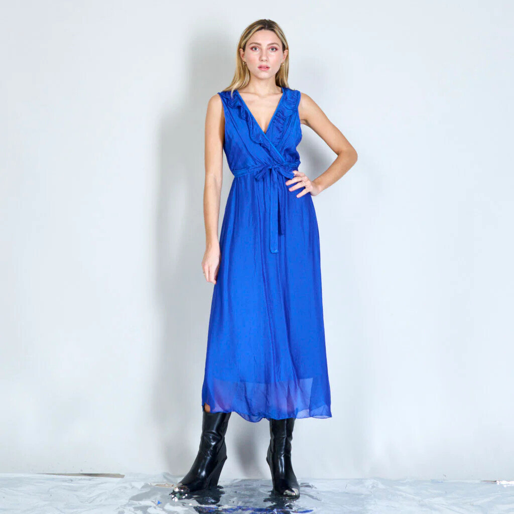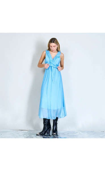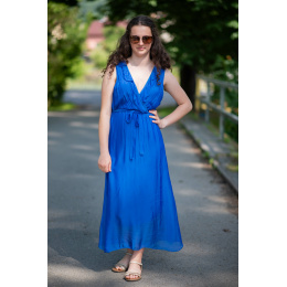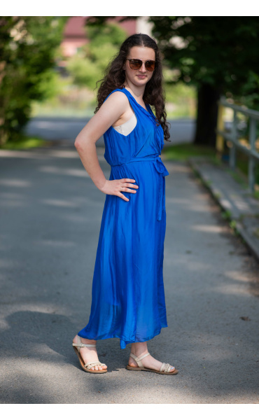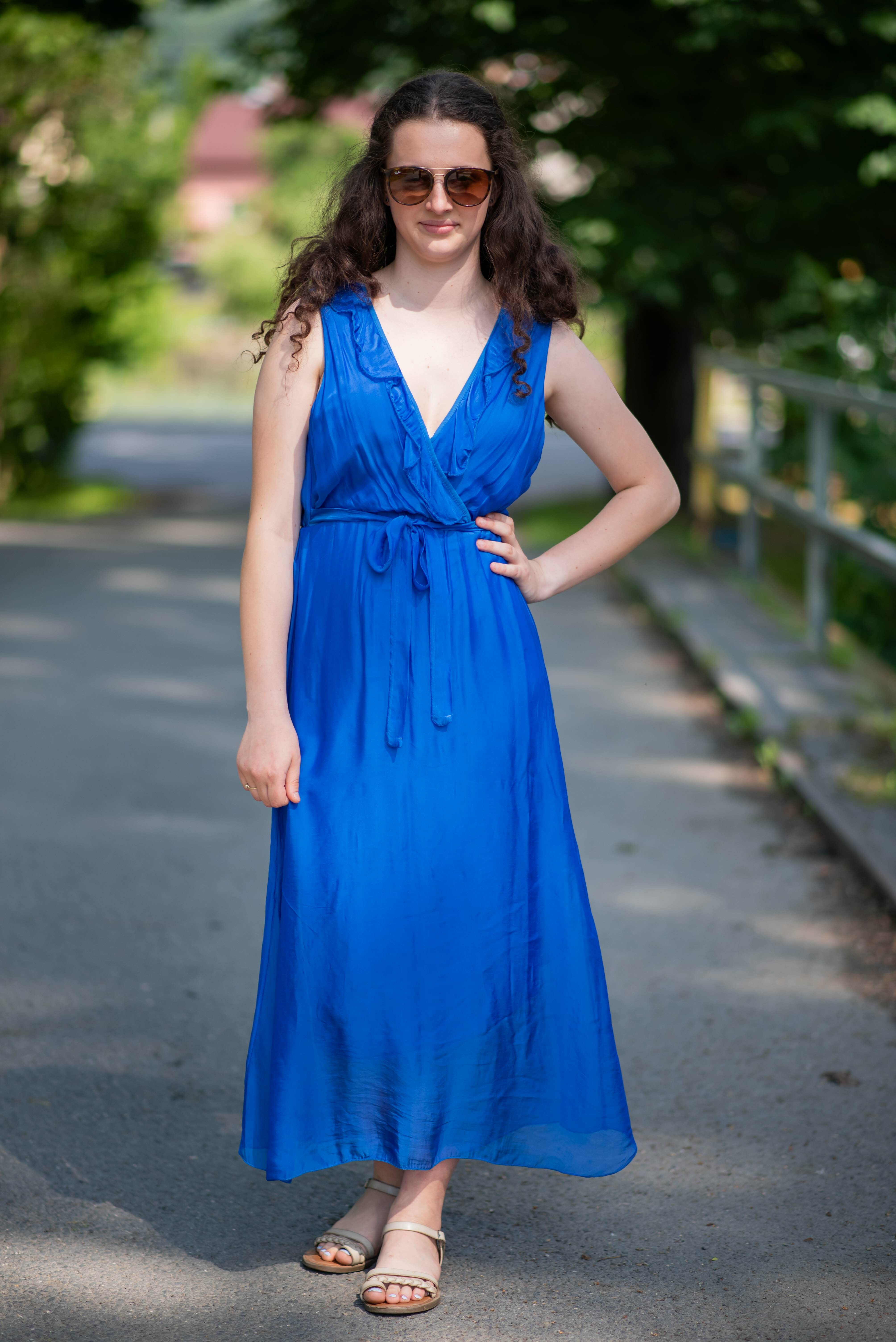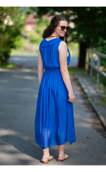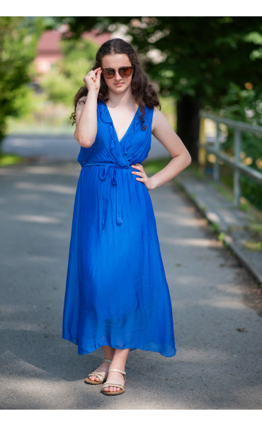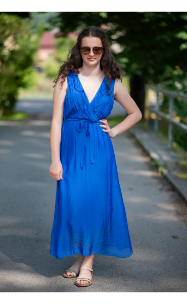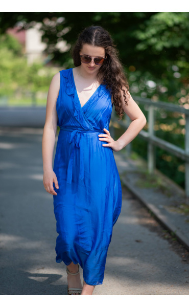 Letní dlouhé hedvábné šaty v pase na uvázání, šaty jsou s výstřihem do V, doplněny ozdobnými volánky v oblasti výstřihu. Lehounké vzdušné šaty s podšívkou ideální pro horké letní dny.
