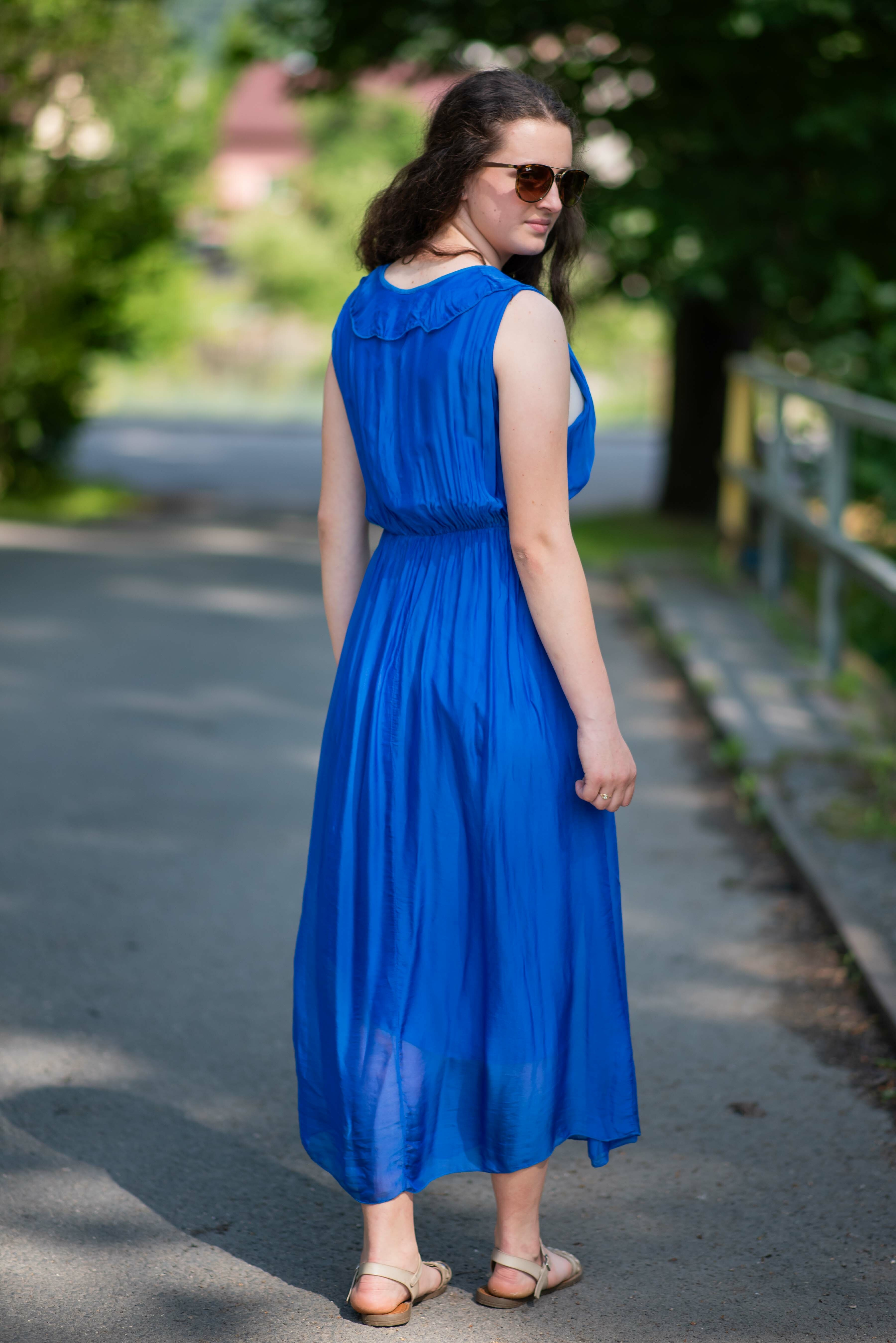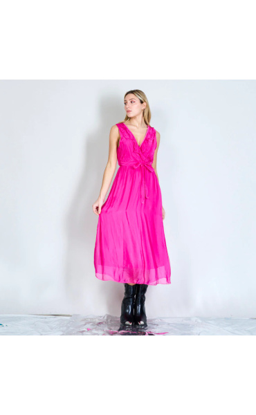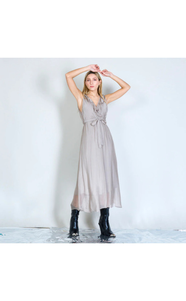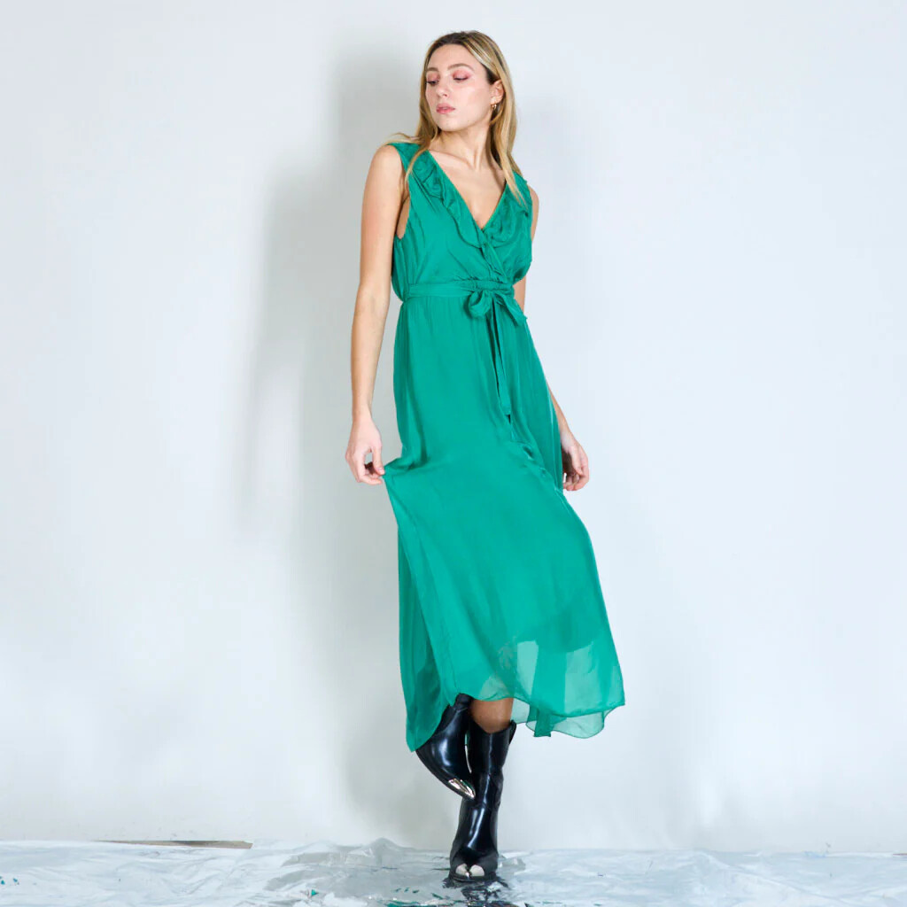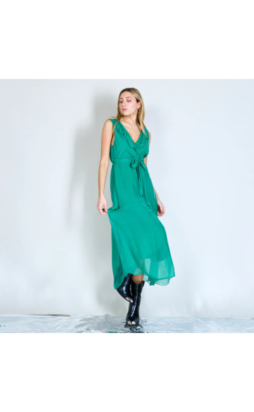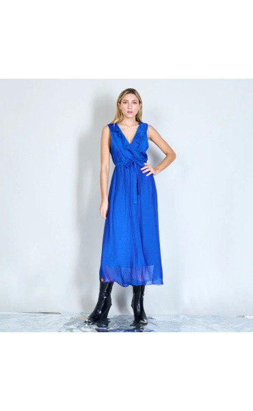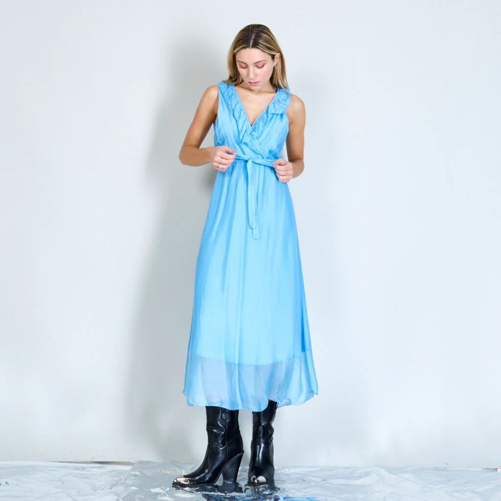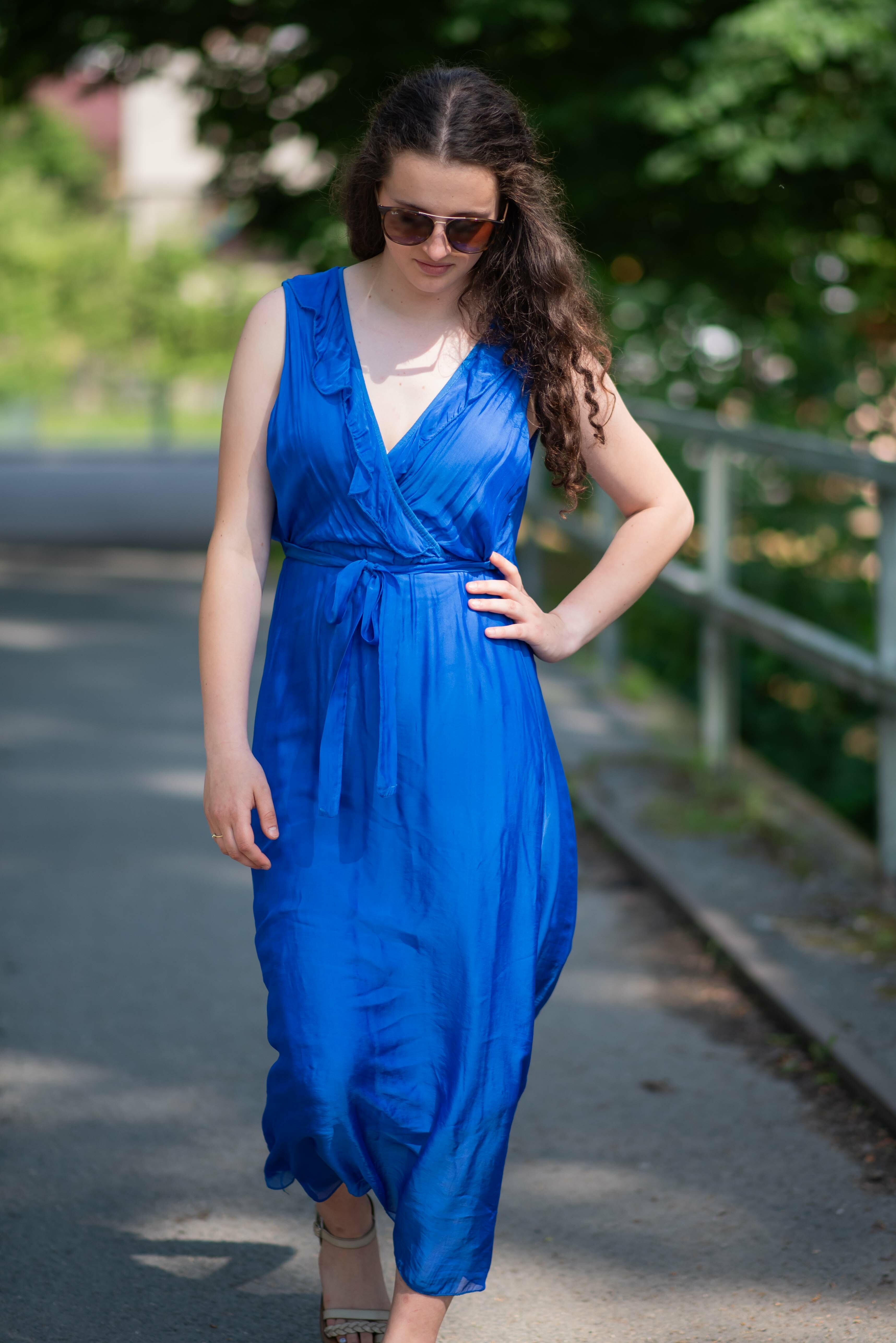 Letní dlouhé hedvábné šaty v pase na uvázání, šaty jsou s výstřihem do V, doplněny ozdobnými volánky v oblasti výstřihu. Lehounké vzdušné šaty s podšívkou ideální pro horké letní dny.
