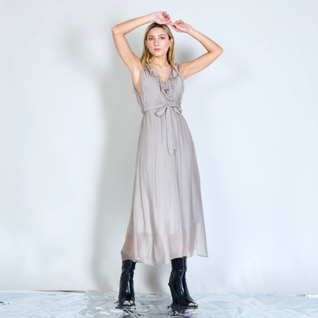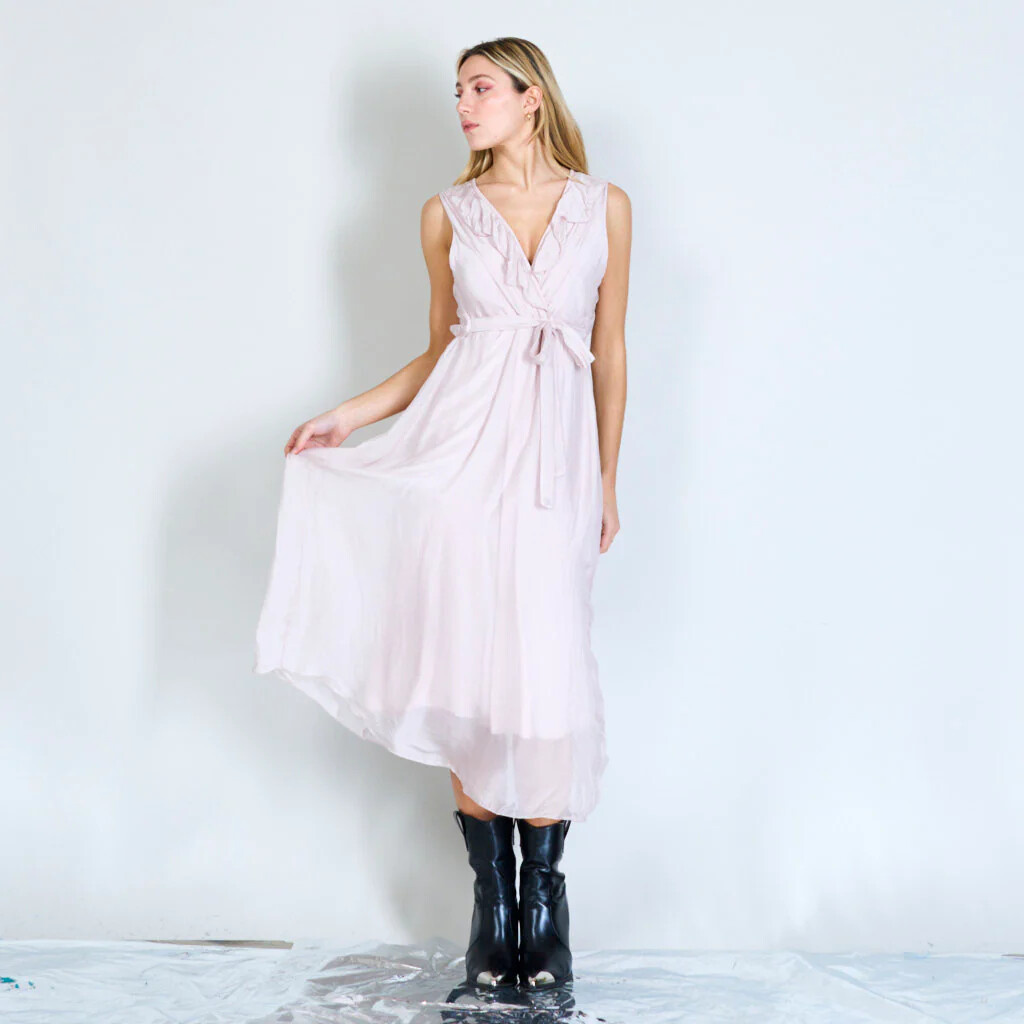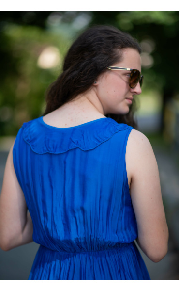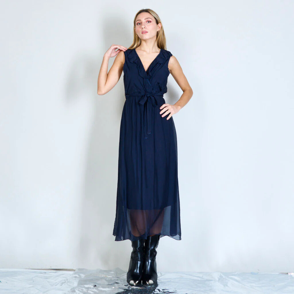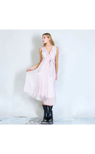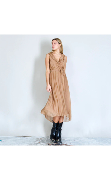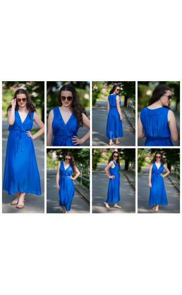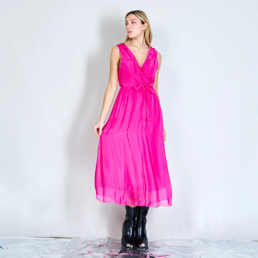 Letní dlouhé hedvábné šaty v pase na uvázání, šaty jsou s výstřihem do V, doplněny ozdobnými volánky v oblasti výstřihu. Lehounké vzdušné šaty s podšívkou ideální pro horké letní dny.