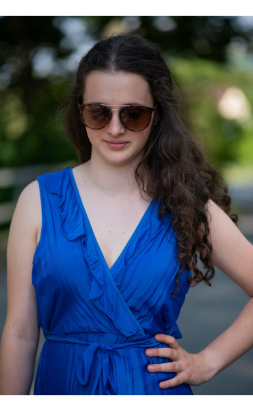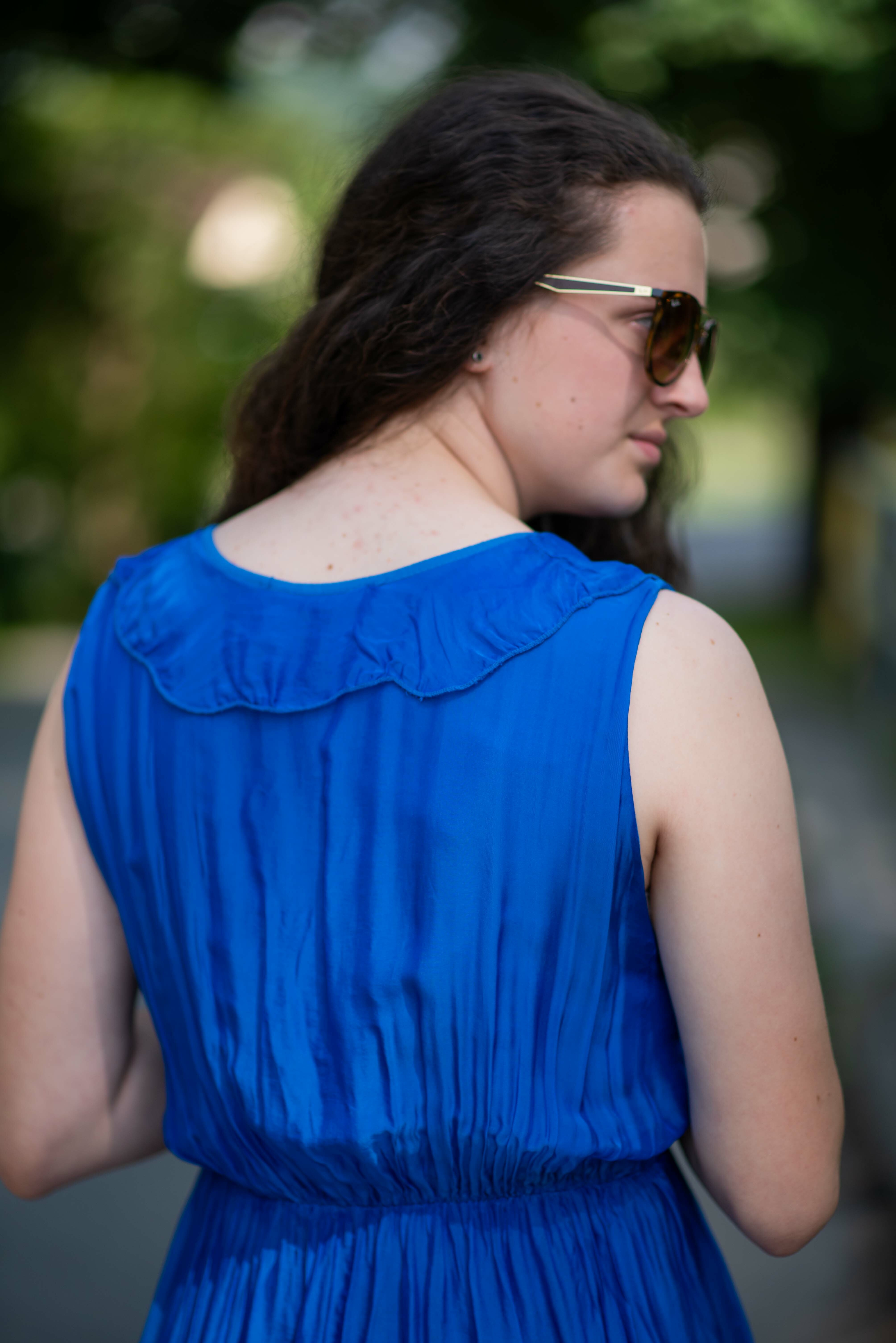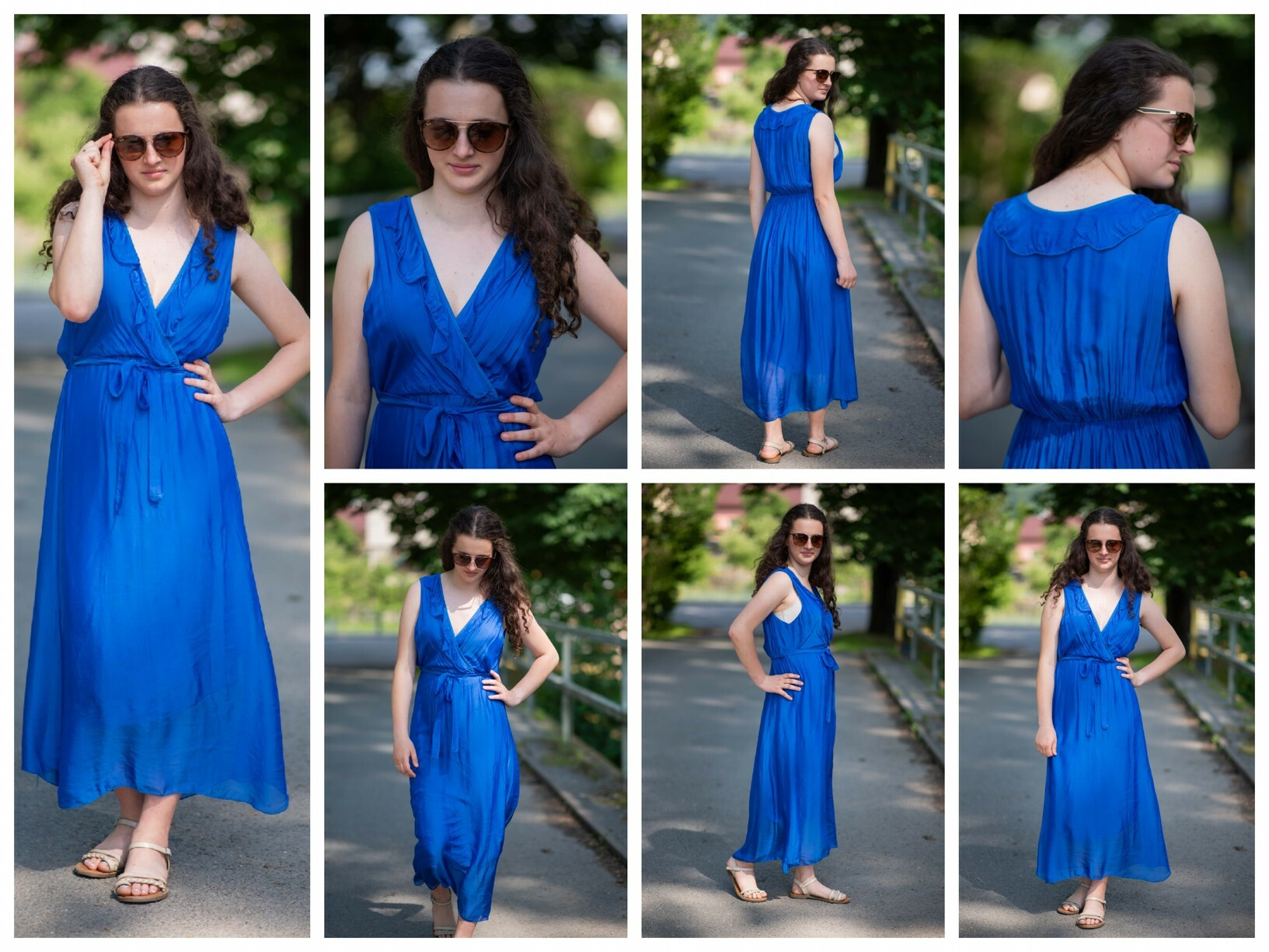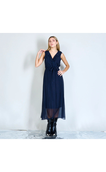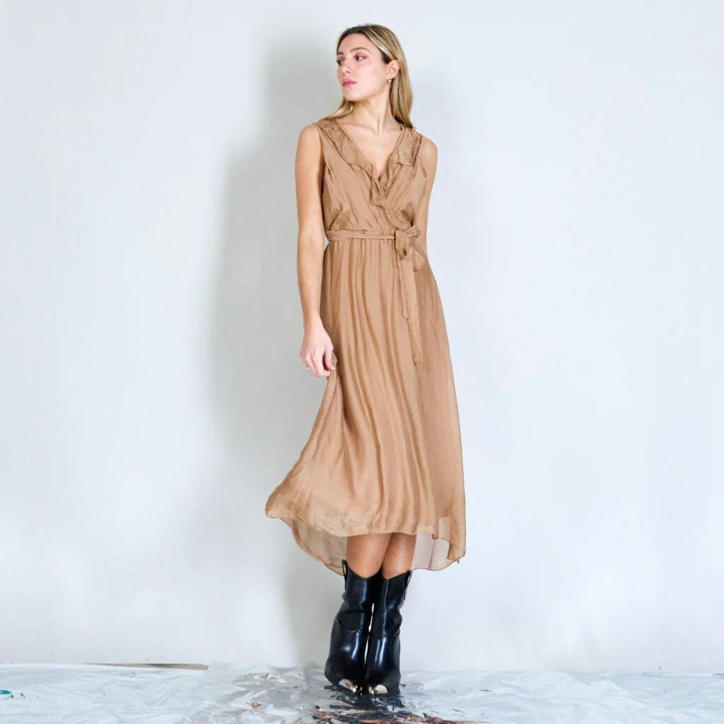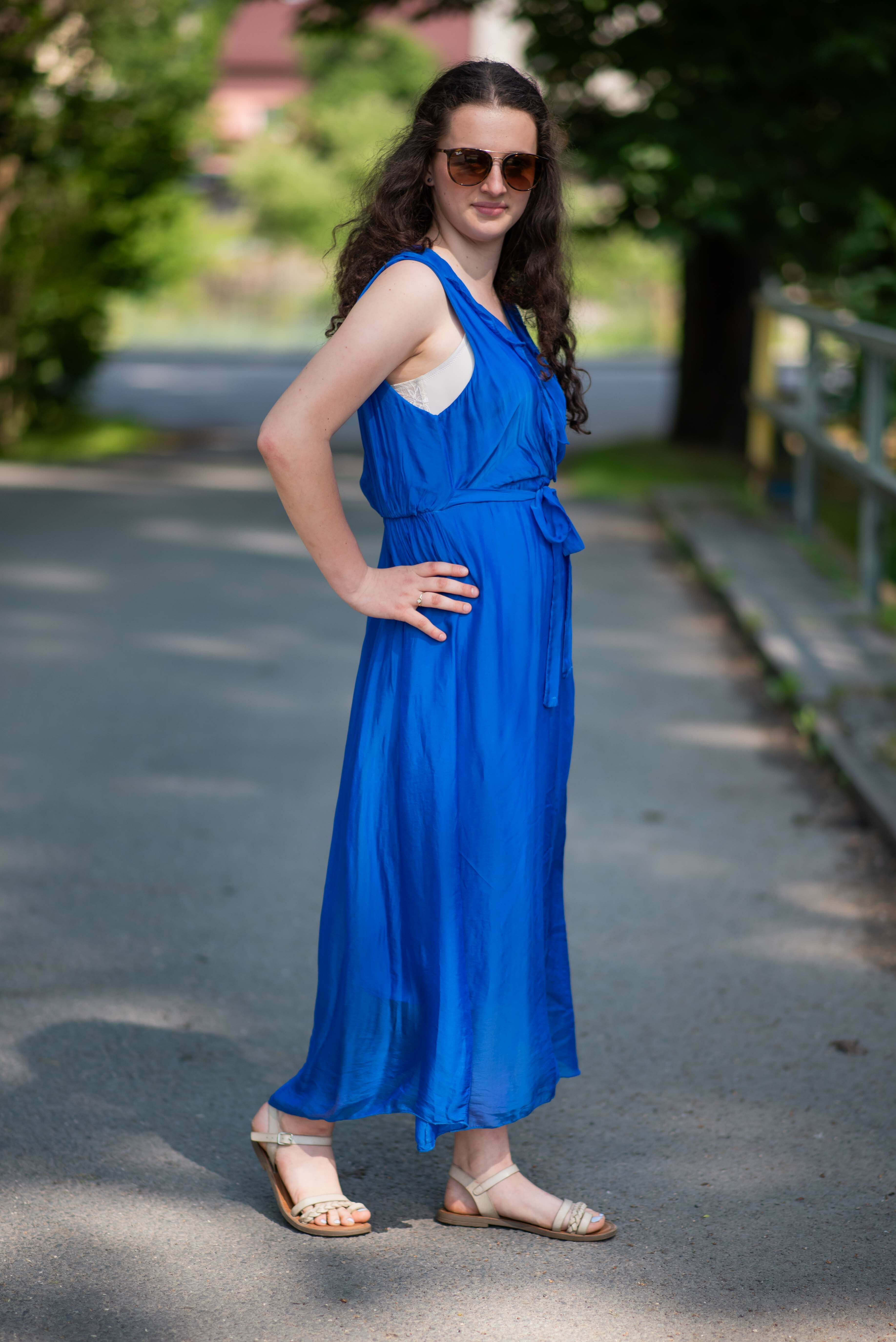 Letní dlouhé hedvábné šaty v pase na uvázání, šaty jsou s výstřihem do V, doplněny ozdobnými volánky v oblasti výstřihu. Lehounké vzdušné šaty s podšívkou ideální pro horké letní dny.