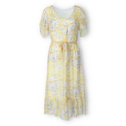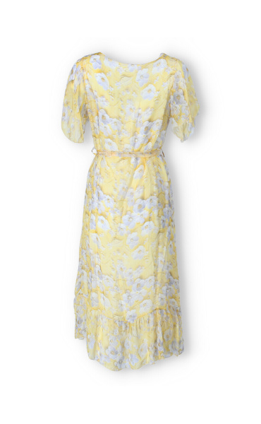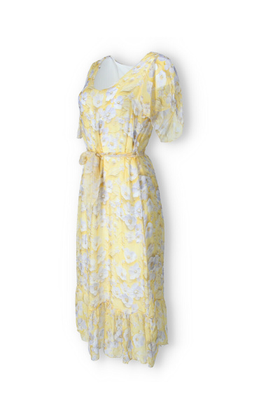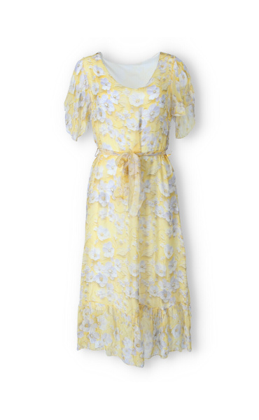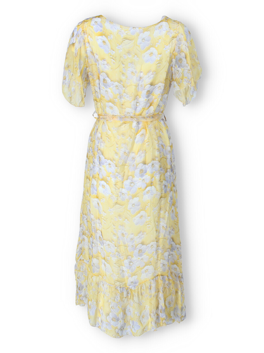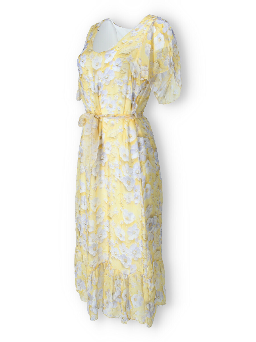 Elegantní dlouhé hedvábné šaty s krátkým rukávem, překládané přes prsa. Šaty mají aplikací květů, podšívku a v pase šňůrku na utažení.