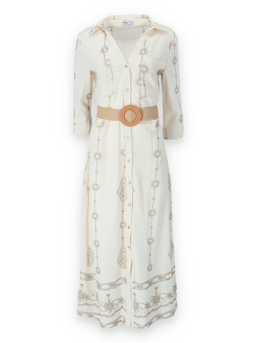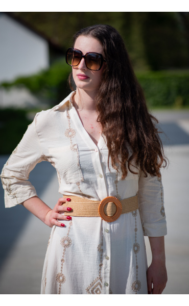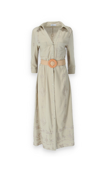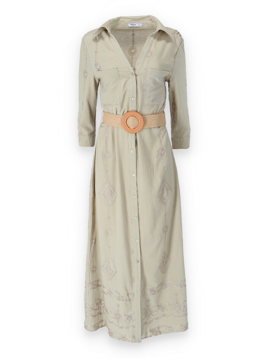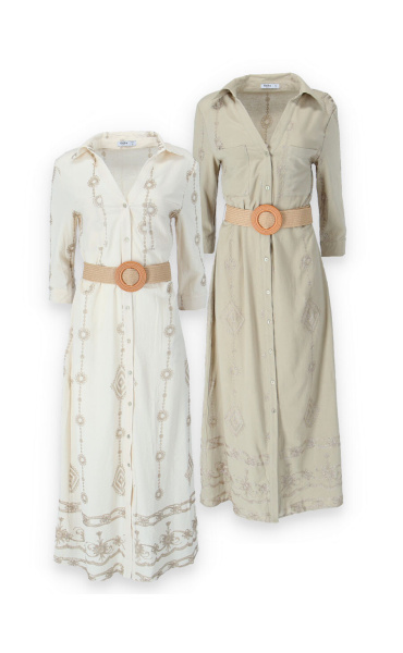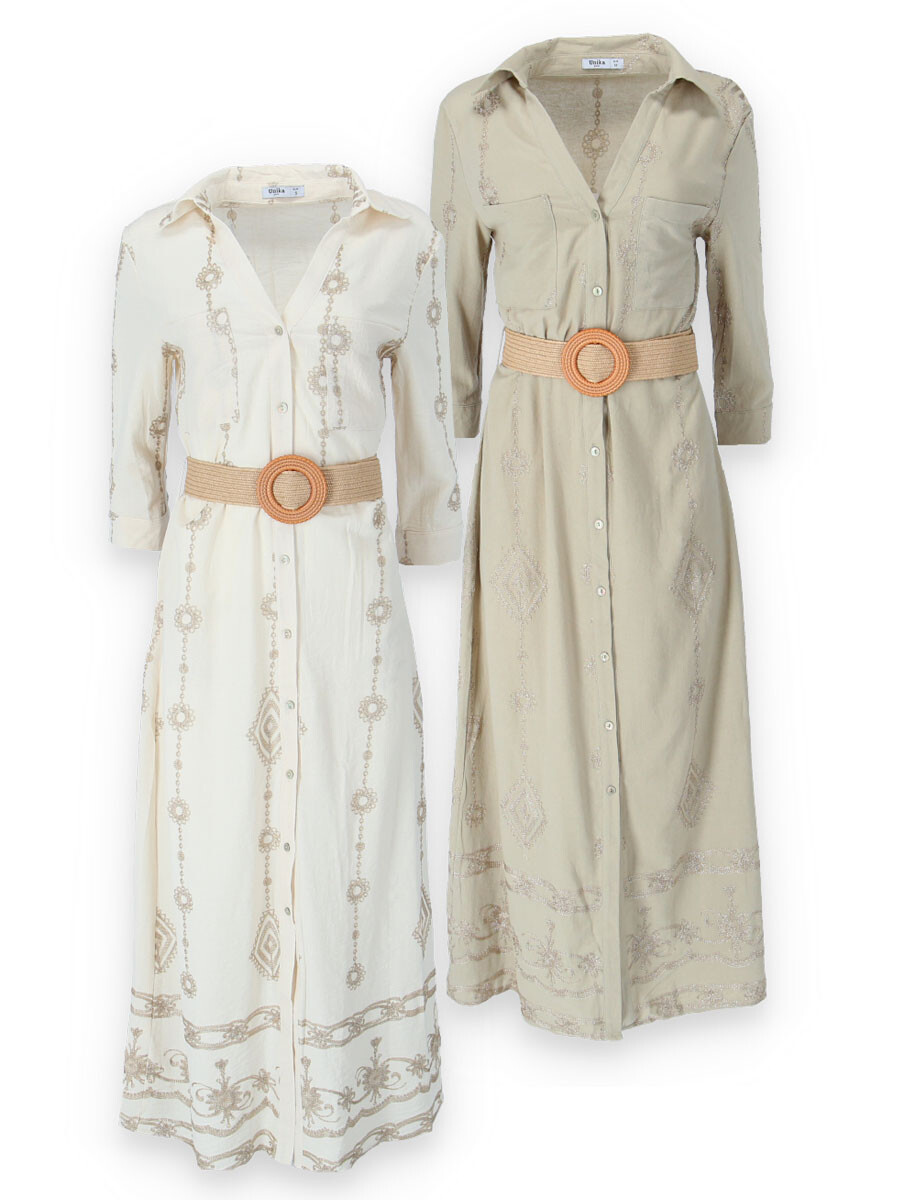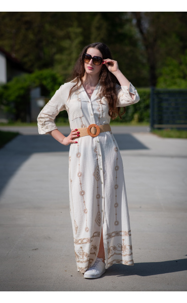 Dámské dlouhé košilové šaty s límečkem. Šaty jsou celo propínací, v oblasti hrudníku našité kapsy, mají 3/4 rukáv a jsou doplněny páskem.