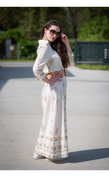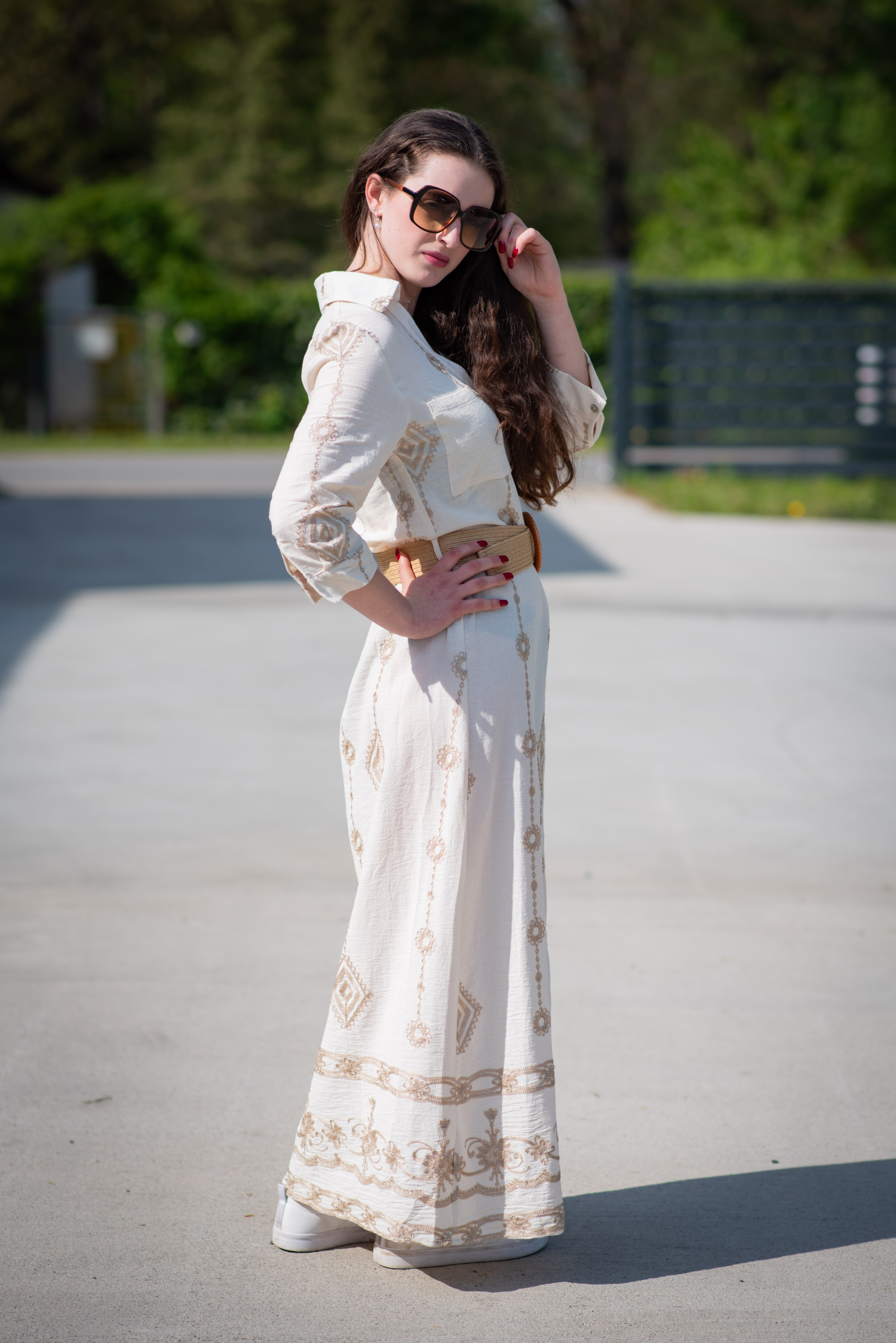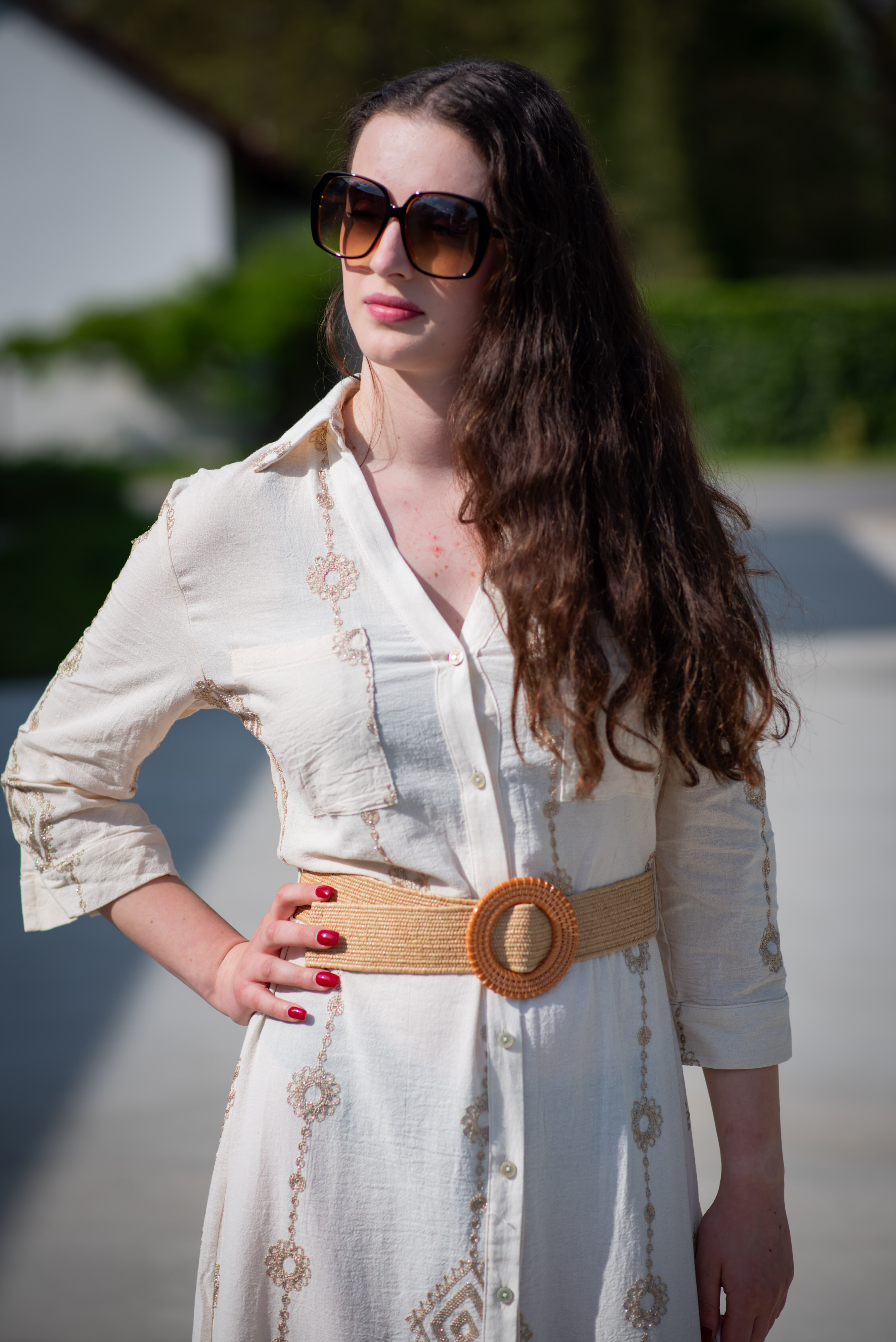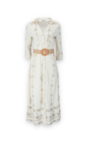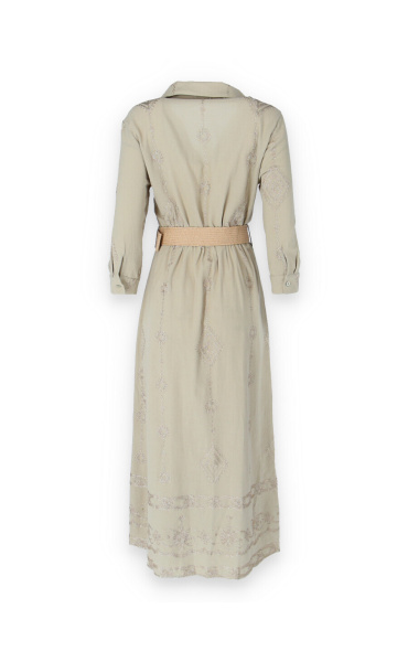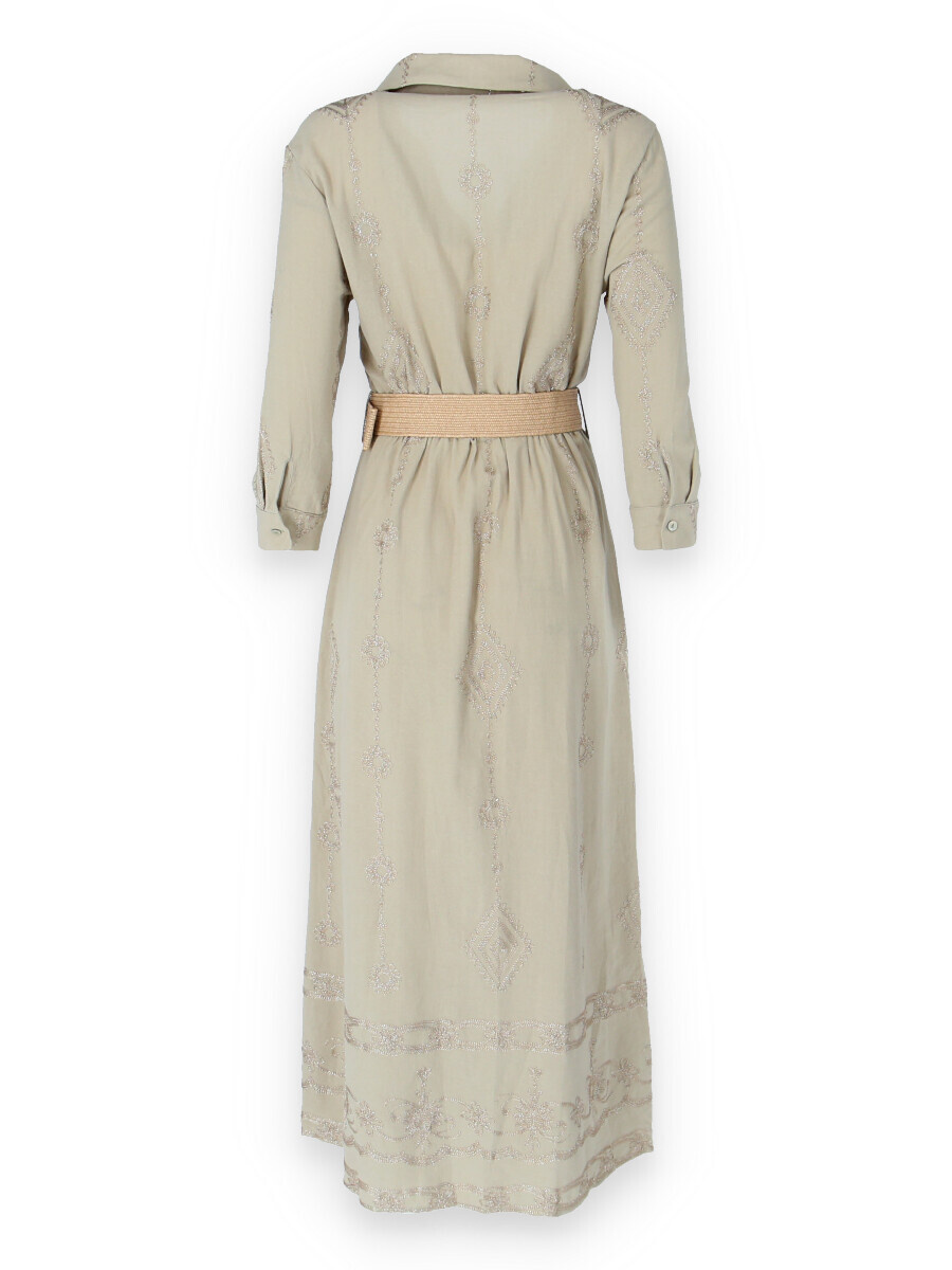 Dámské dlouhé košilové šaty s límečkem. Šaty jsou celo propínací, v oblasti hrudníku našité kapsy, mají 3/4 rukáv a jsou doplněny páskem.