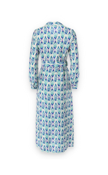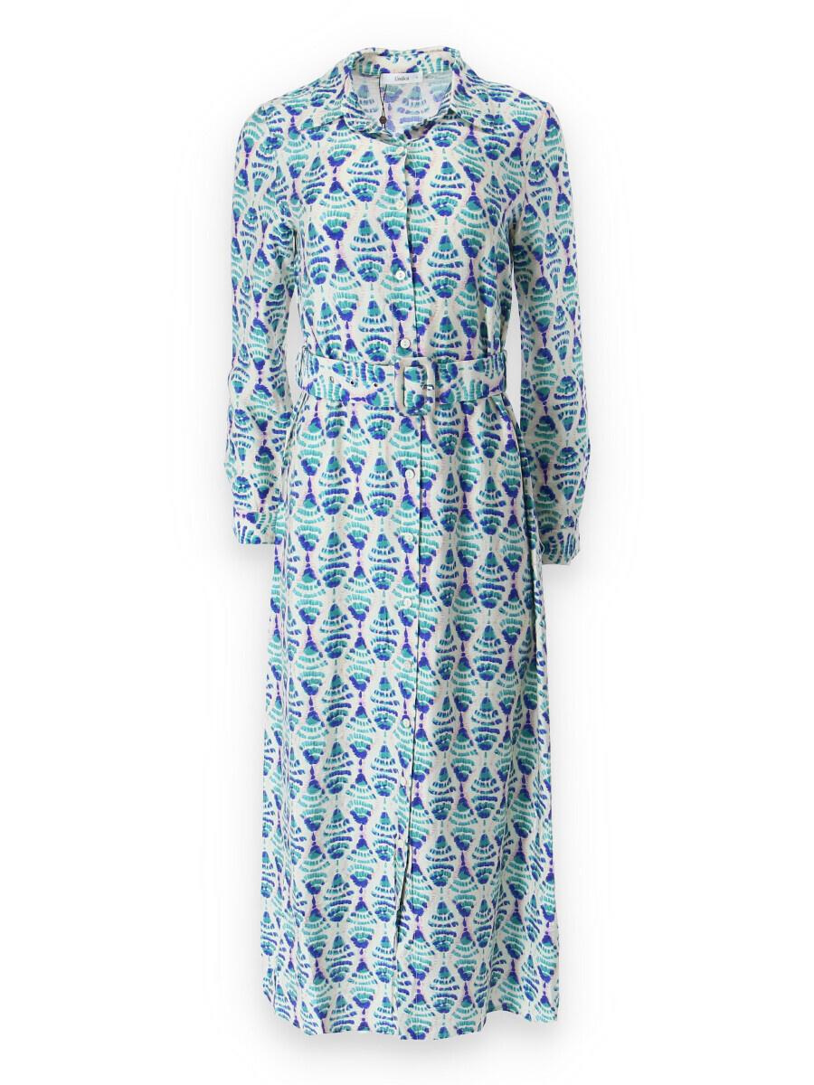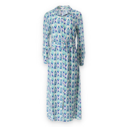 Dlouhé košilové šaty s potiskem. Šaty mají límeček, dlouhý rukáv, jsou celo propínací a doplněny páskem.