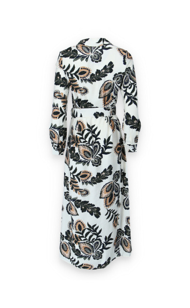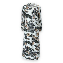 Dlouhé košilové šaty s potiskem. Šaty mají límeček, dlouhý rukáv, jsou celo propínací a doplněny páskem.
