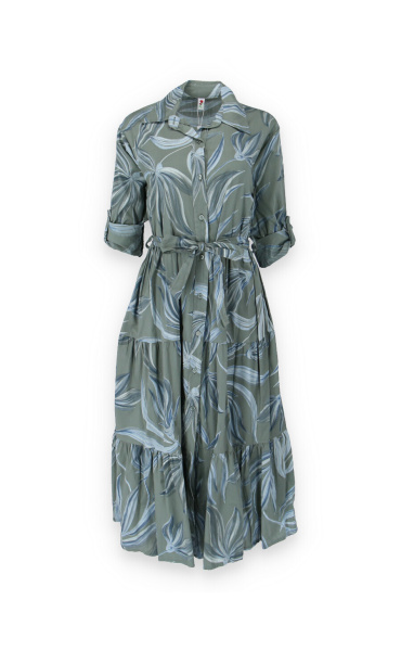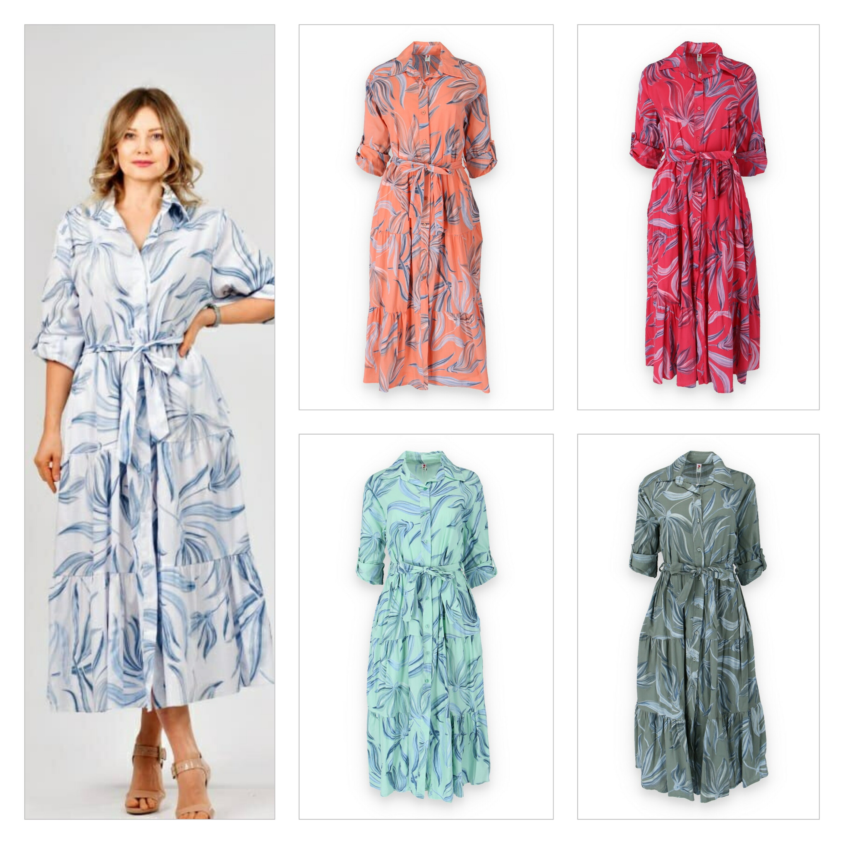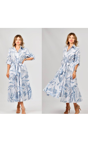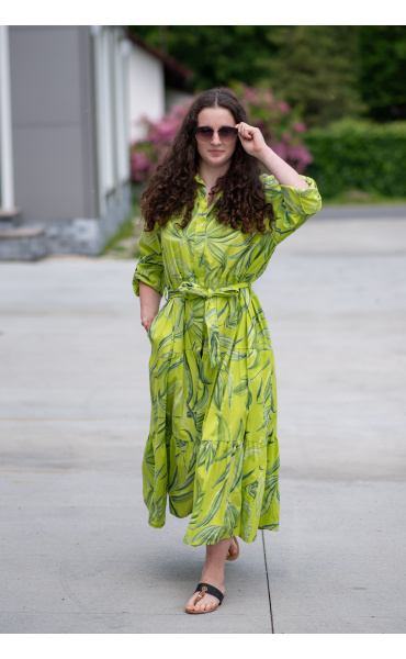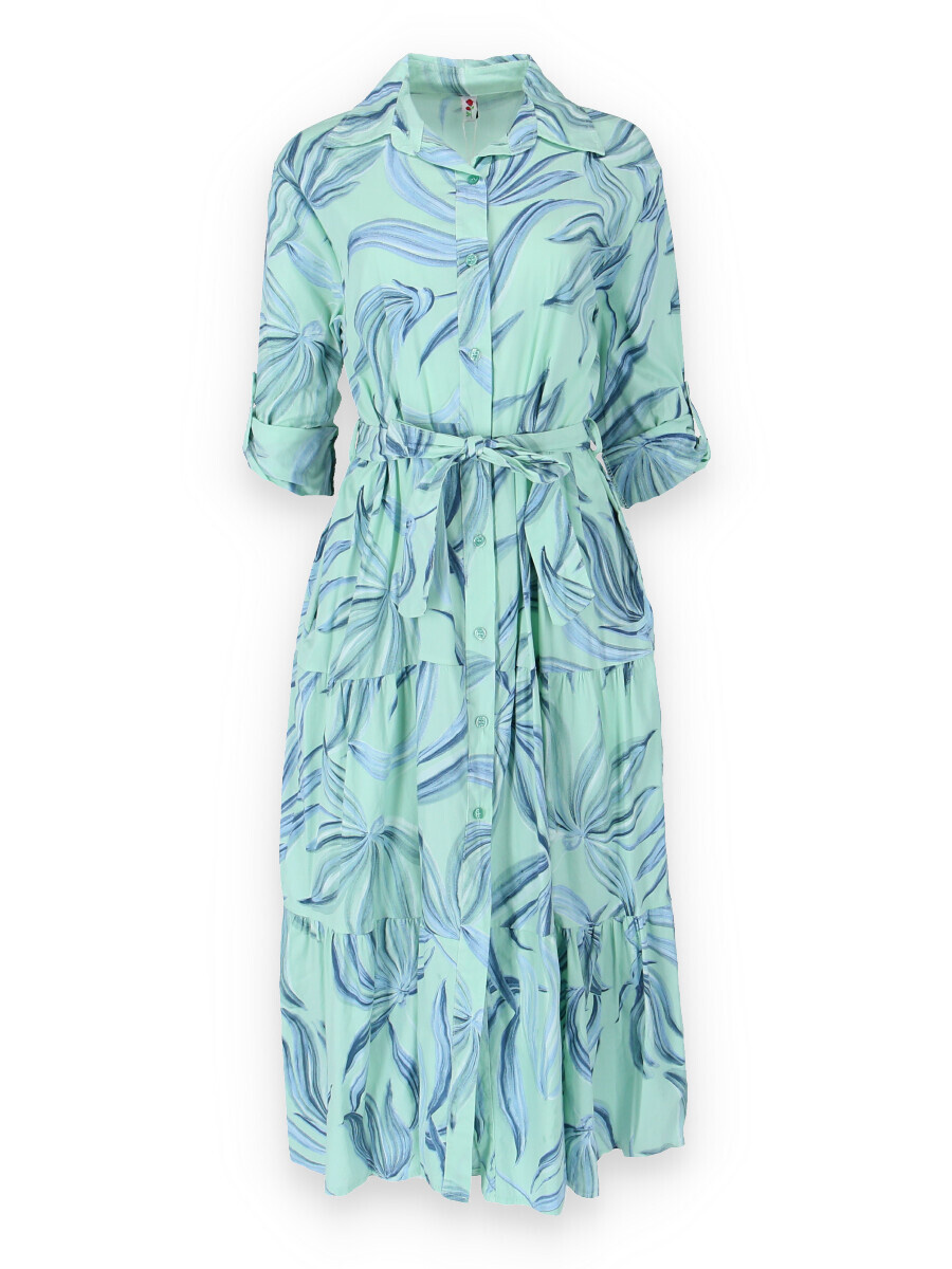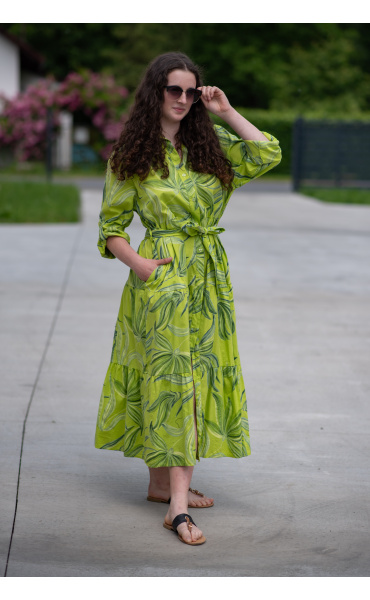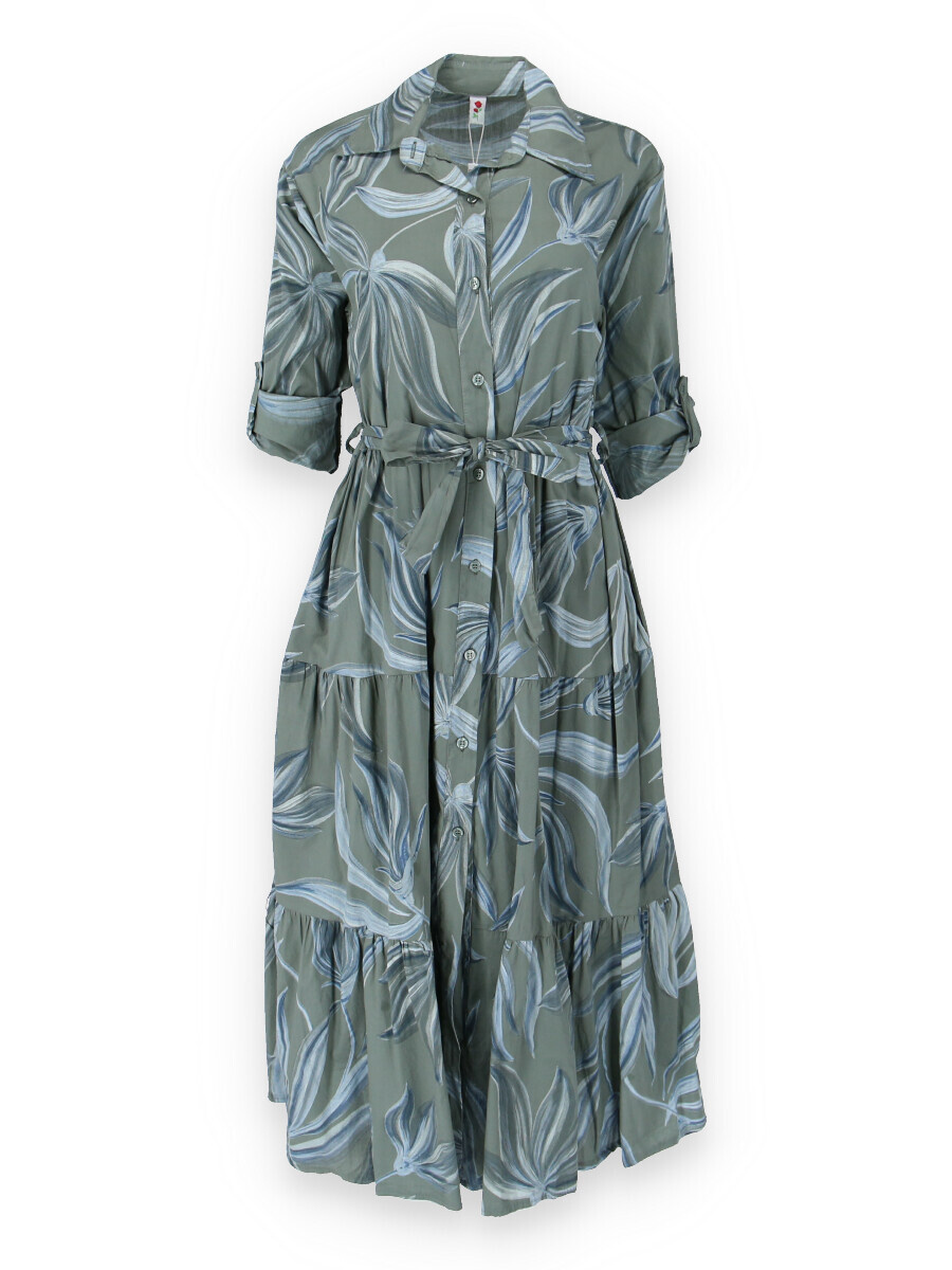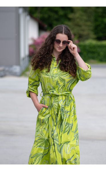 Dámské dlouhé košilové šaty s potiskem. Šaty mají límeček, doplněné páskem na stažení a regulací na knoflík na rukávu.
