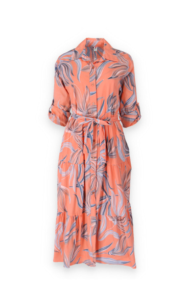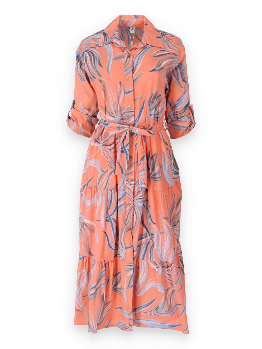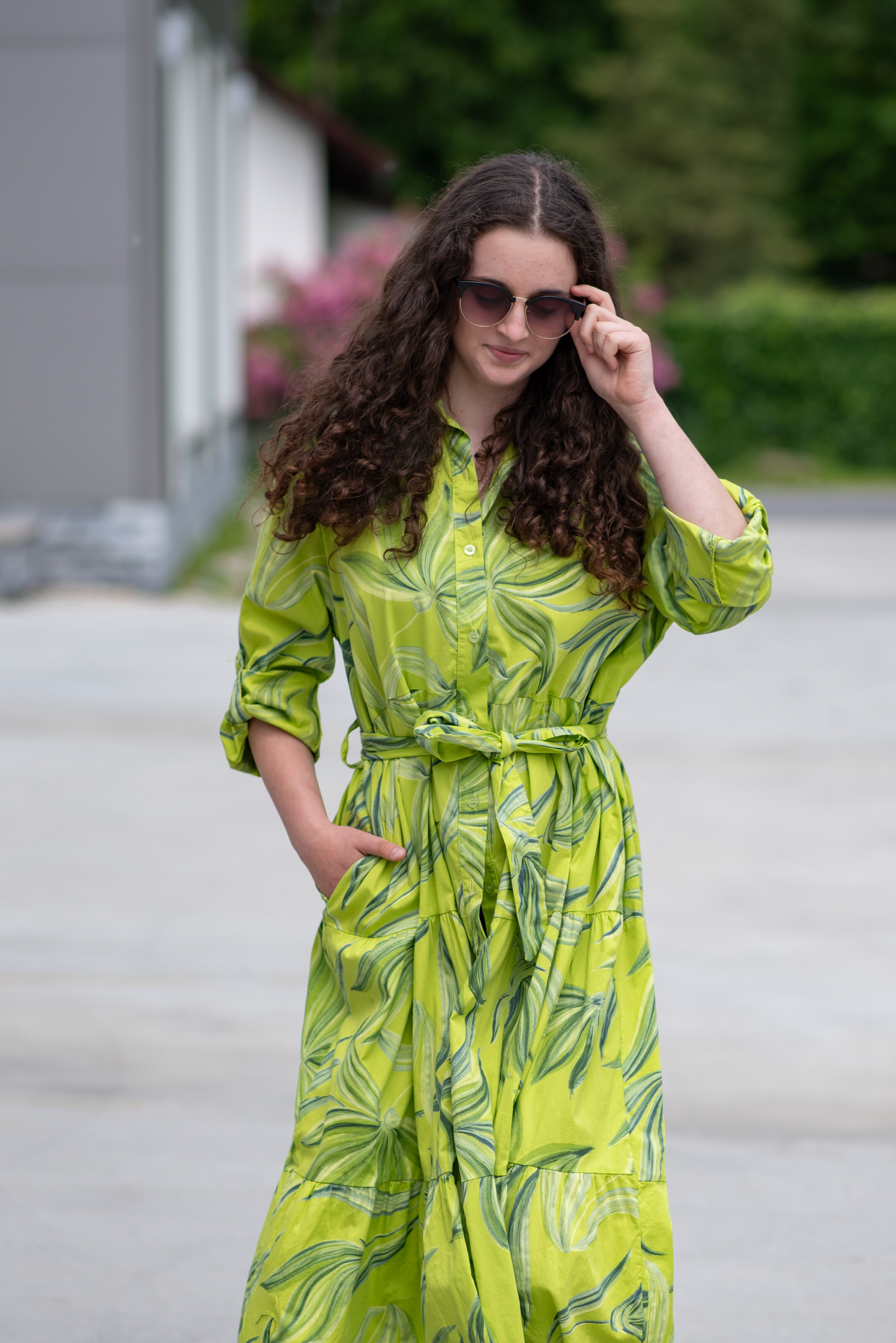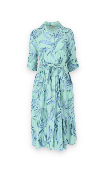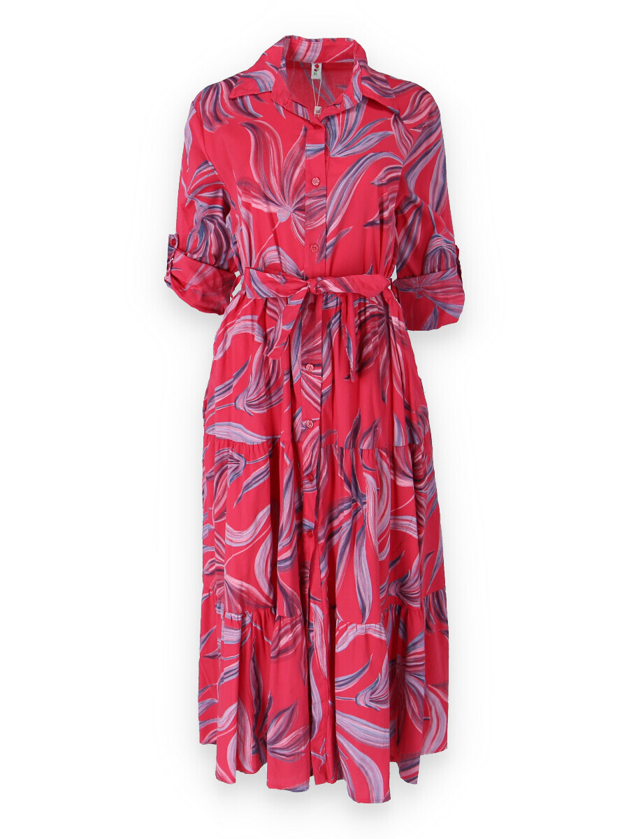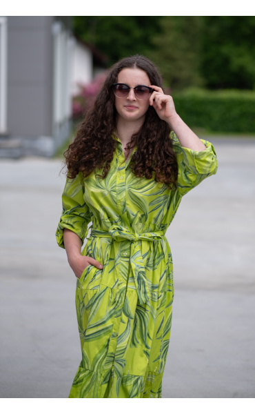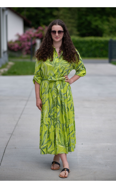 Dámské dlouhé košilové šaty s potiskem. Šaty mají límeček, doplněné páskem na stažení a regulací na knoflík na rukávu.