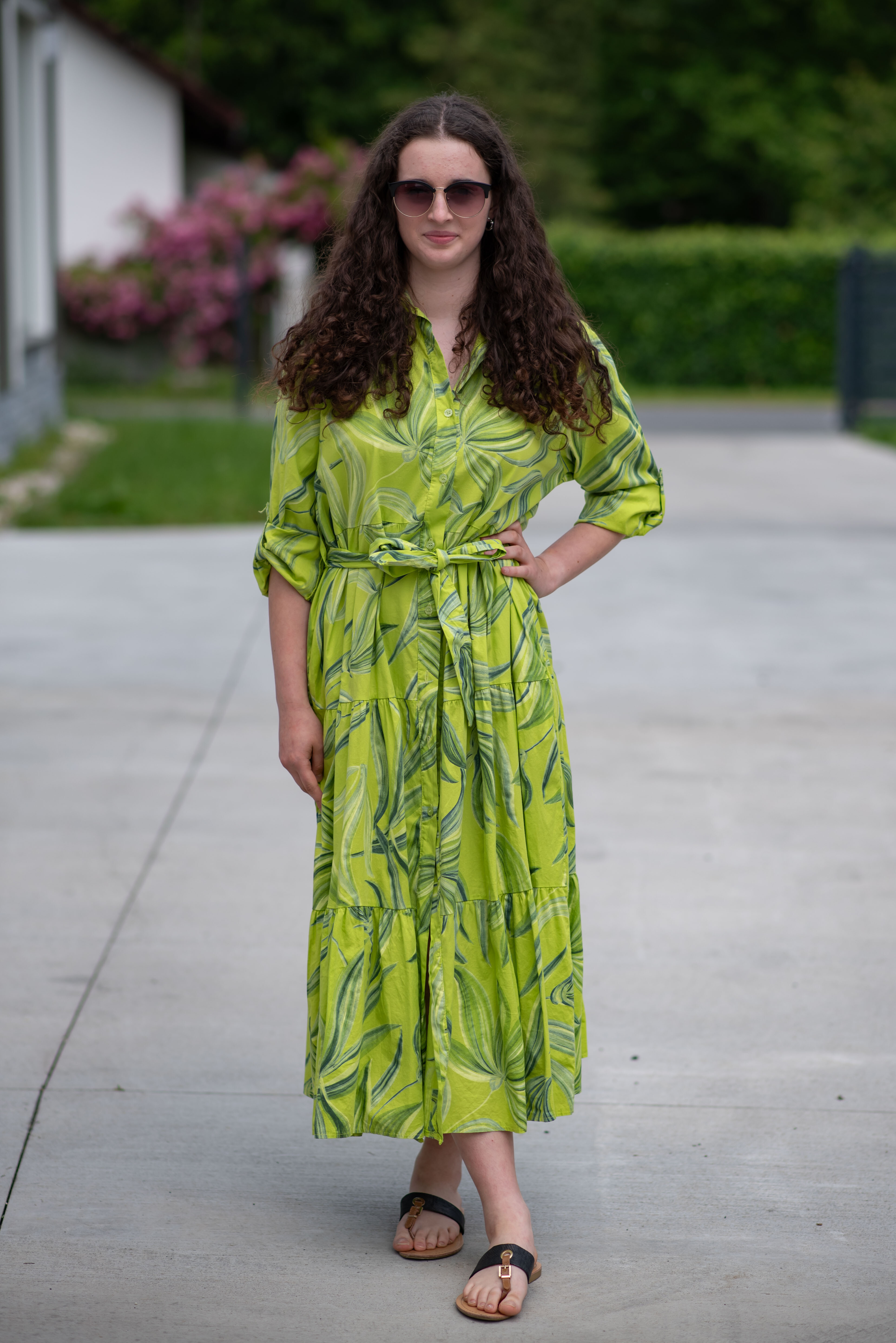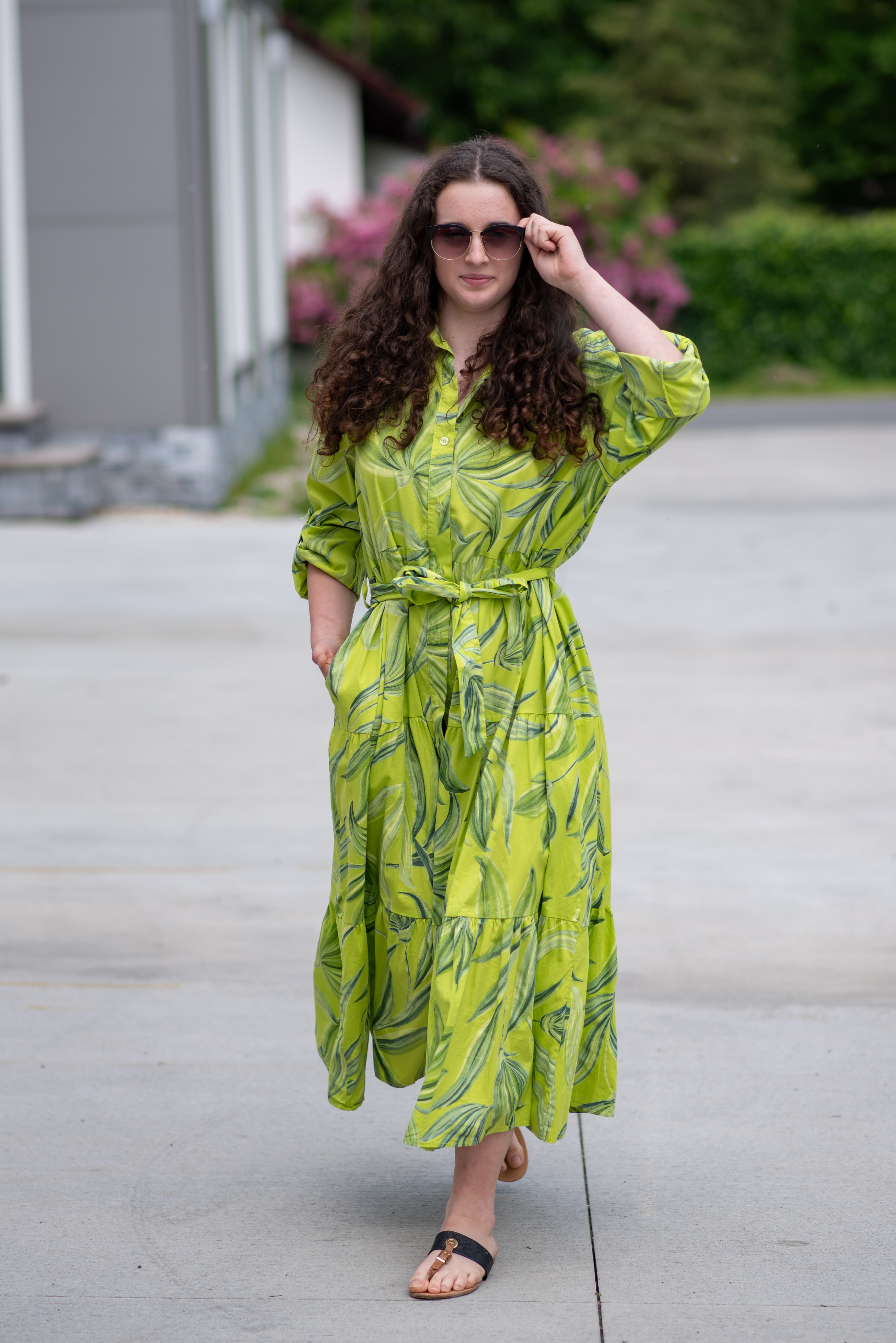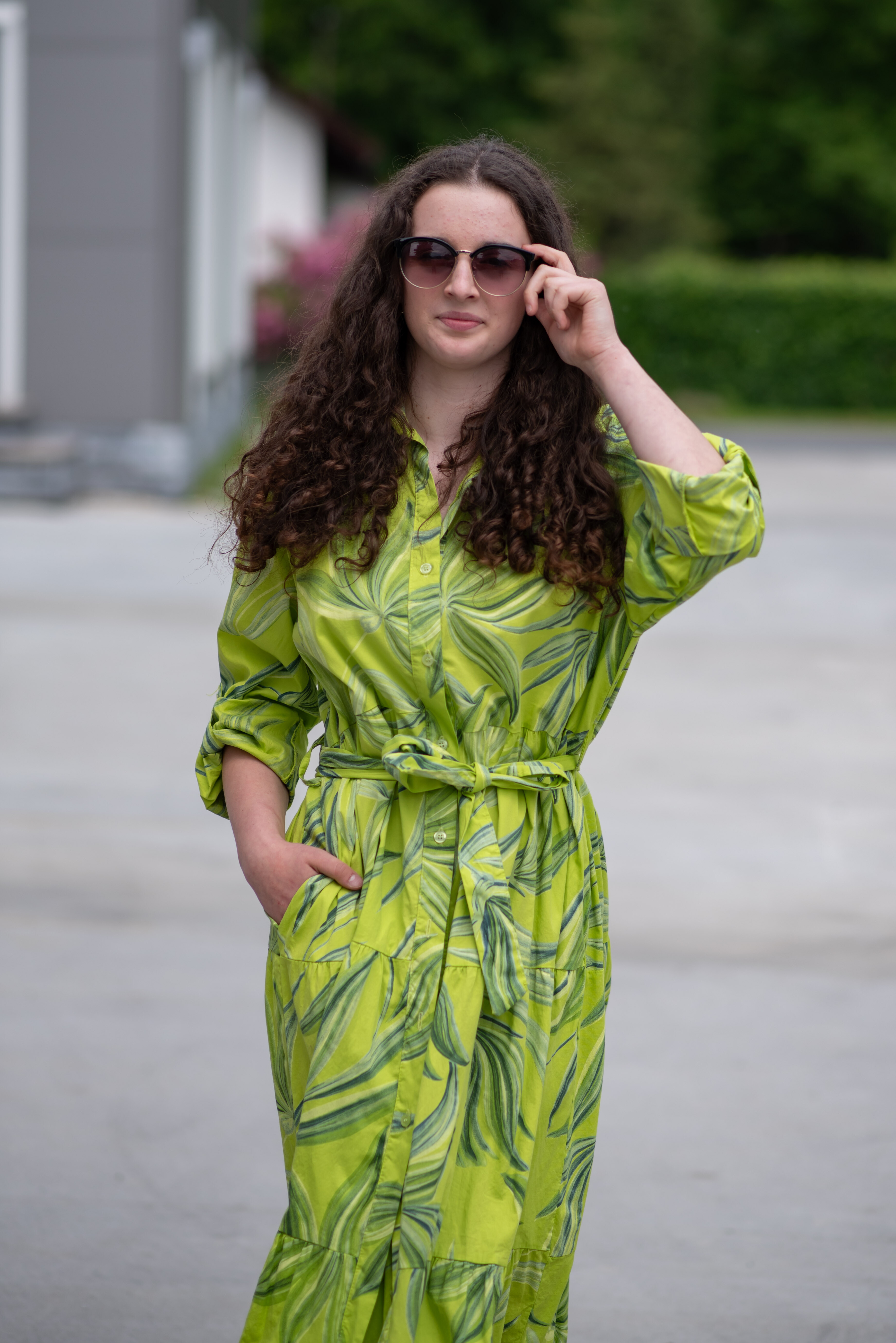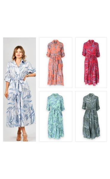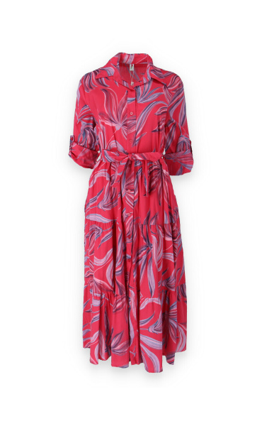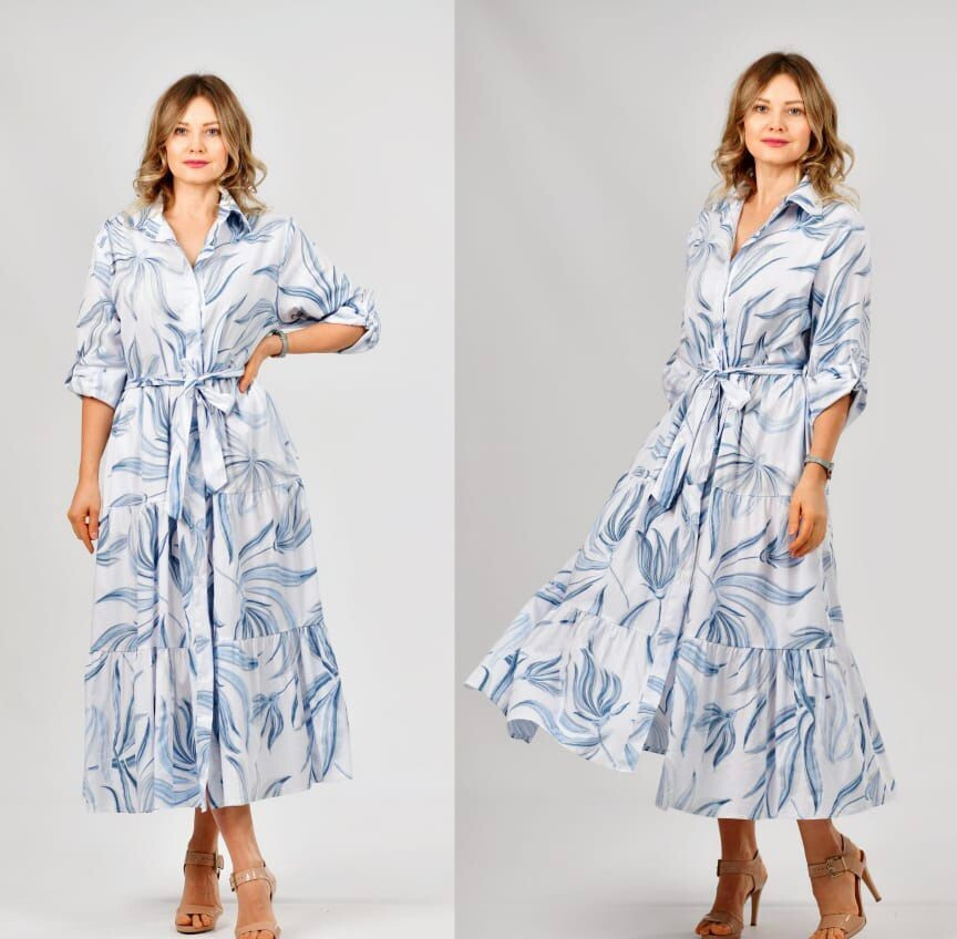 Dámské dlouhé košilové šaty s potiskem. Šaty mají límeček, doplněné páskem na stažení a regulací na knoflík na rukávu.