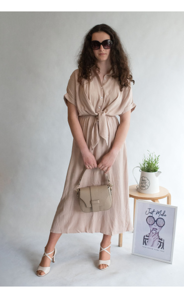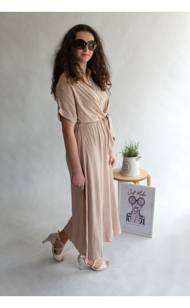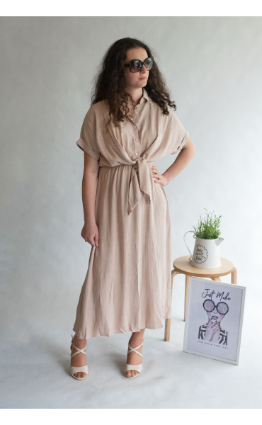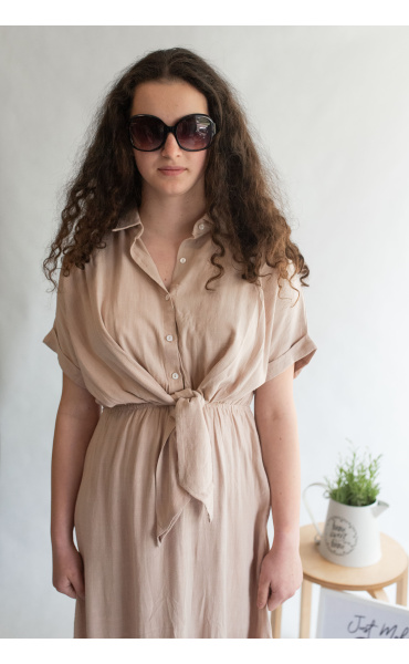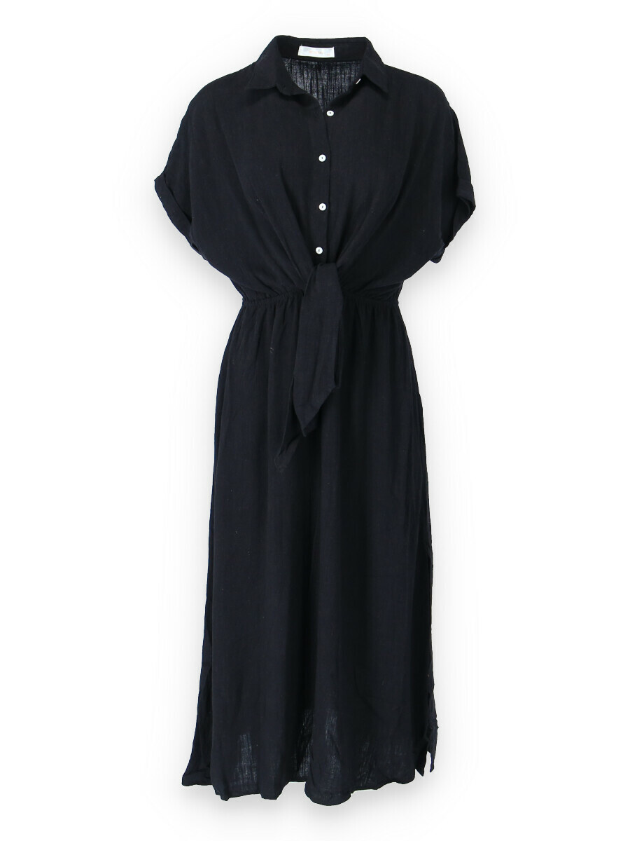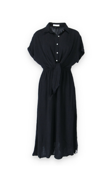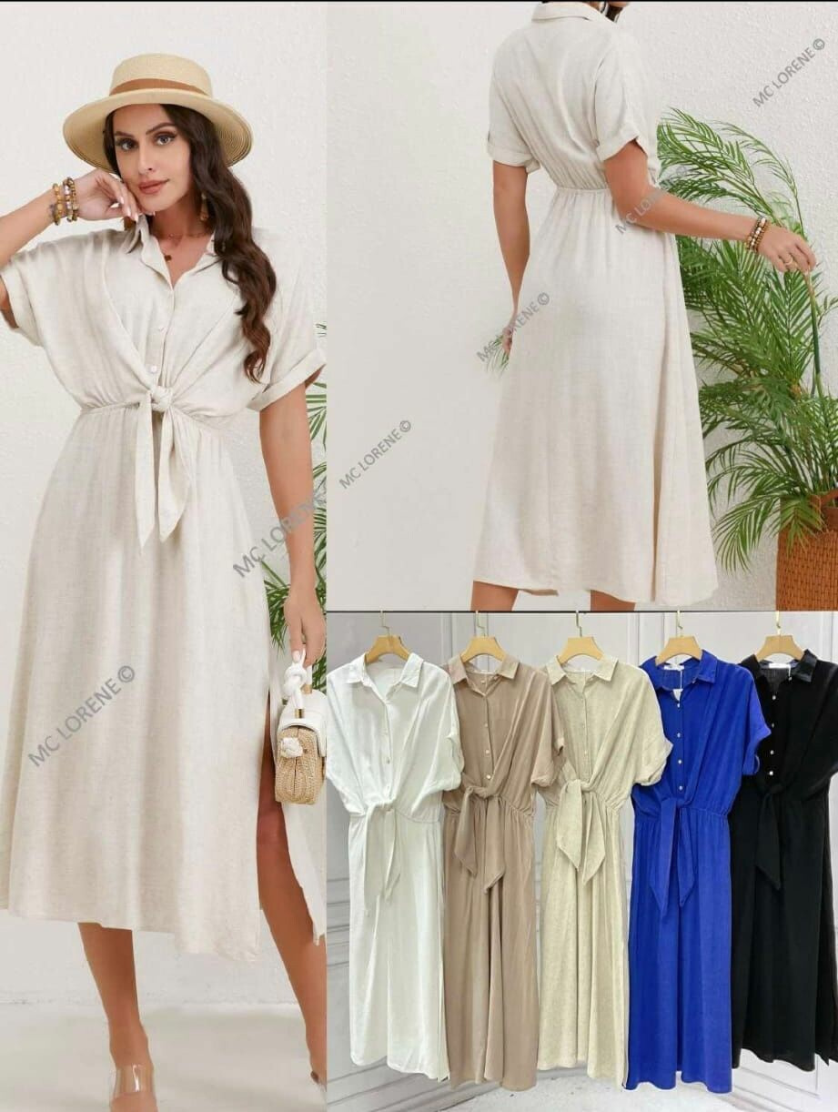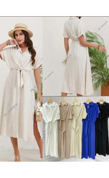 Dlouhé elegantní lněné šaty s límečkem. Ve vrchní části na knoflíky, v pase řešeno rafinovaným uzlíkem.