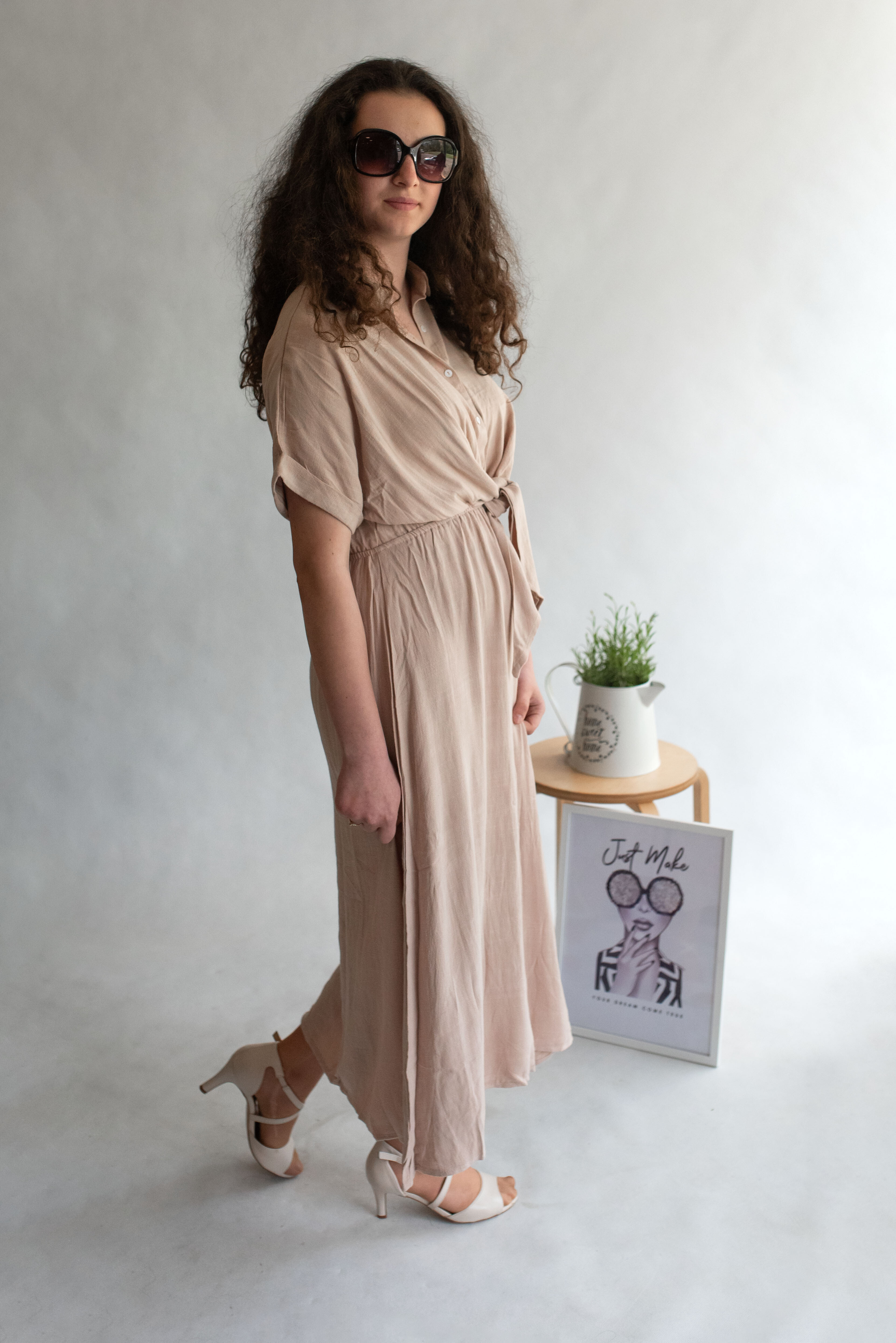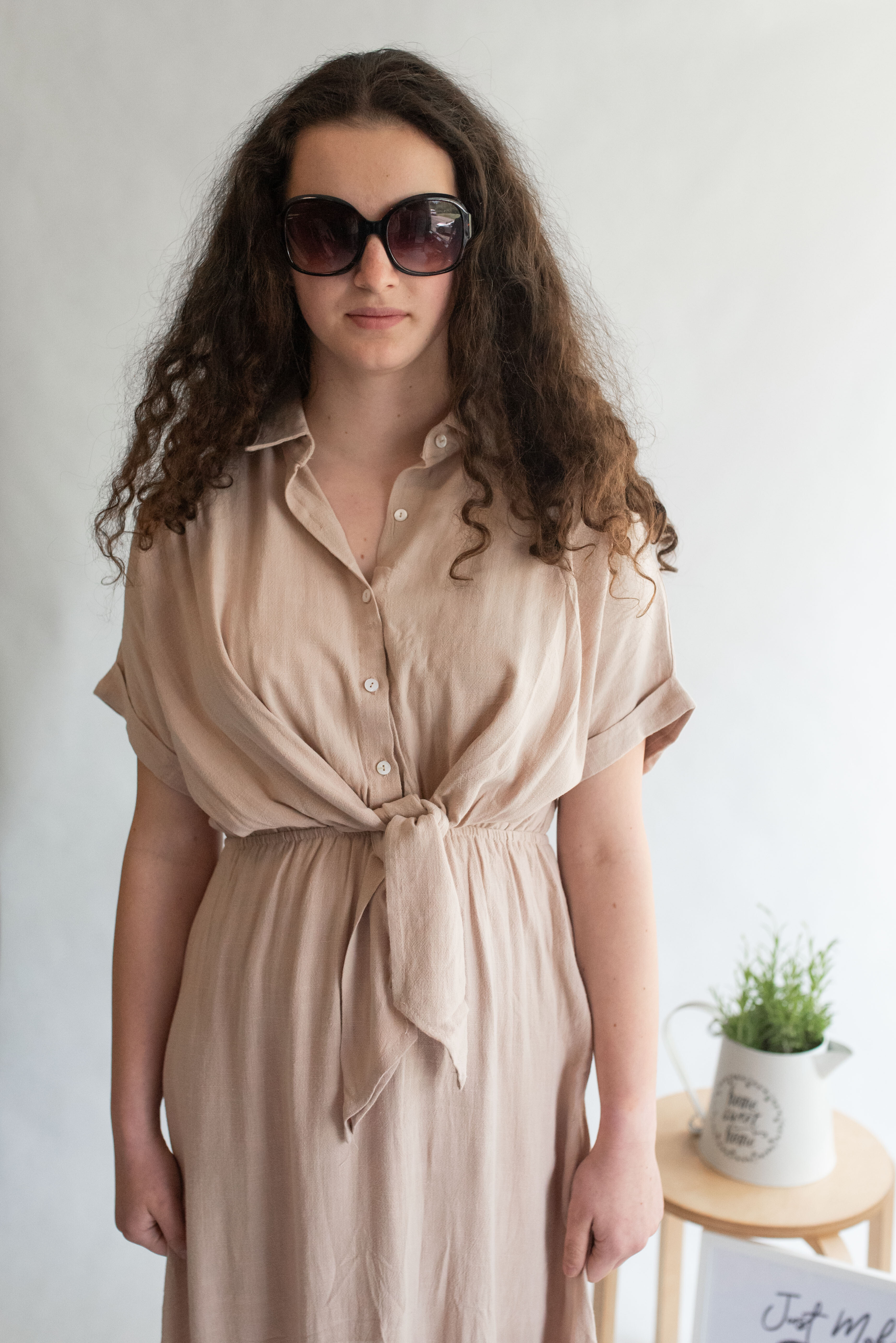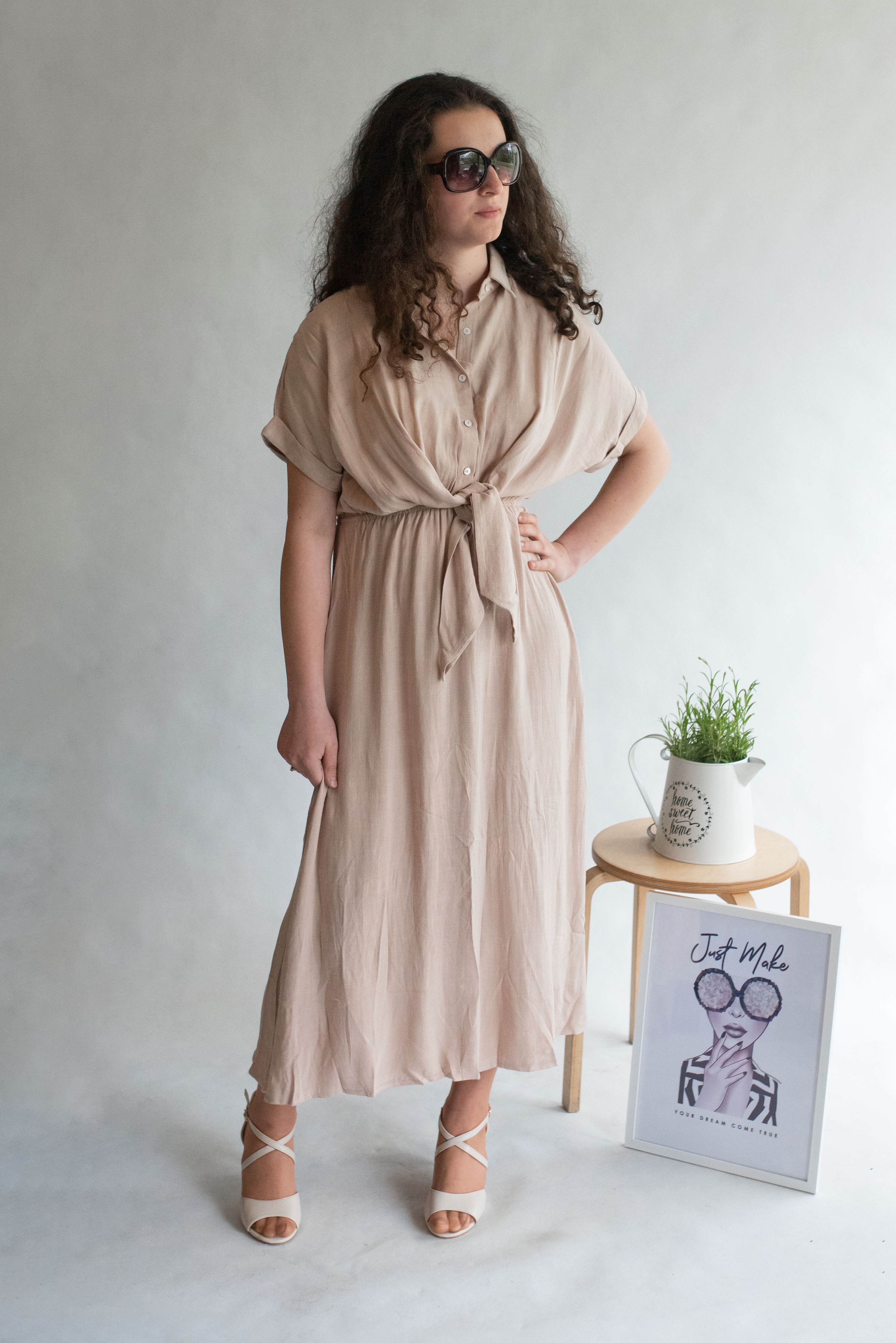 Dlouhé elegantní lněné šaty s límečkem. Ve vrchní části na knoflíky, v pase řešeno rafinovaným uzlíkem.