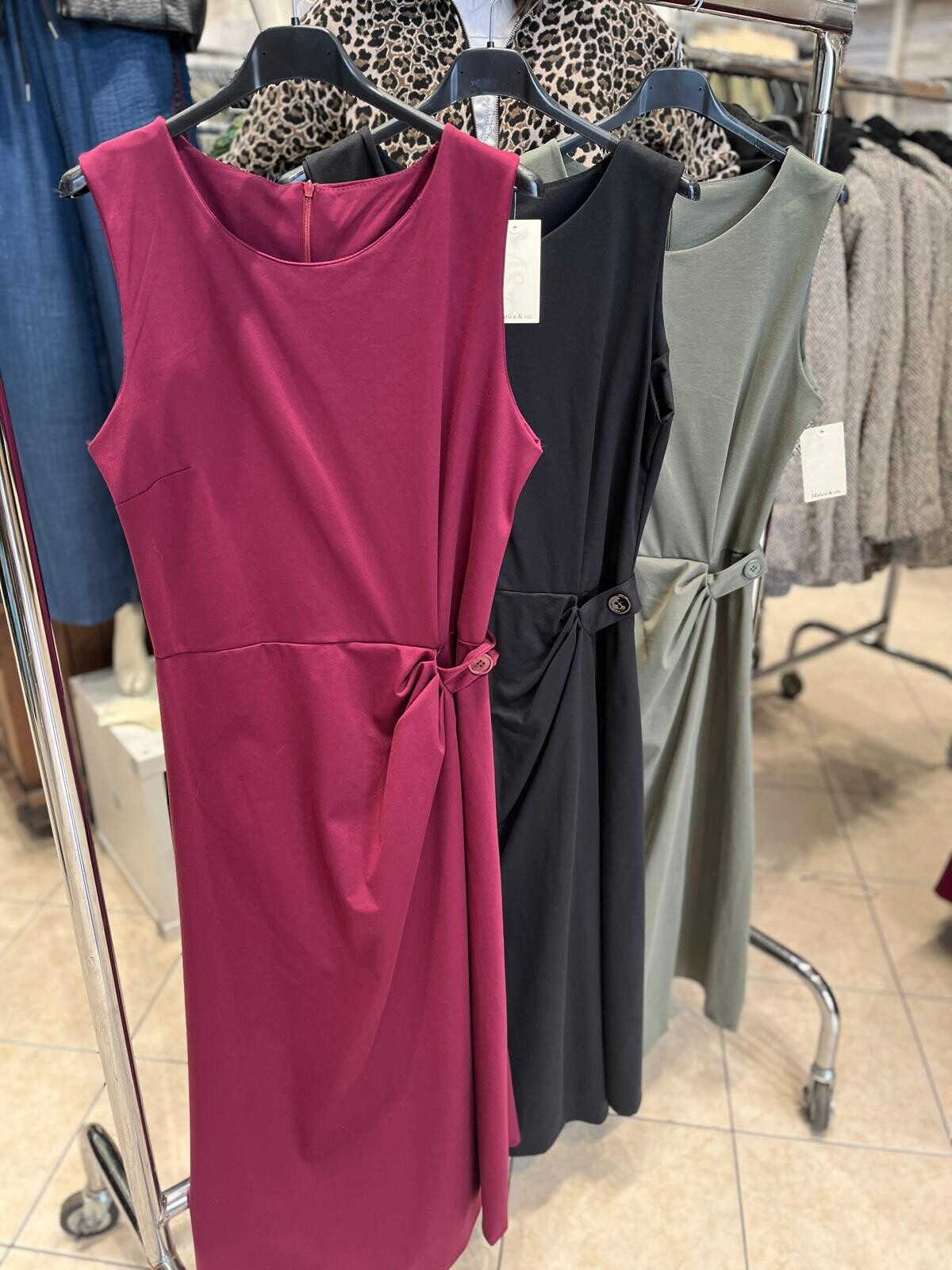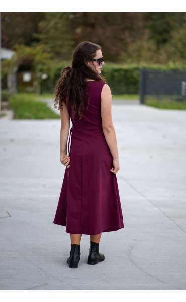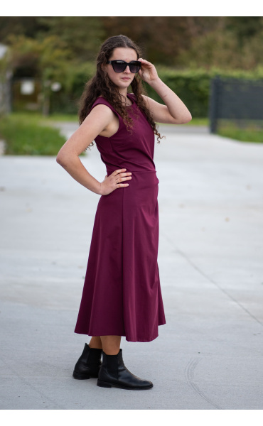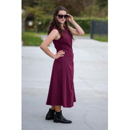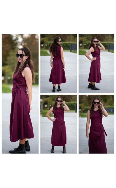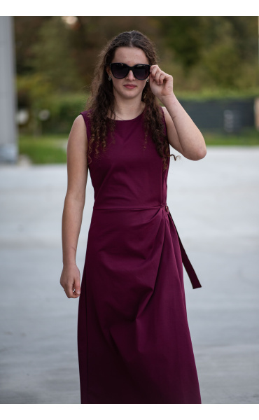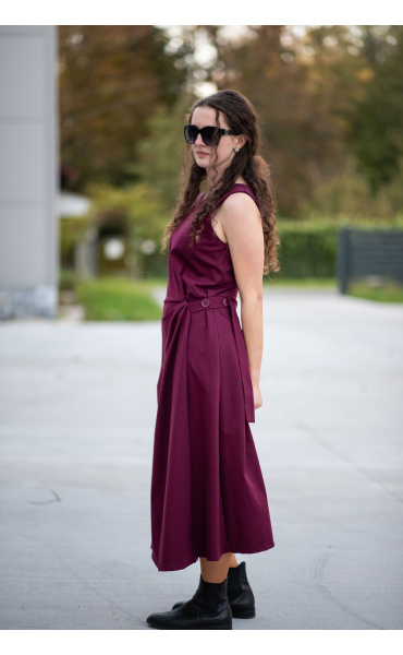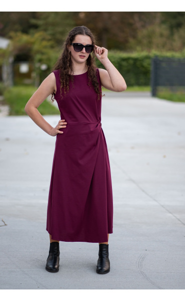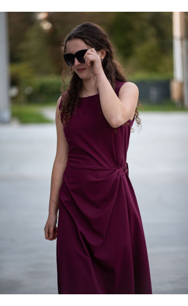 Elegantní šaty dlouhé bez rukávu a s kulatým výstřihem. Šaty jsou na zadní straně na zip a v oblasti pasu mají regulaci na knoflík.
