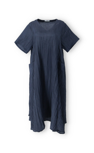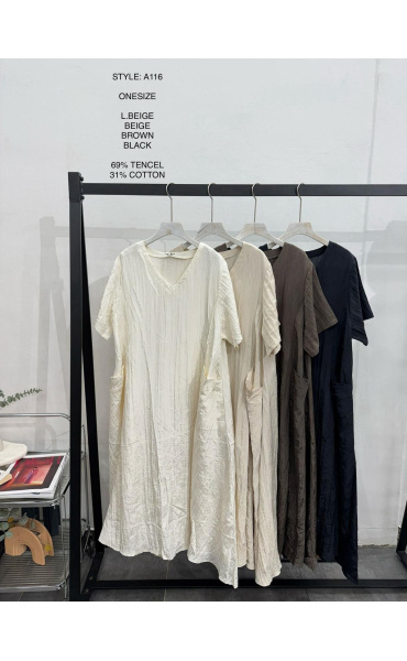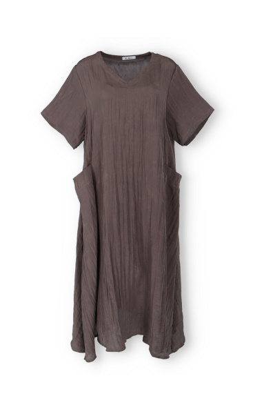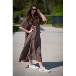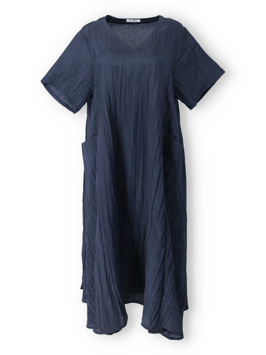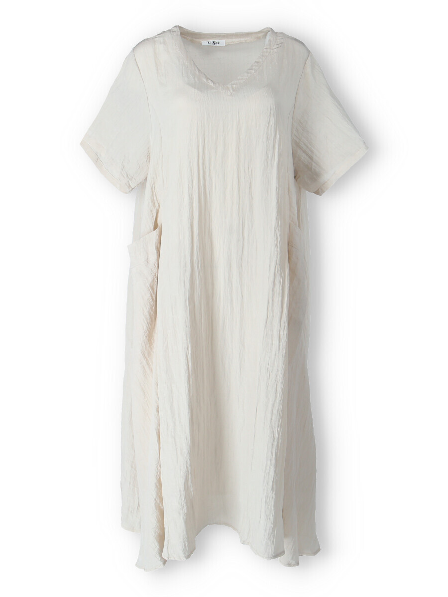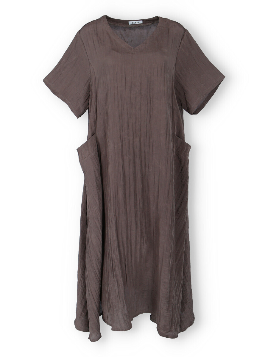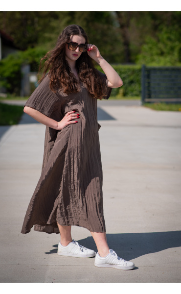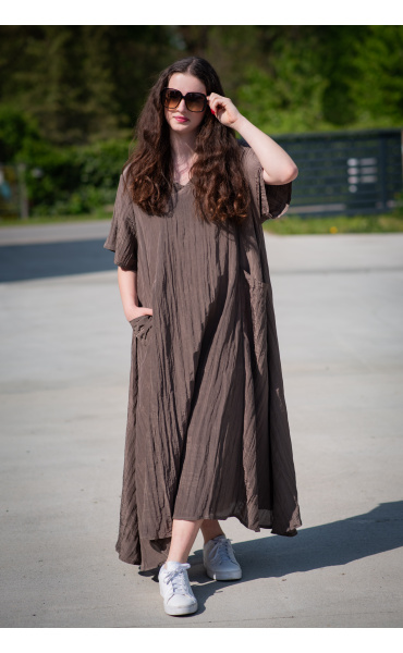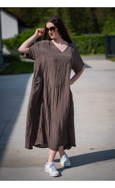 Dámské dlouhé šaty s našitými kapsami na přední straně, šaty jsou z velice příjemného materiálu, trendy krčený materiál. Šaty mají krátký rukáv a véčkový výstřih.