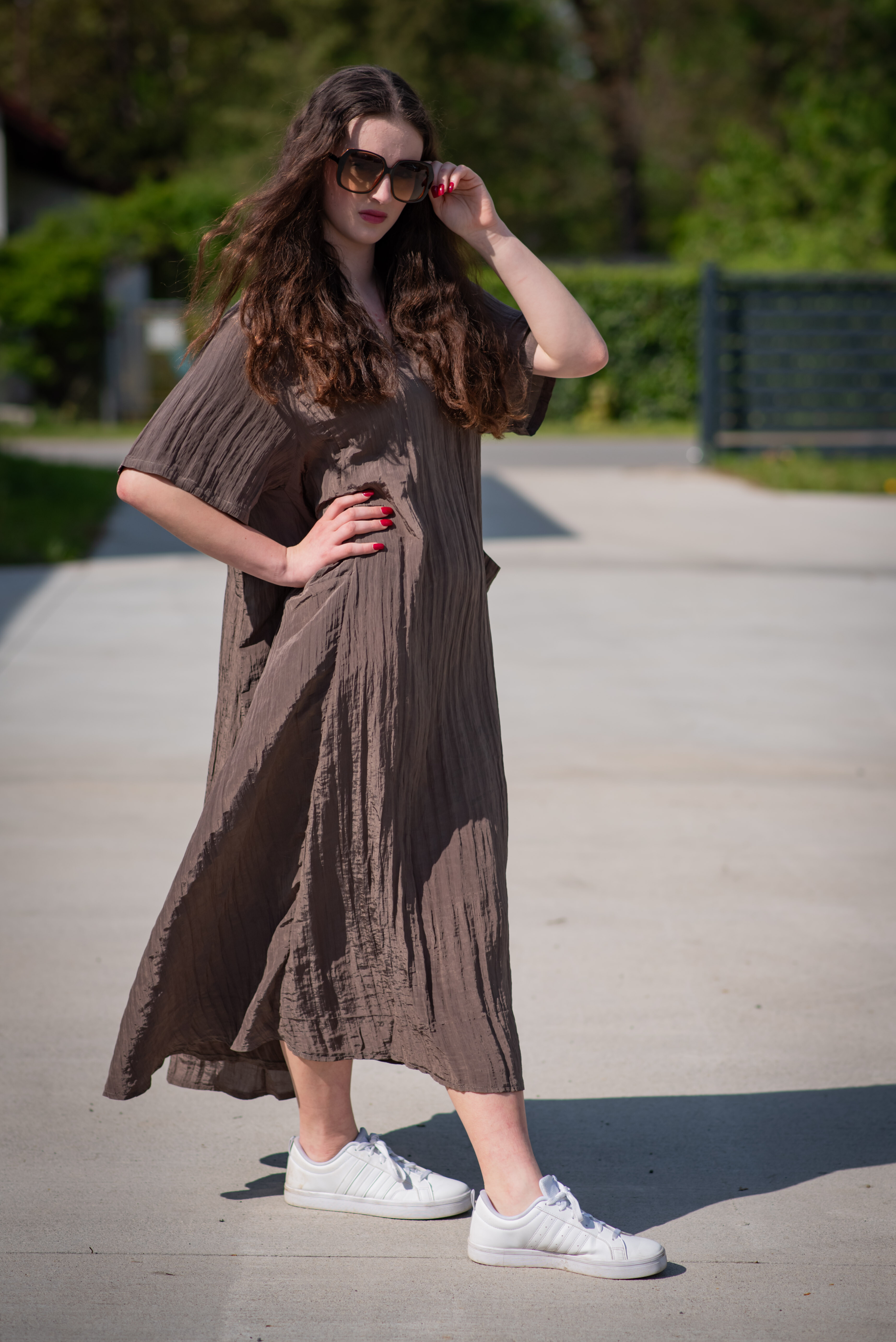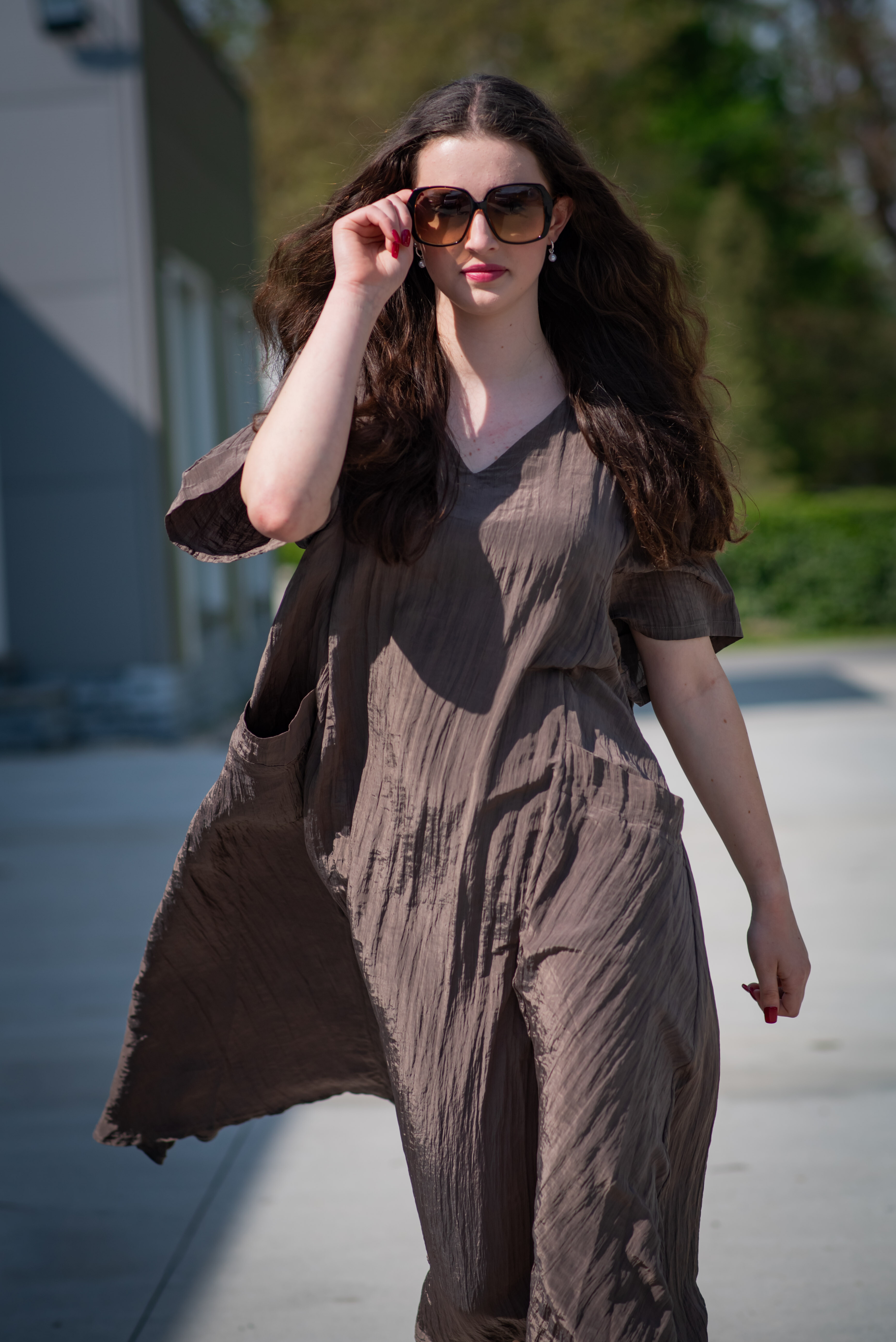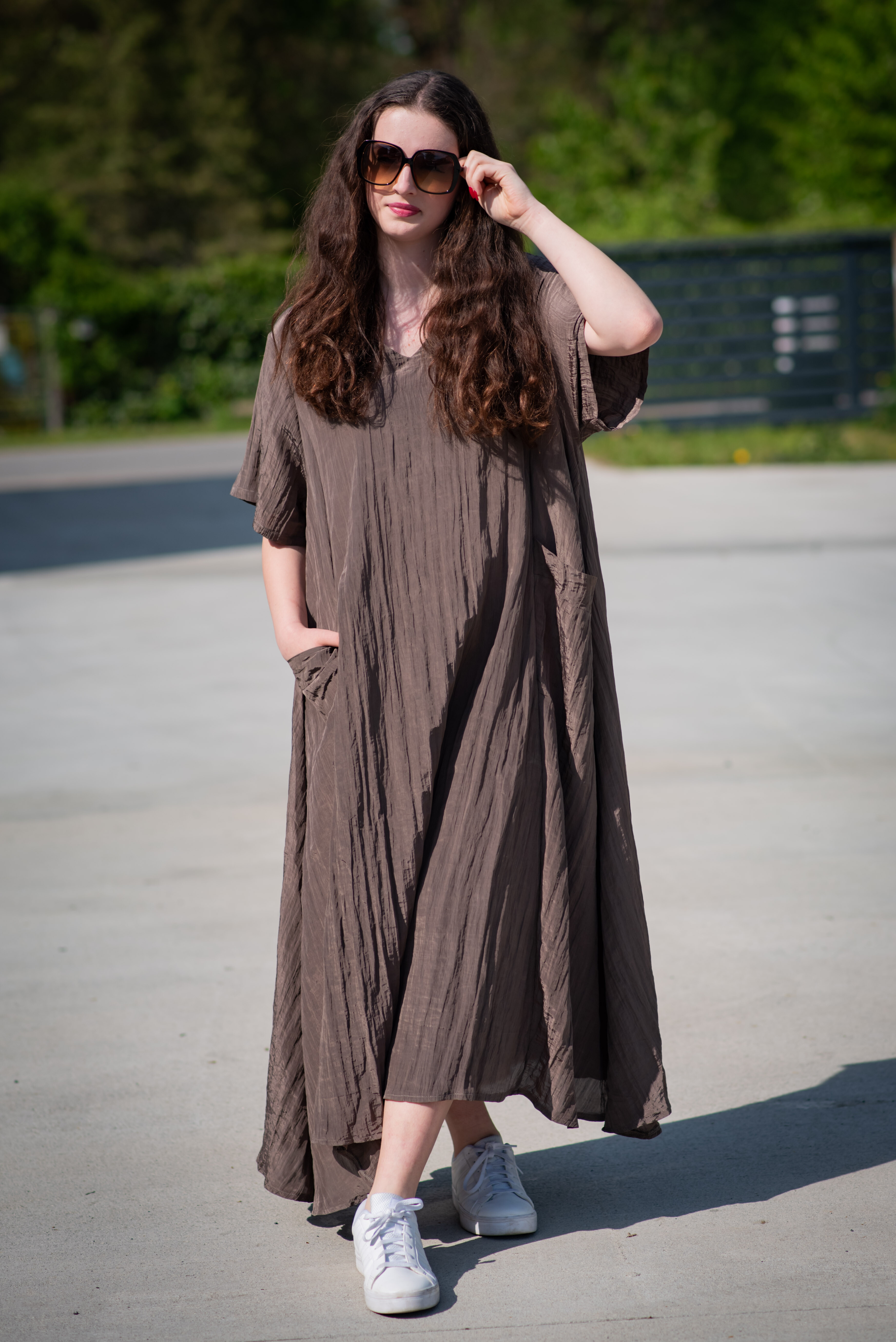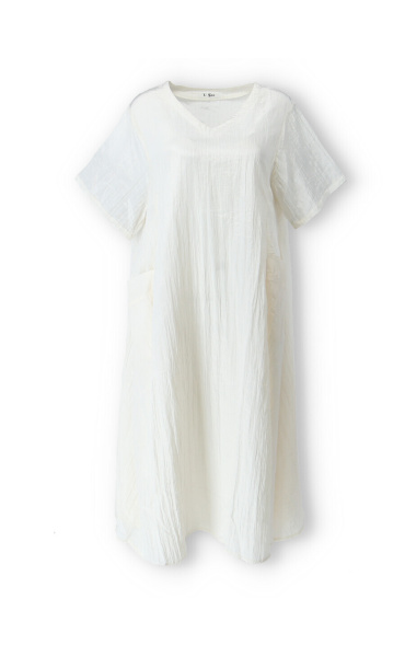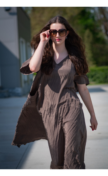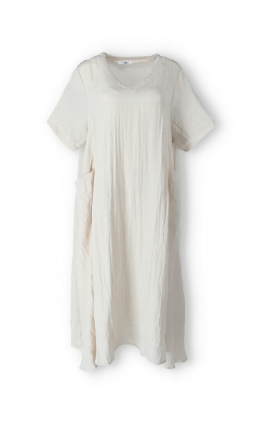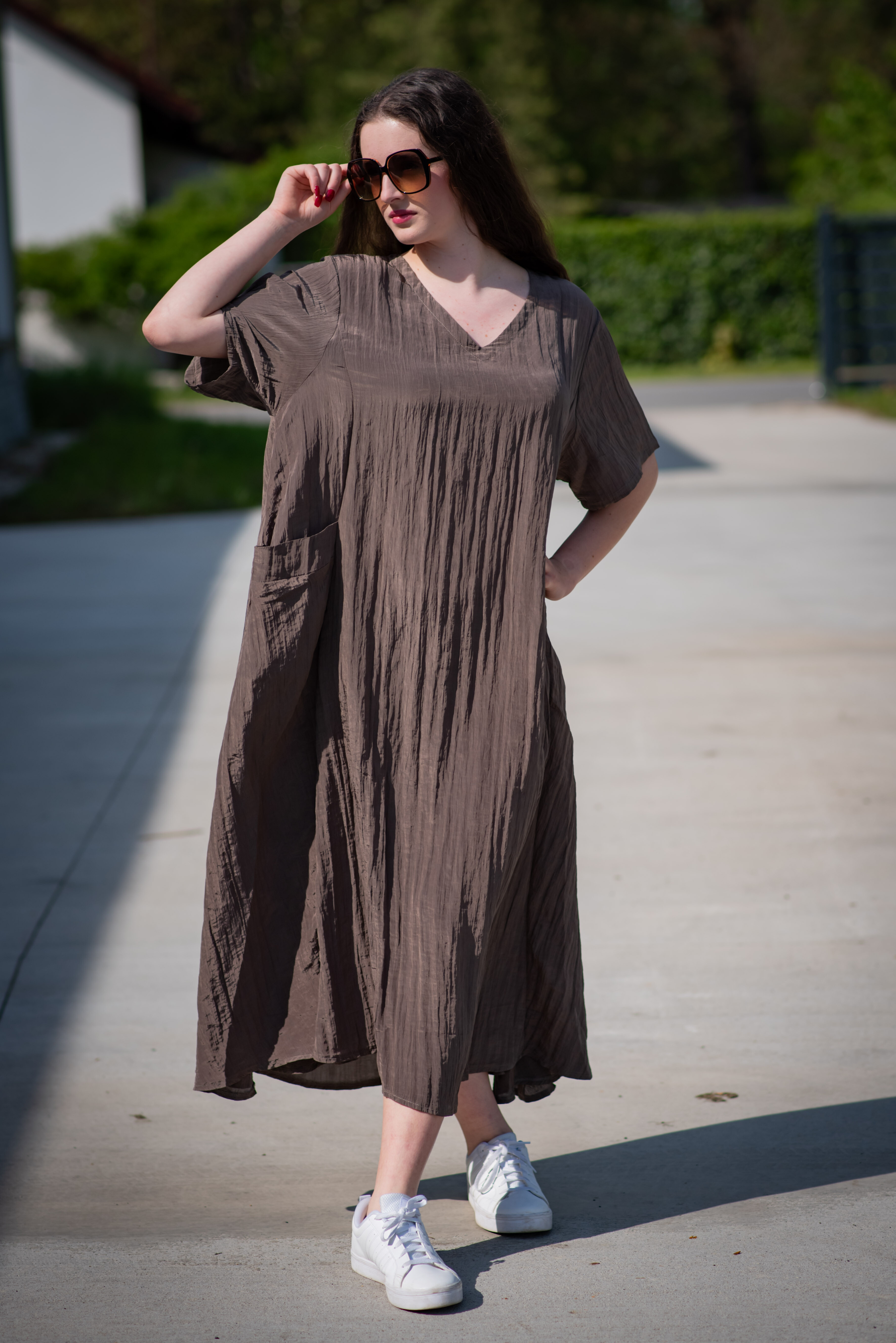 Dámské dlouhé šaty s našitými kapsami na přední straně, šaty jsou z velice příjemného materiálu, trendy krčený materiál. Šaty mají krátký rukáv a véčkový výstřih.