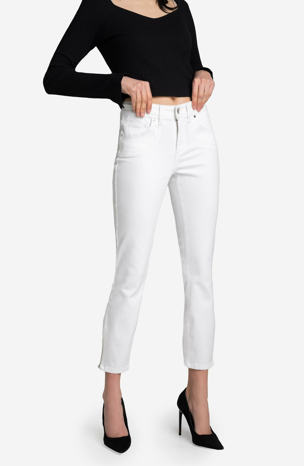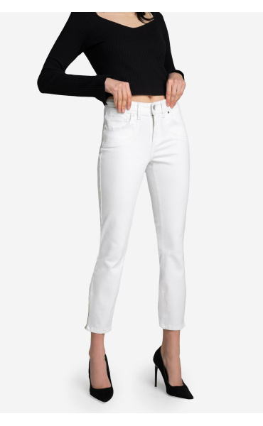 NOVINKA! Kalhoty VANESSA s perfektní, mírně kratší délkou, zakončené zipy ve spodní části nohavic. Vyrobeno z neuvěřitelně měkké a pružné tkaniny, ideální pro teplejší dny. Modelka je vysoká 173 cm a má na sobě velikost S/27.