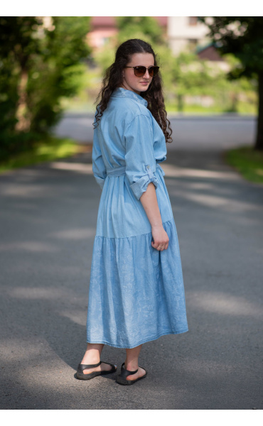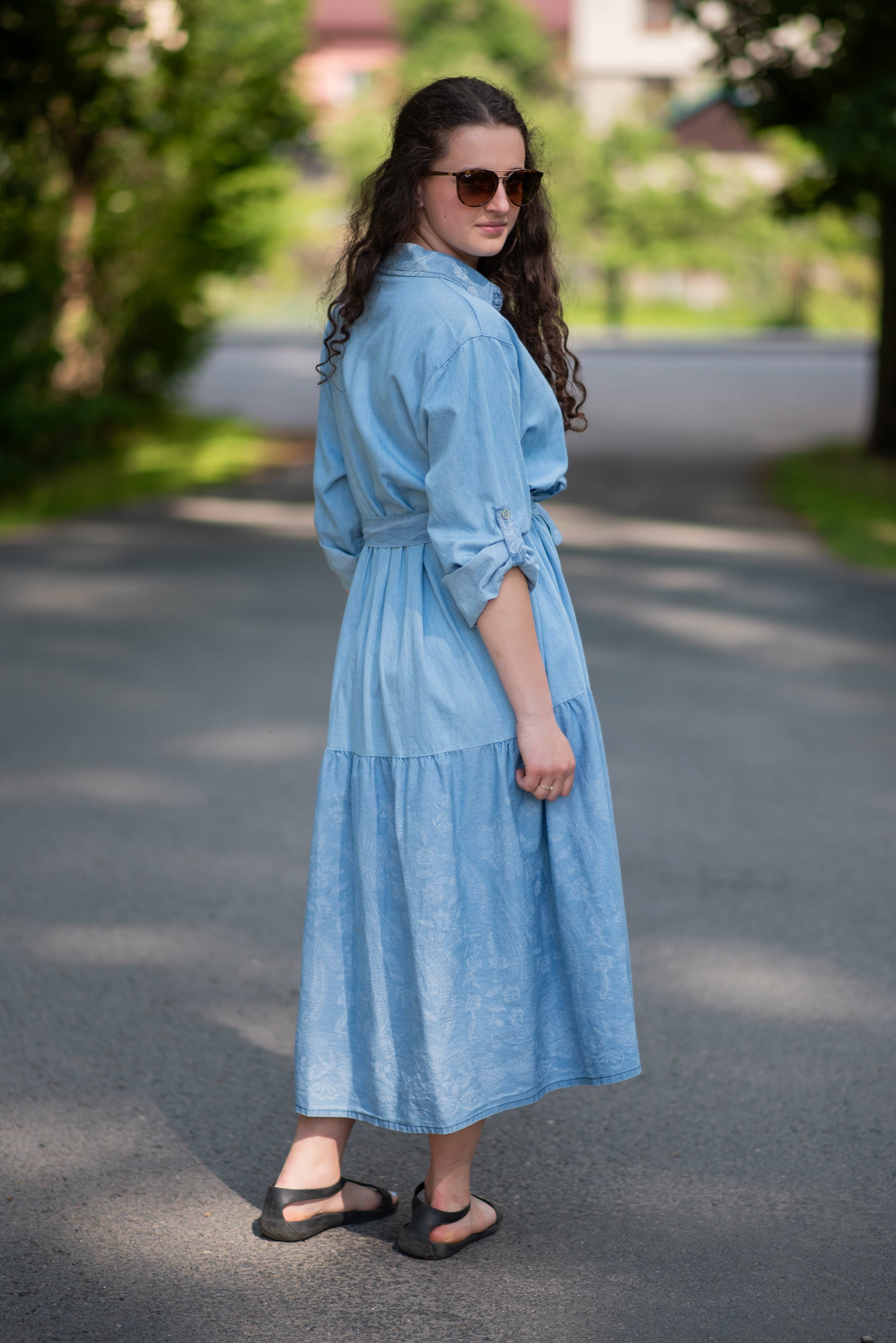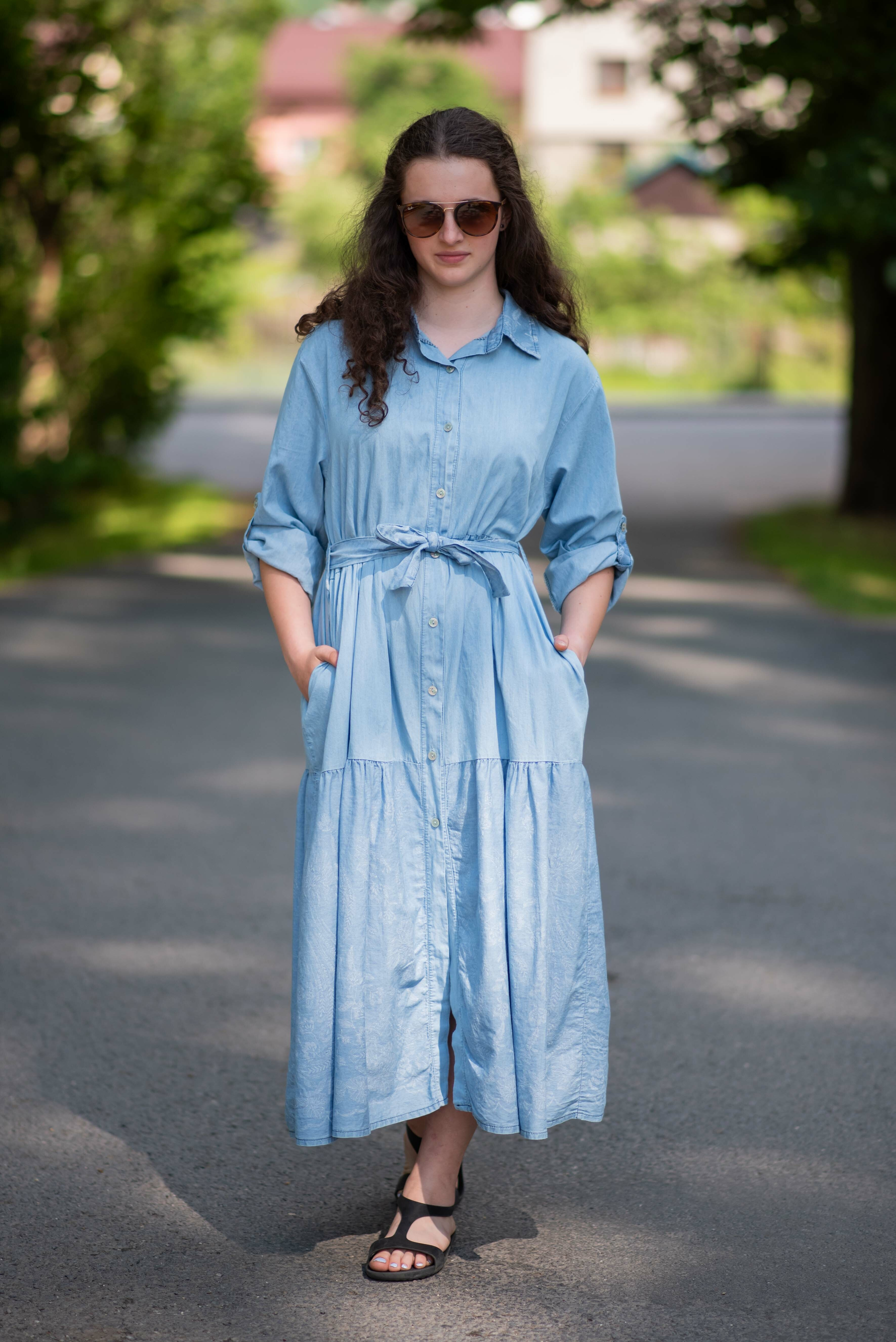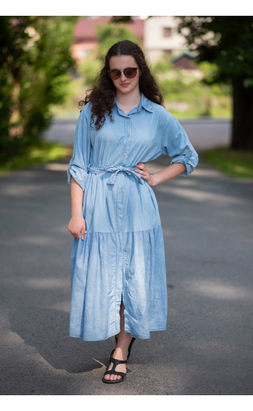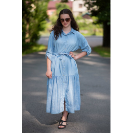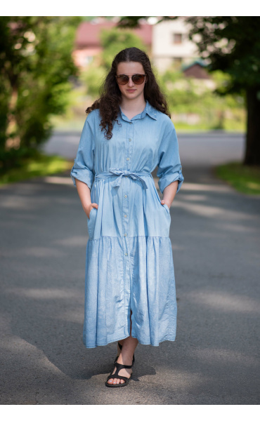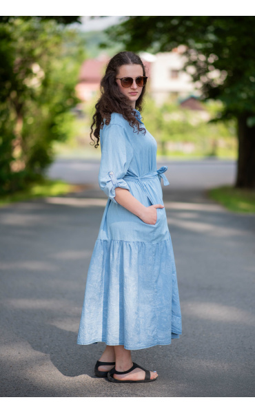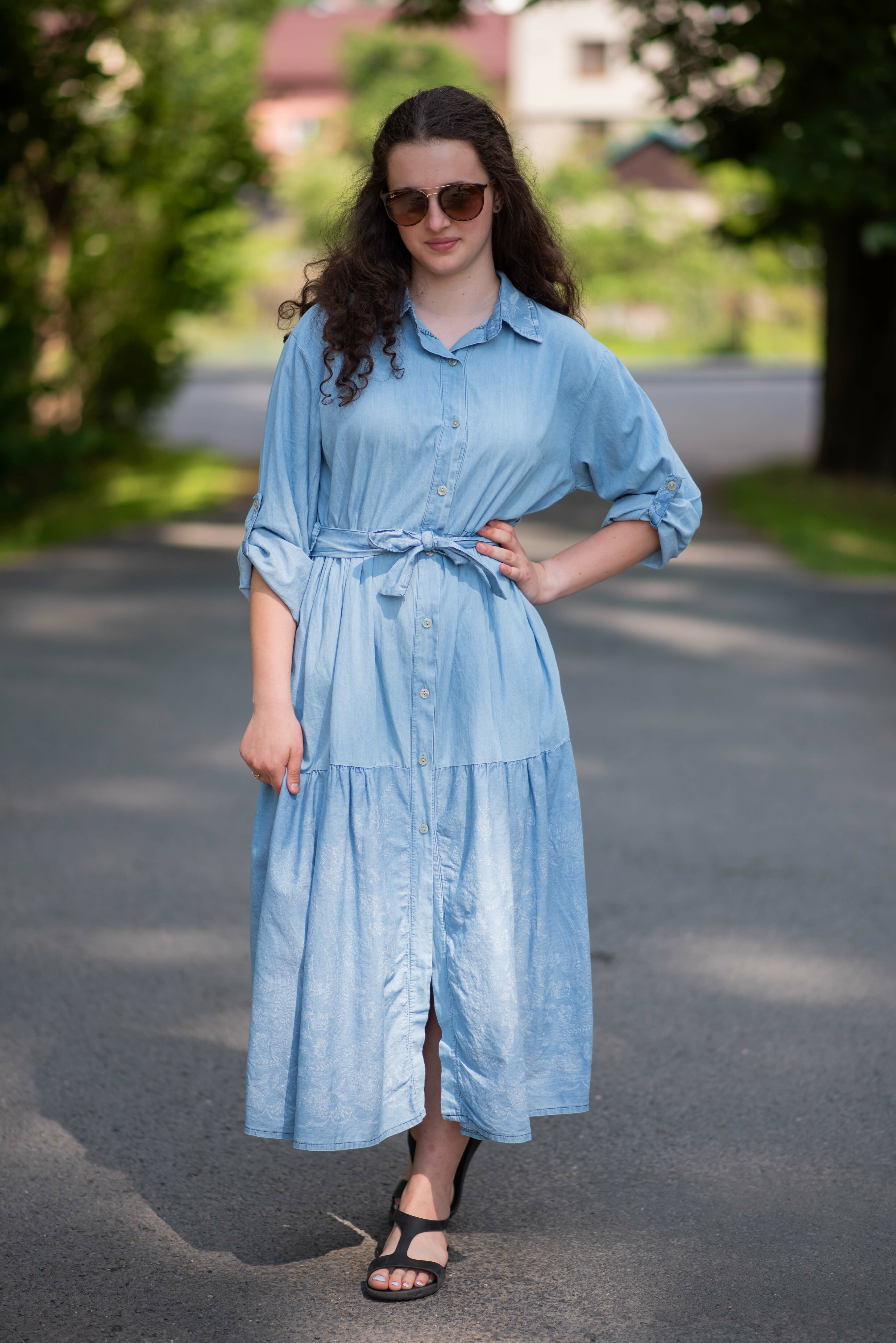 Košilové šaty z odlehčené džínoviny s 3/4 rukávem s regulací na knoflík. Šaty jsou celopropínací s vázáním kolem pasu, volánový střih.