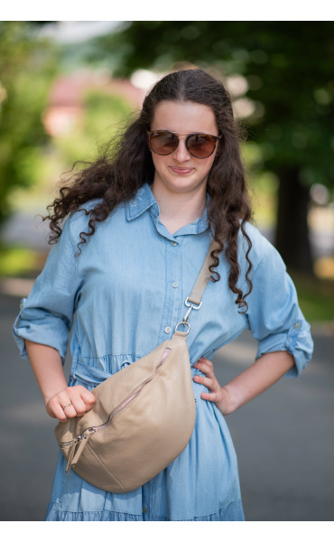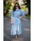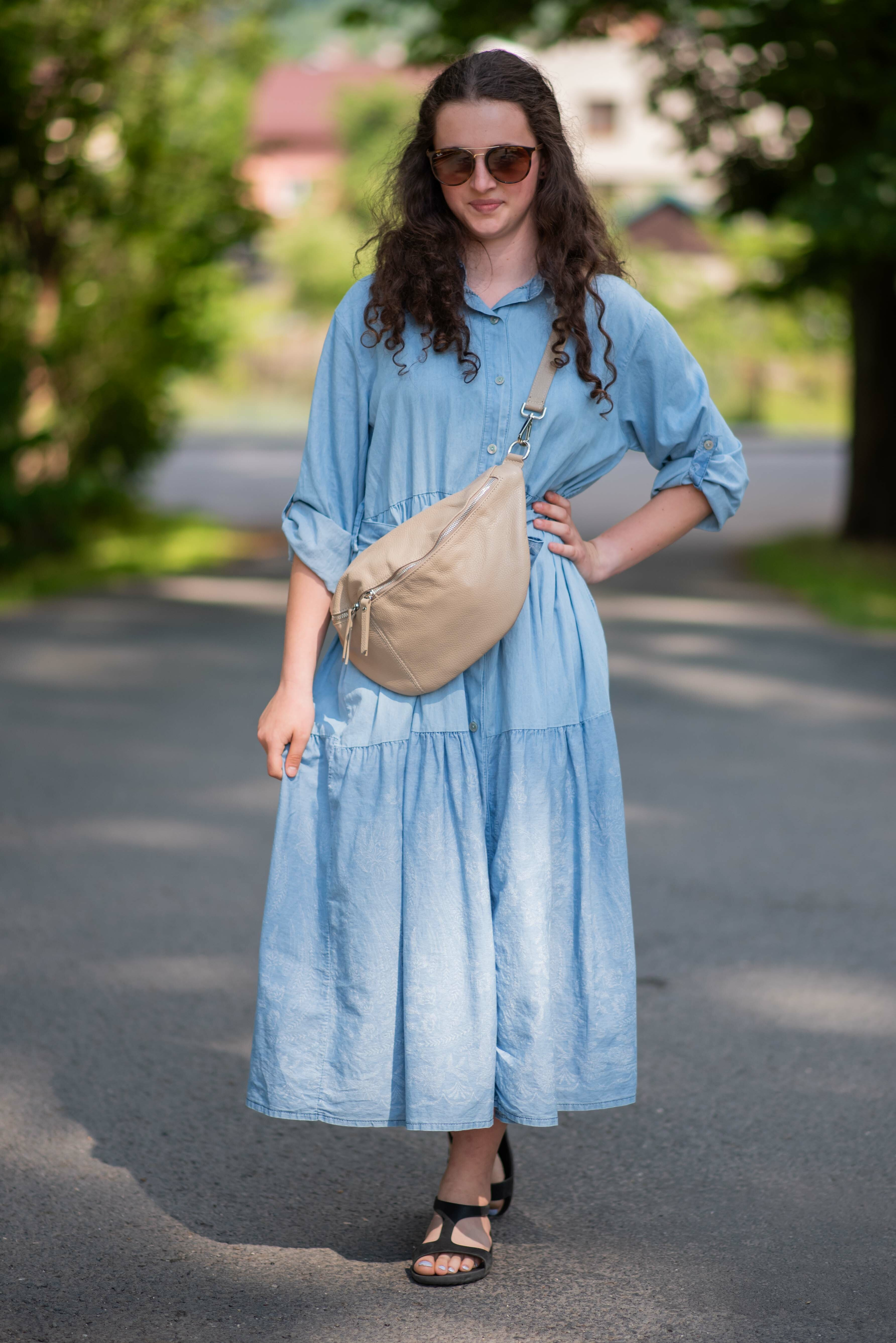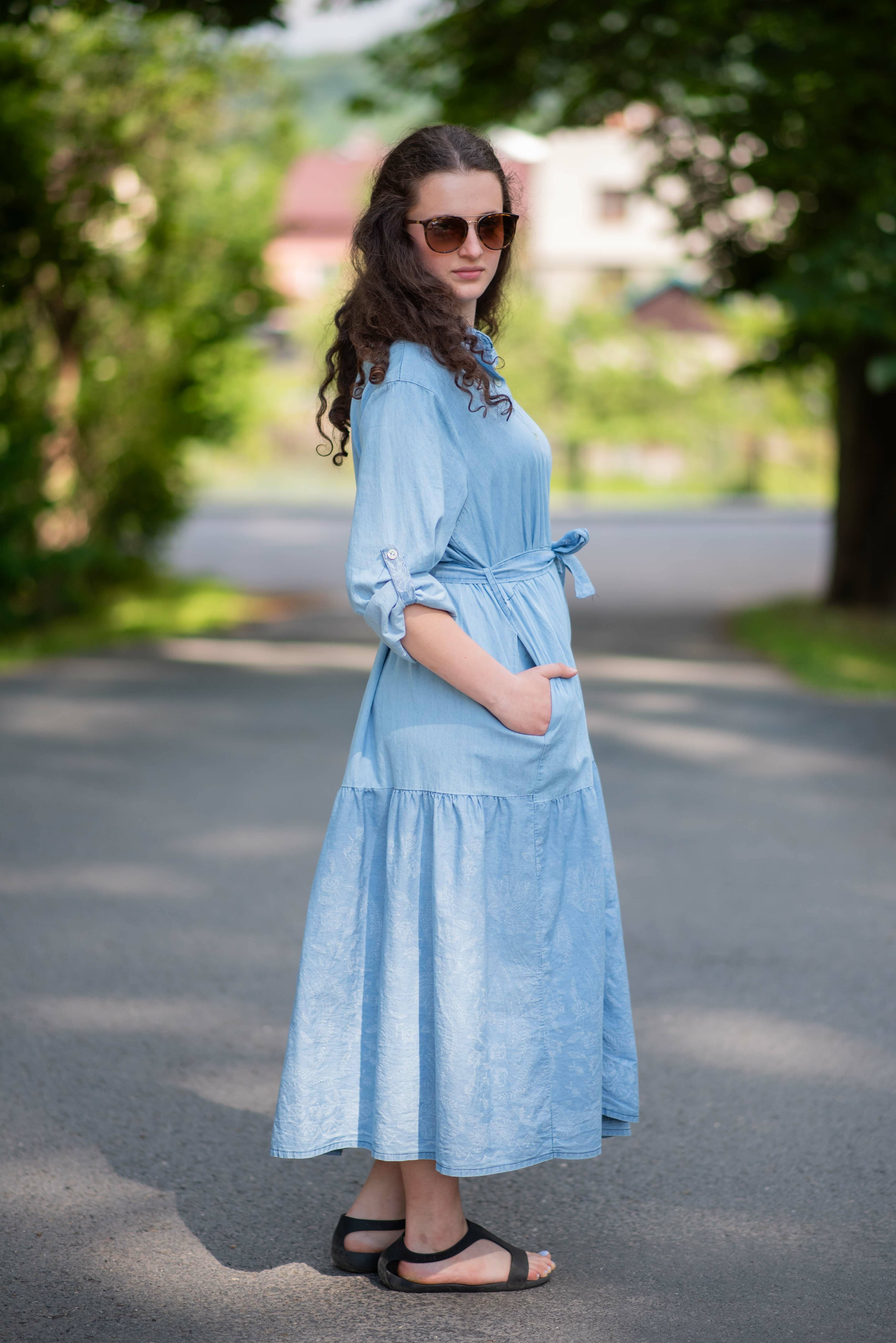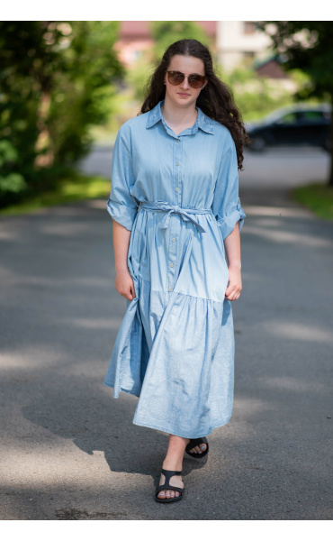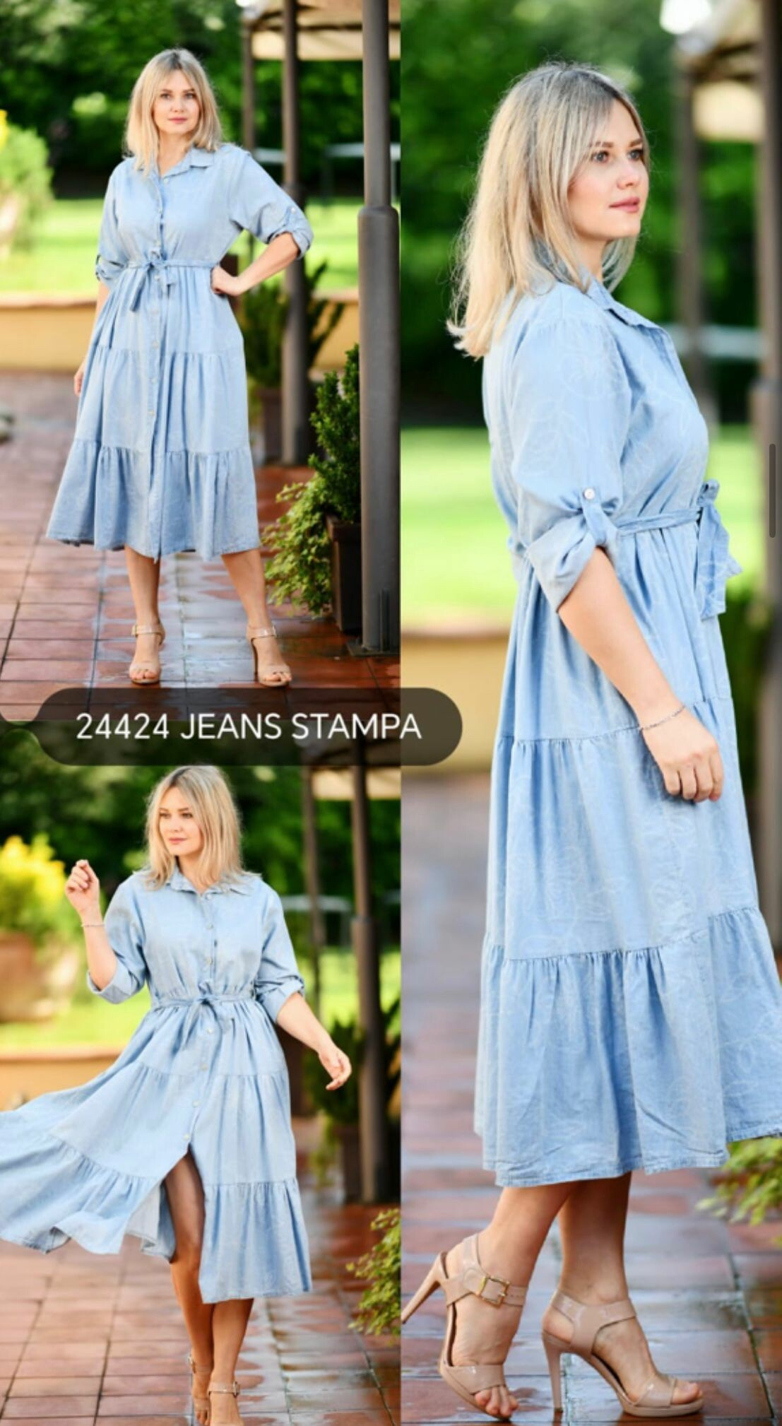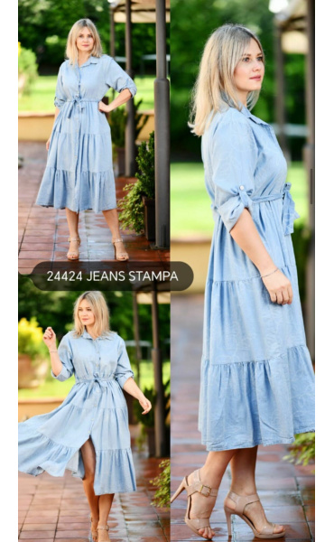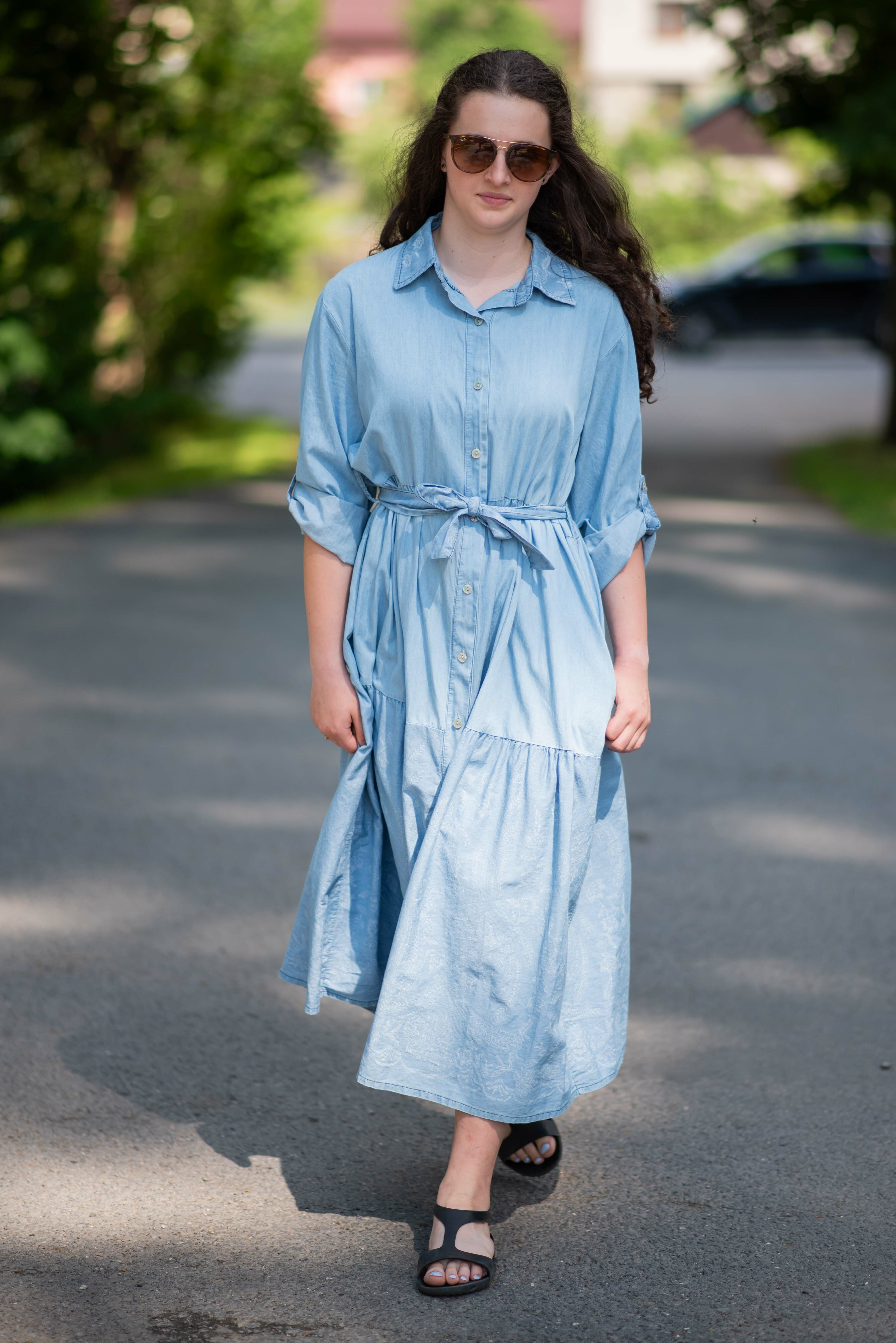 Košilové šaty z odlehčené džínoviny s 3/4 rukávem s regulací na knoflík. Šaty jsou celopropínací s vázáním kolem pasu, volánový střih.