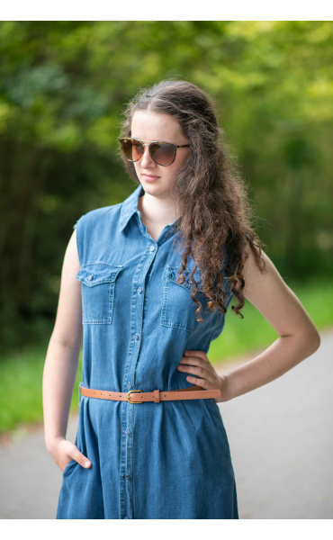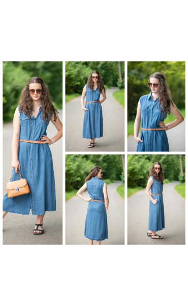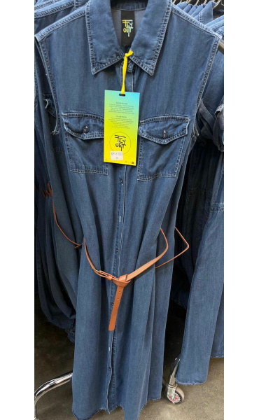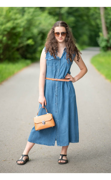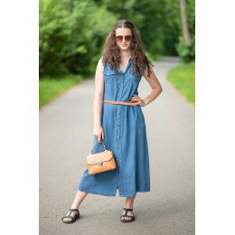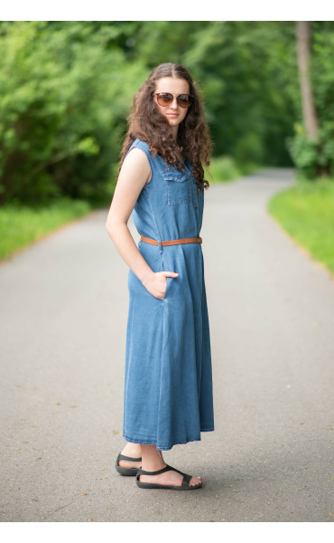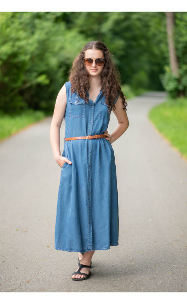 Dlouhé džínové šaty bez rukávu, košilového střihu, celopropínací. Šaty jsou velice vzdušné, vybeny z odlehčené džínoviny.
