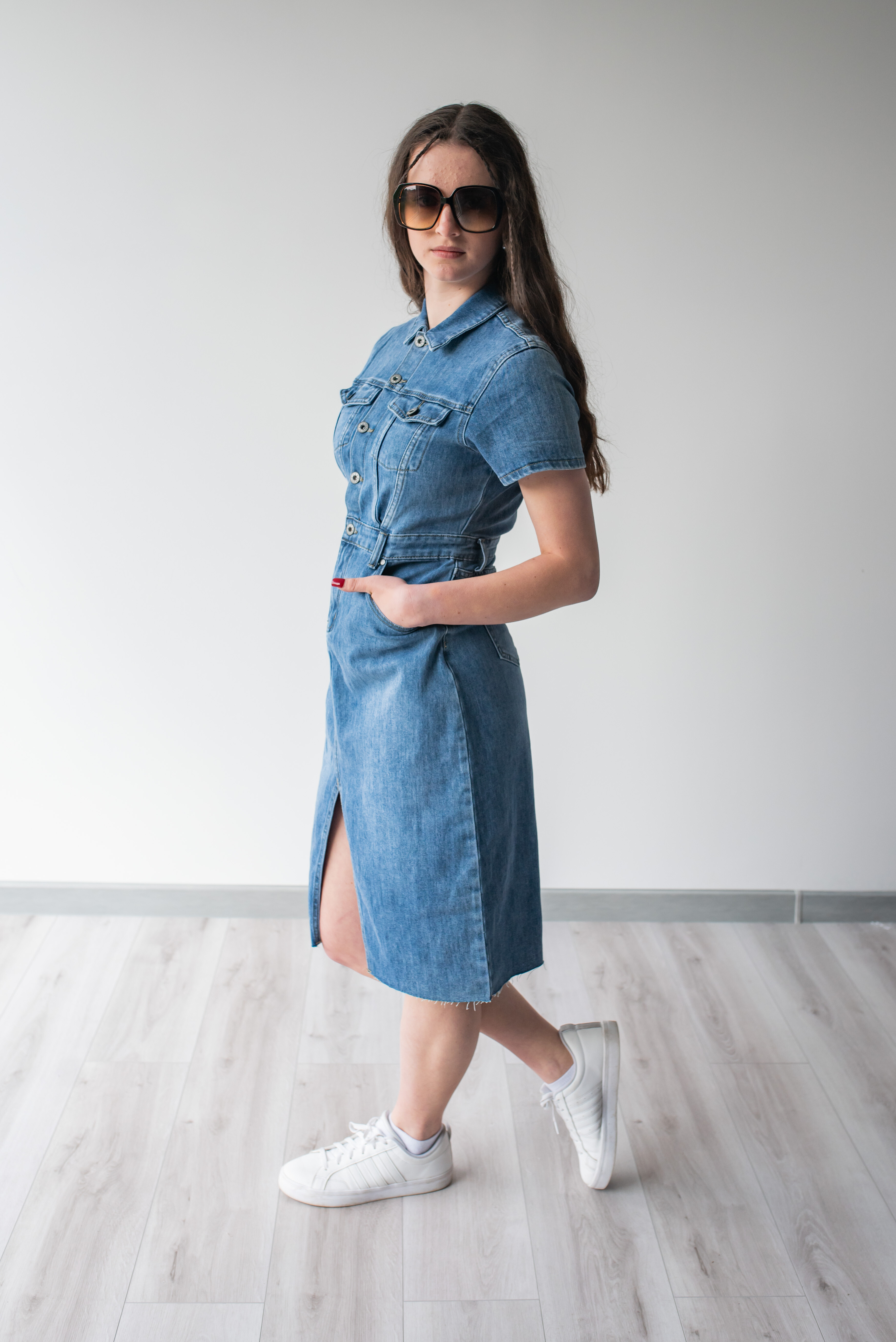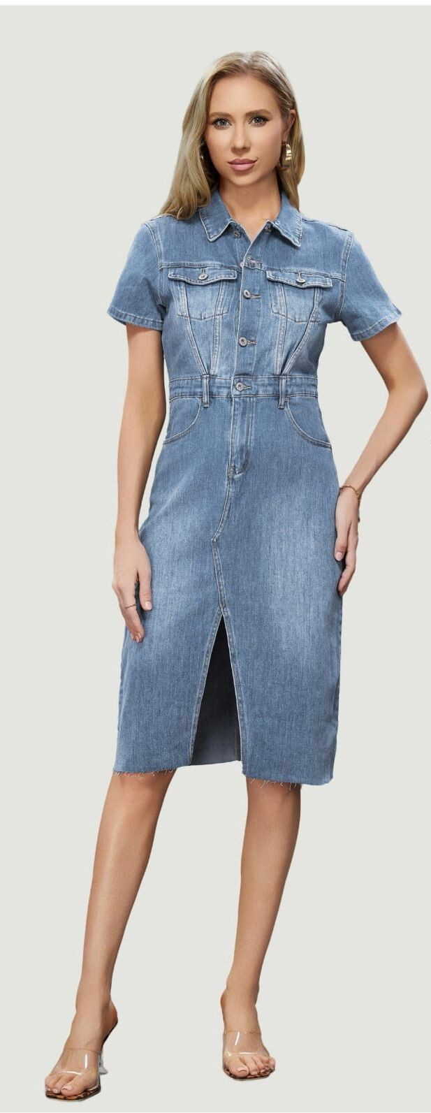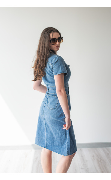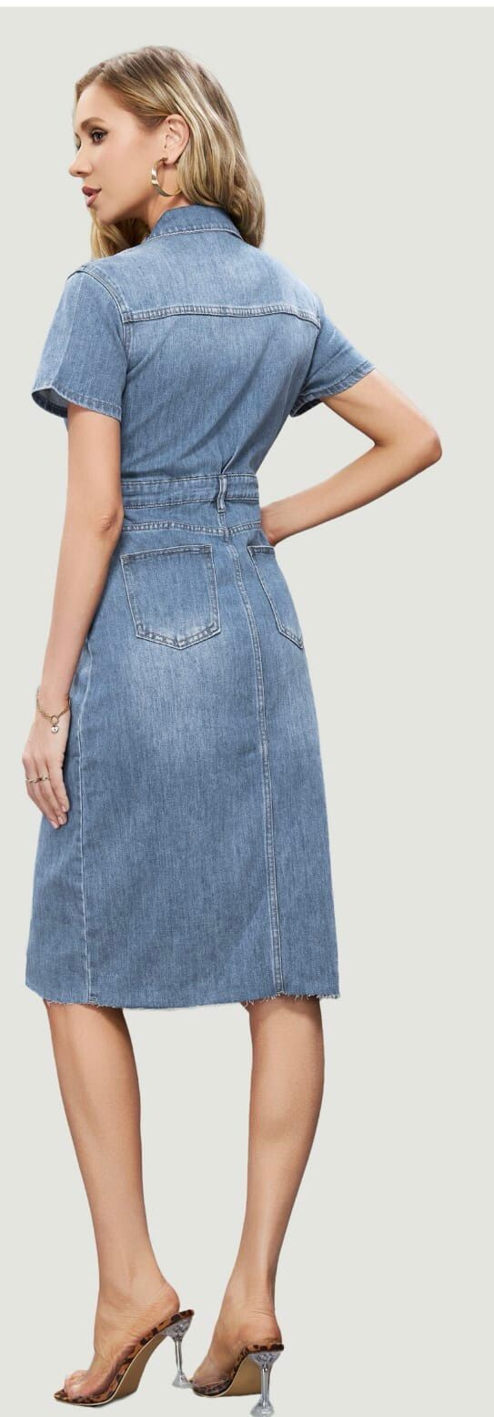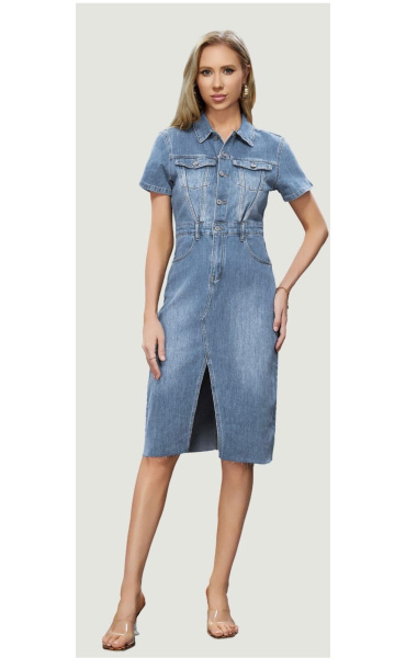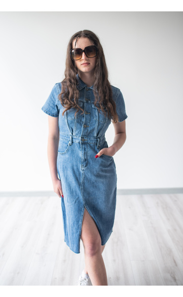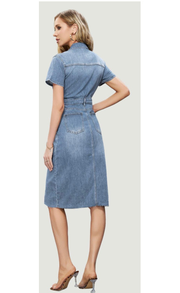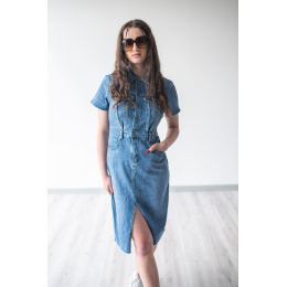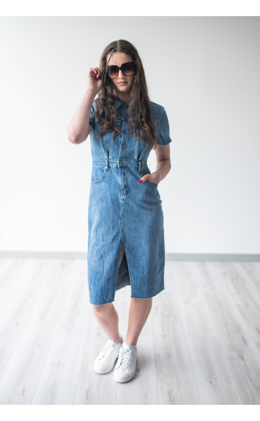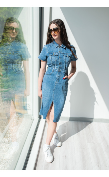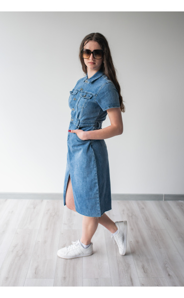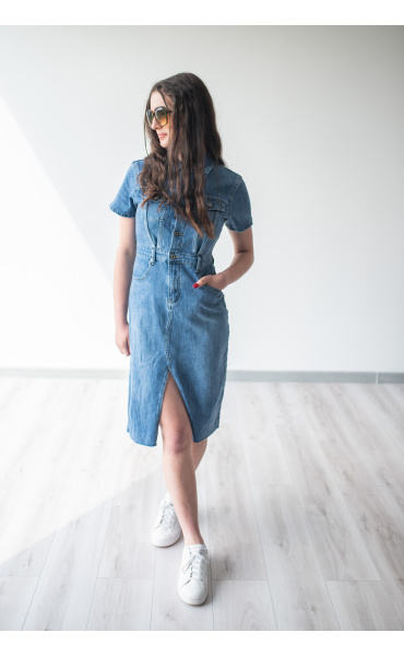 Trendy dámské džínové šaty s krátkým rukávem a límečkem. Šaty jsou z pružného materiálu, na přední straně mají našité kapsy na hrudníku a v oblasti boků, dále mají také našité kapsy na zadní straně. Jsou propínací na kovové knoflíky do pasu.