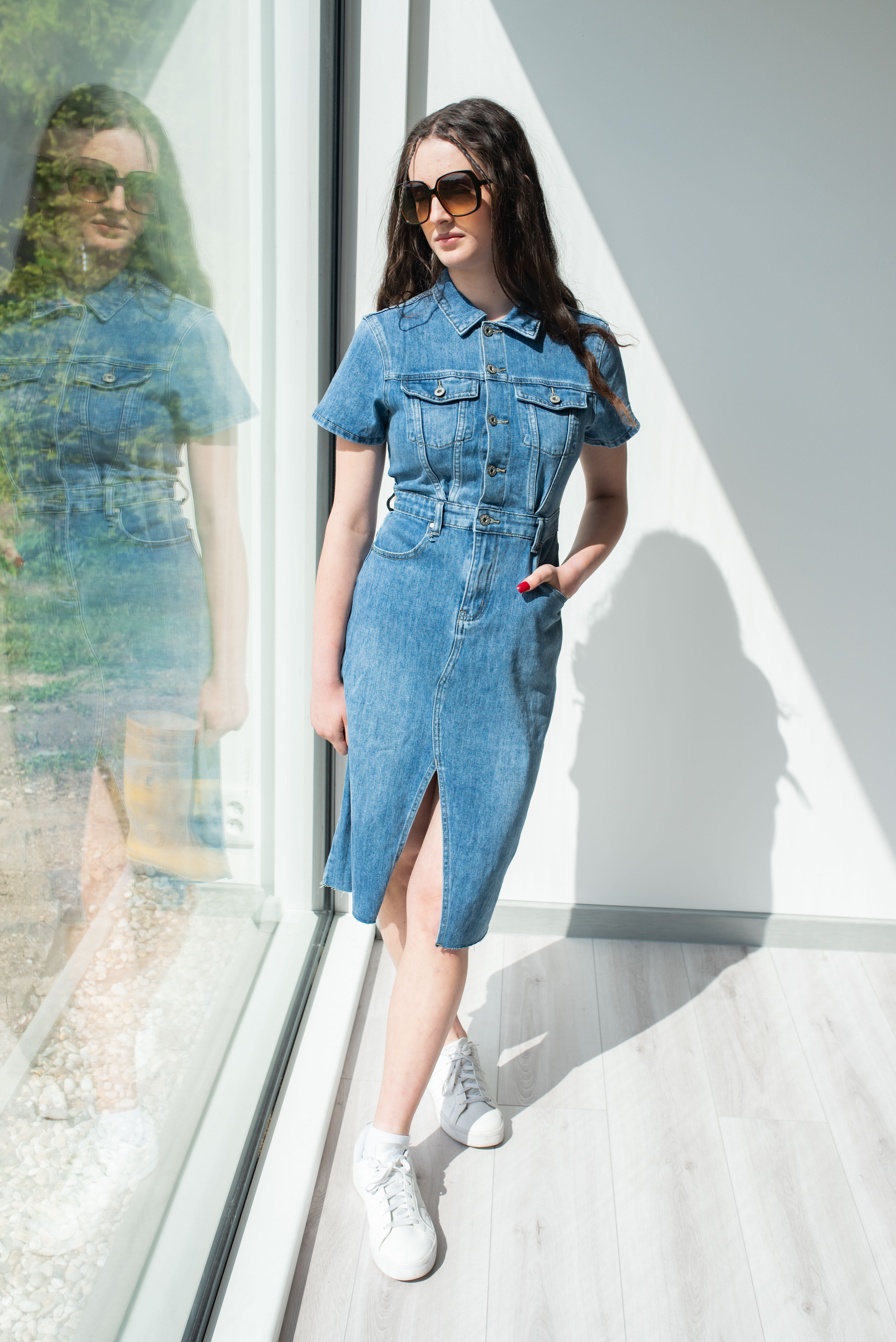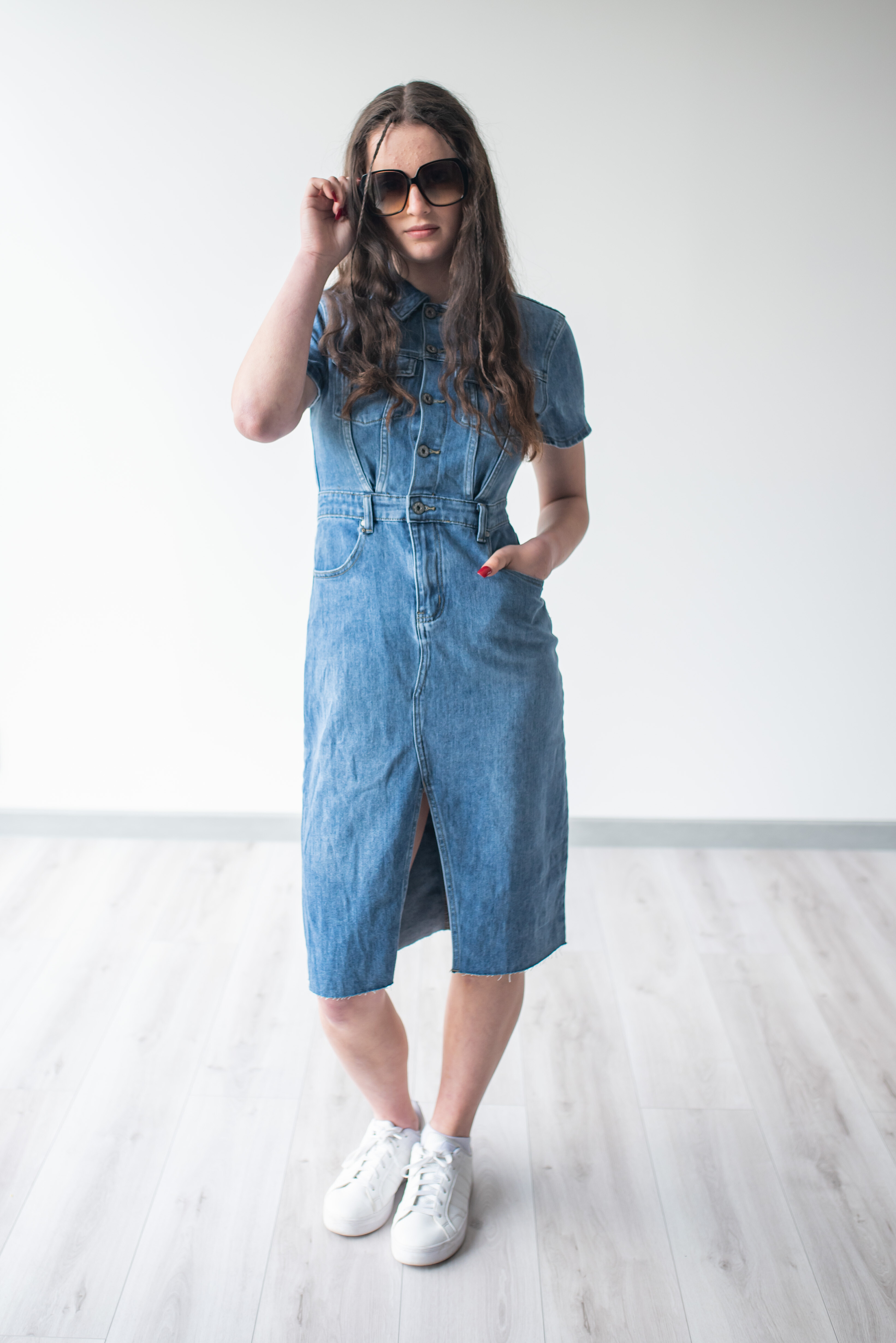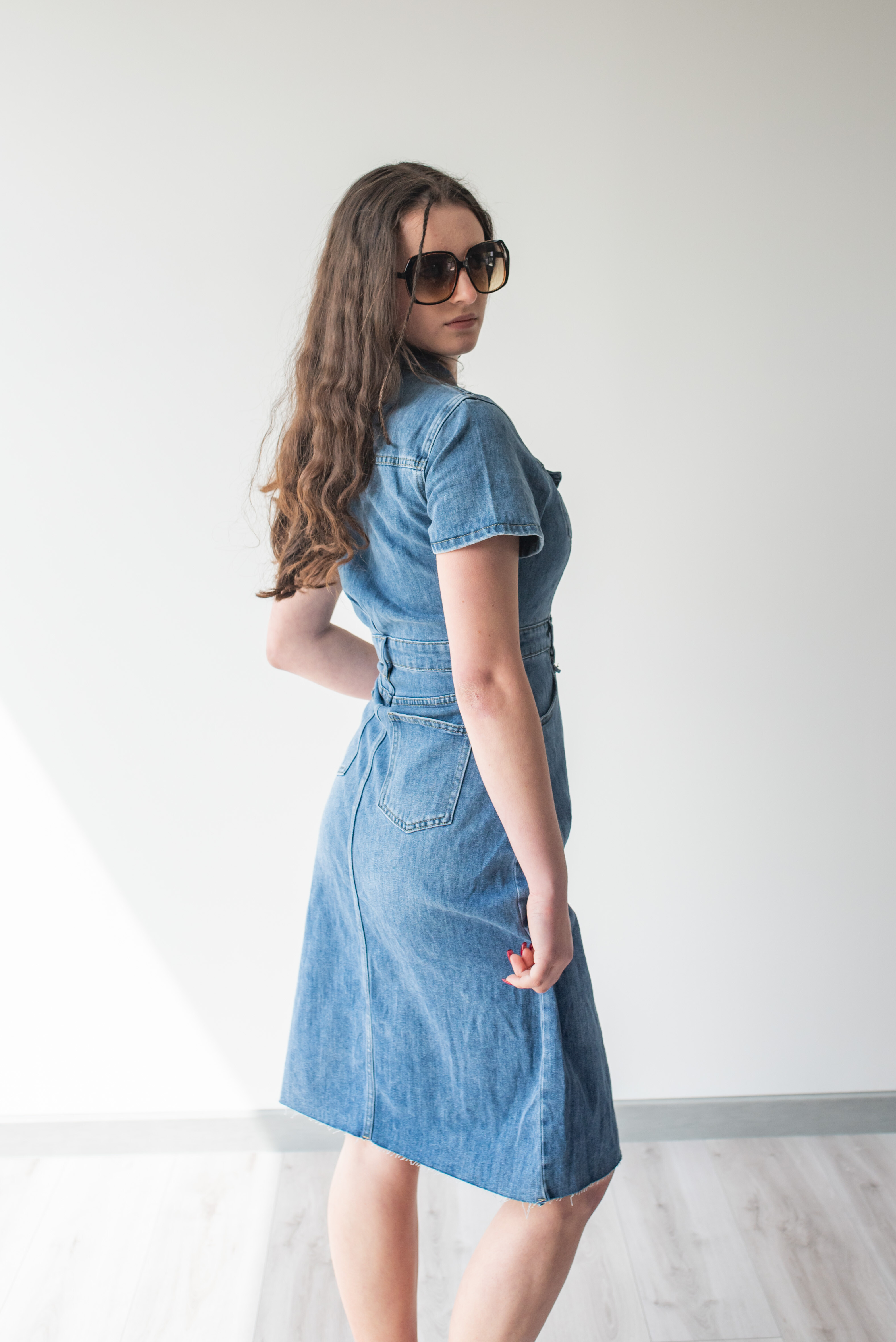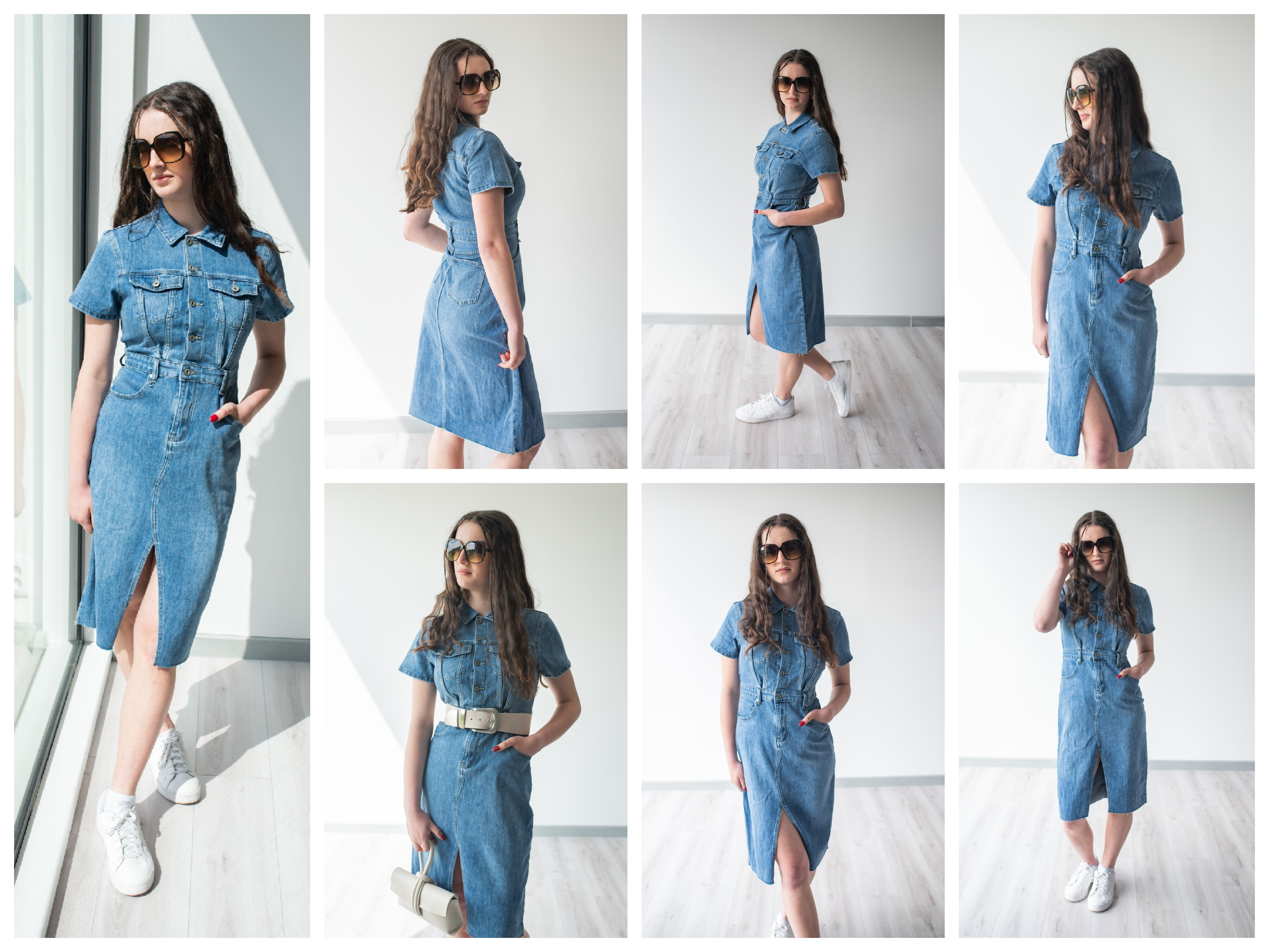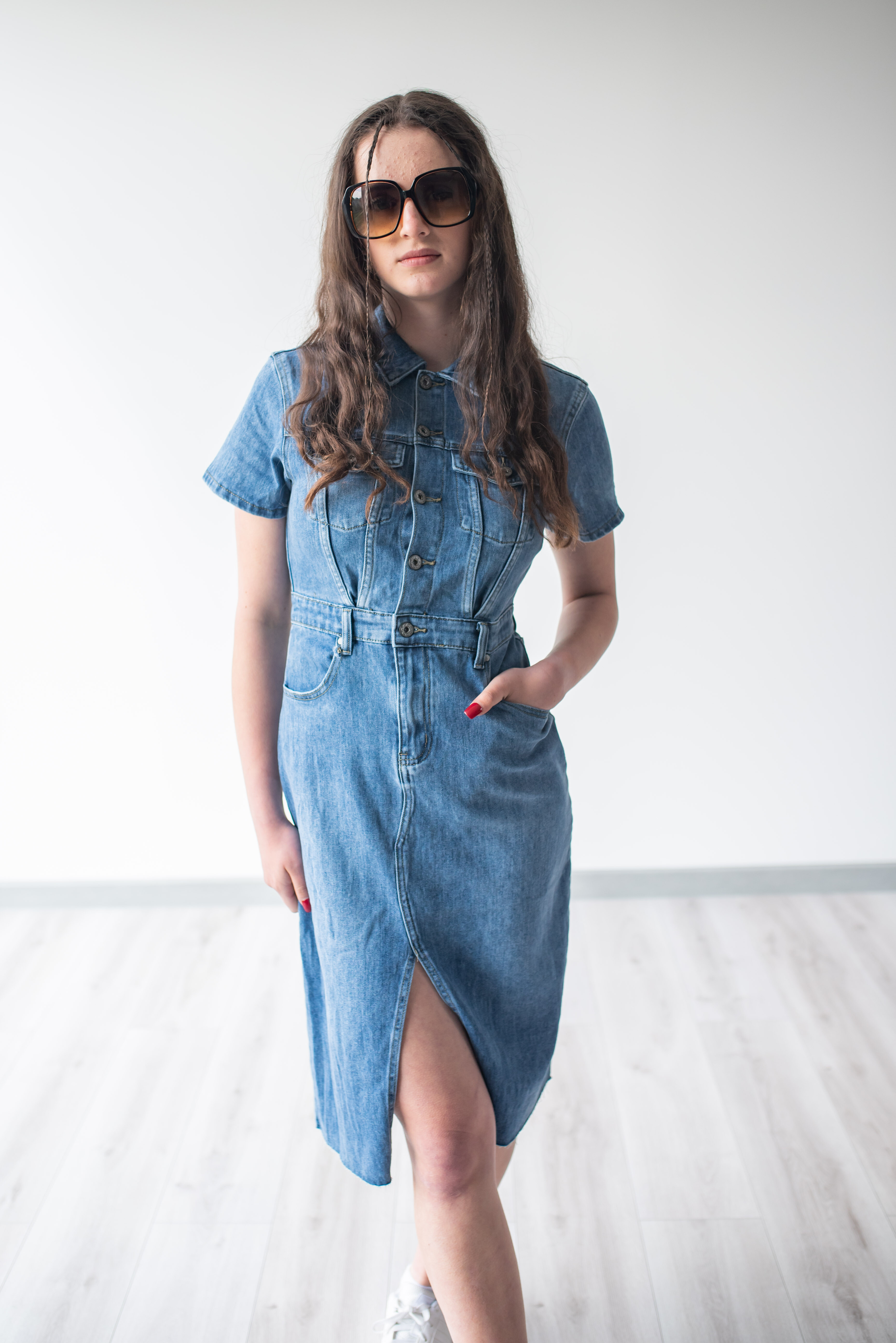 Trendy dámské džínové šaty s krátkým rukávem a límečkem. Šaty jsou z pružného materiálu, na přední straně mají našité kapsy na hrudníku a v oblasti boků, dále mají také našité kapsy na zadní straně. Jsou propínací na kovové knoflíky do pasu.
