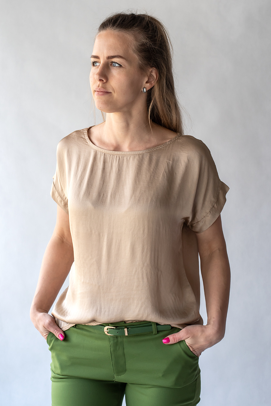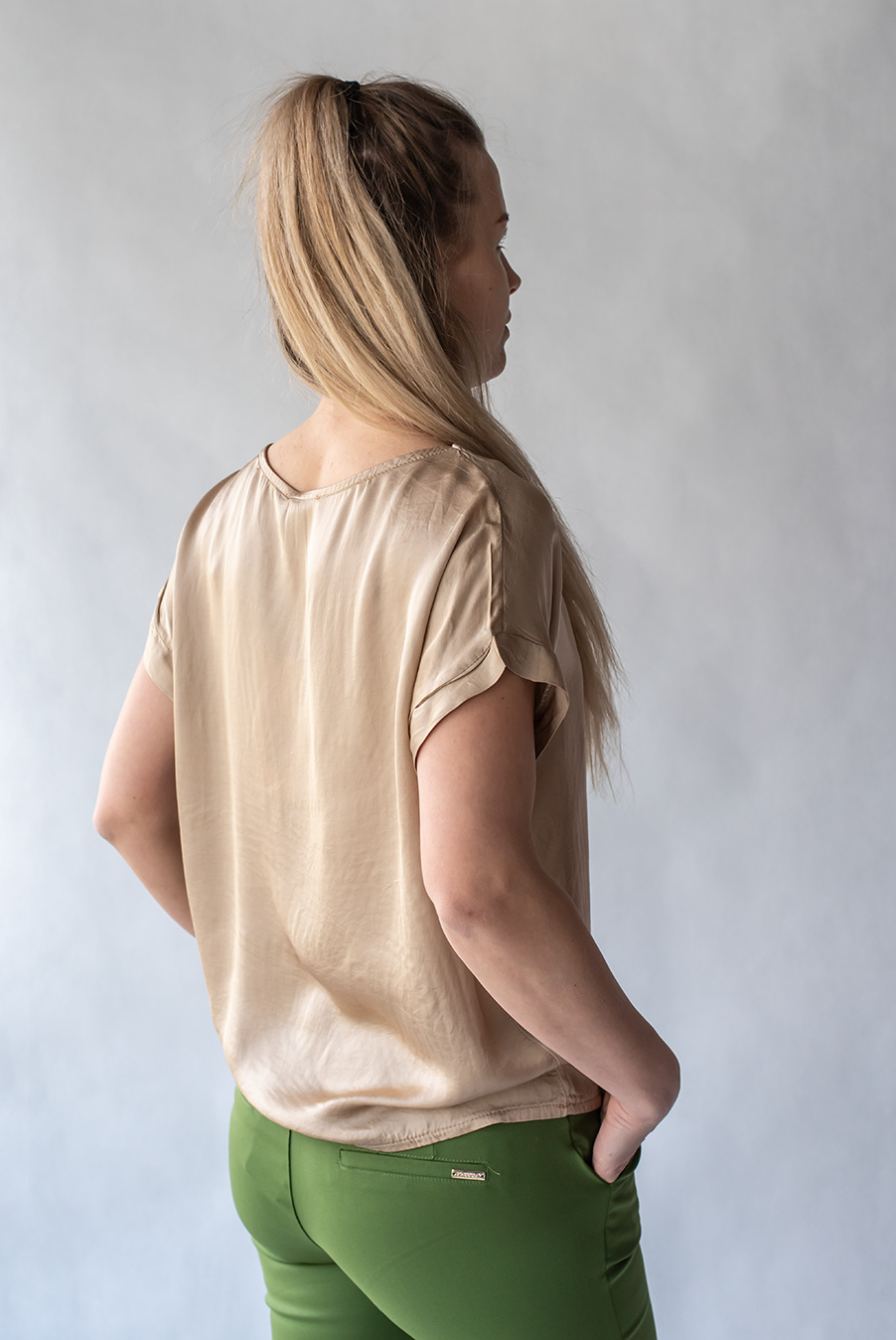 Saténová halenka s krátkým rukávem, pro každodenní pohodlné nošení.