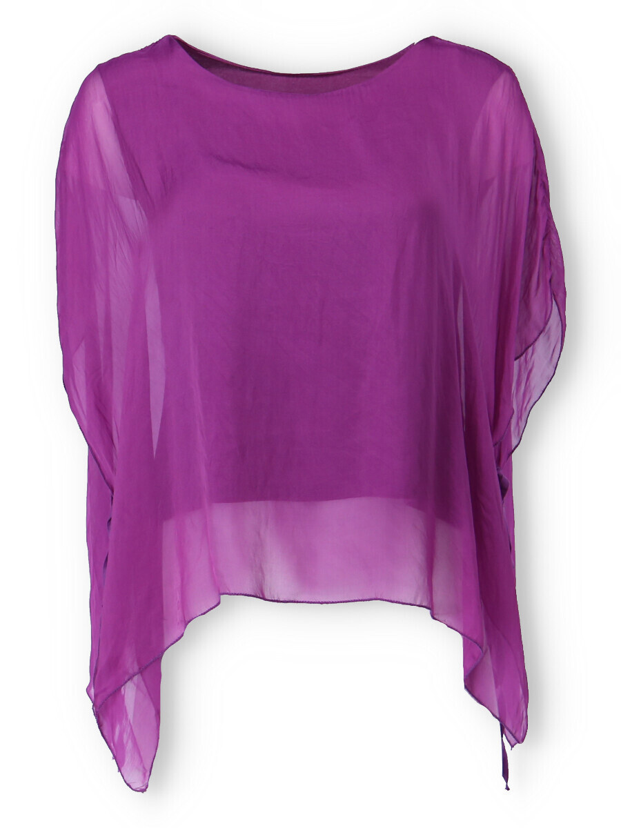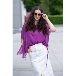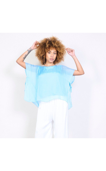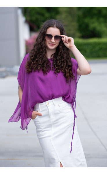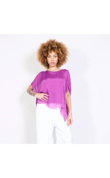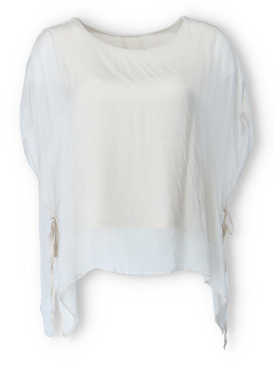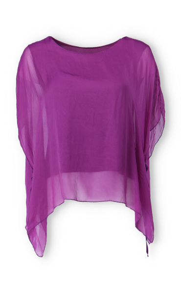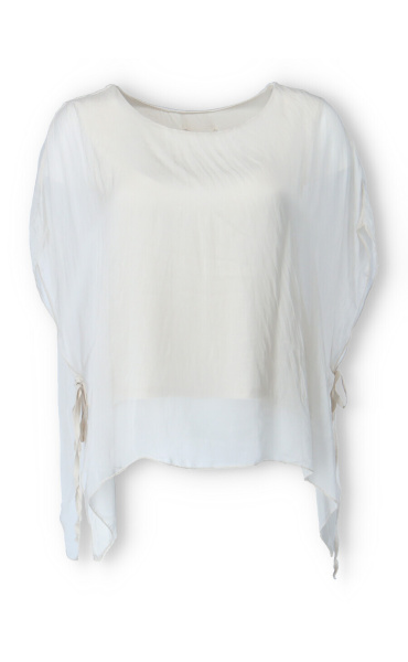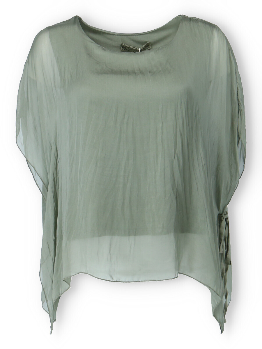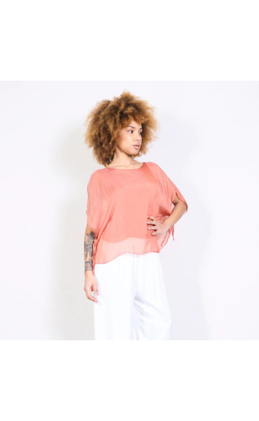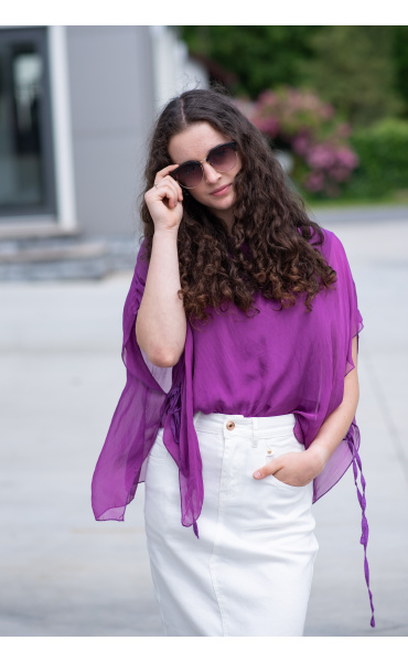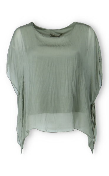 Dámská elegantní hedvábná halenka s raglánovým rukávem, řešeným ve spodní části vázáním. Halenka je kratšího střihu a má kulatý výstřih a podšívku.
