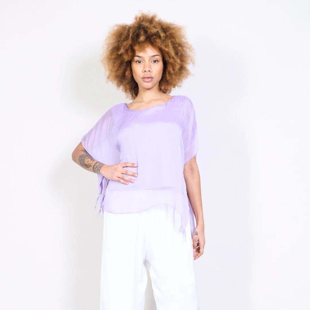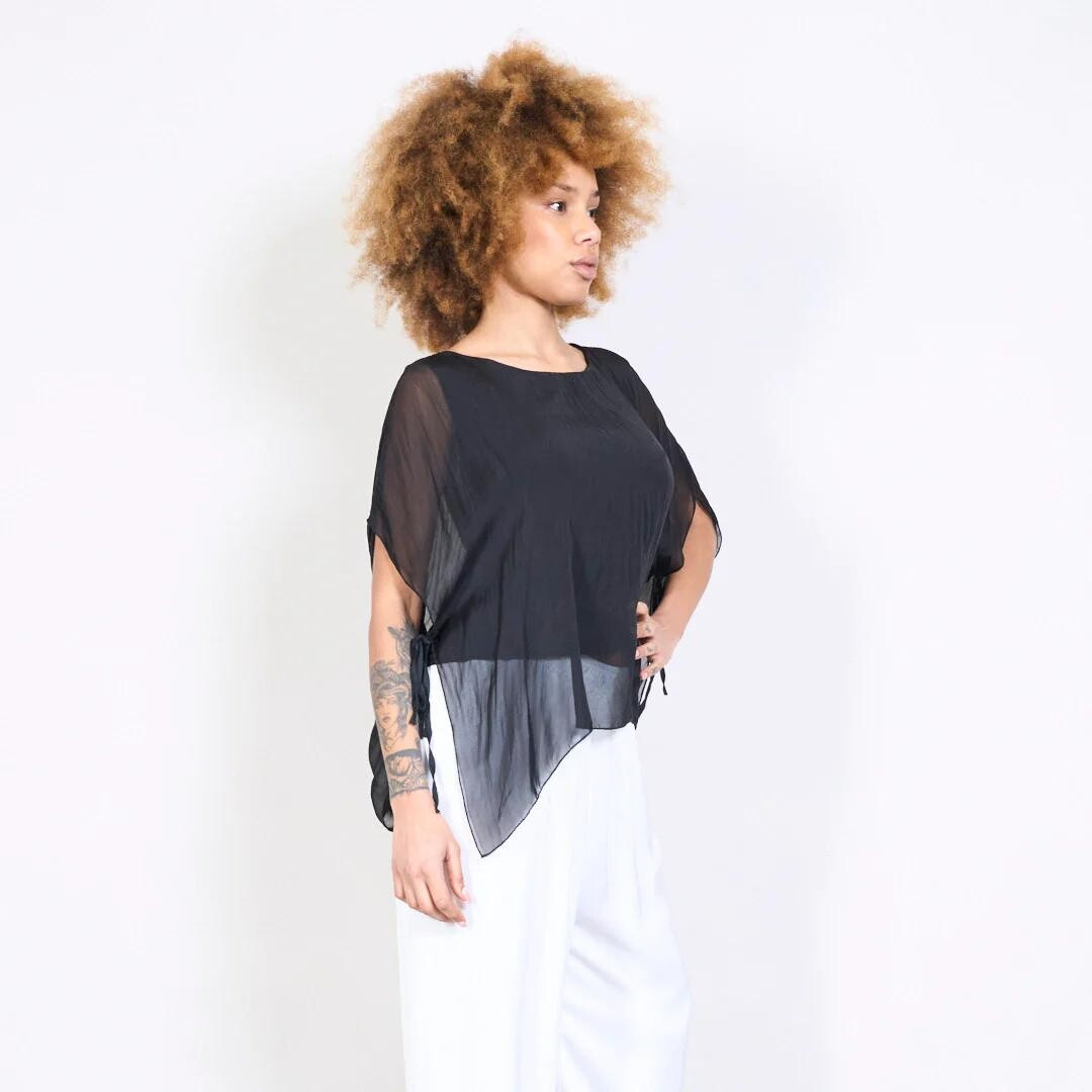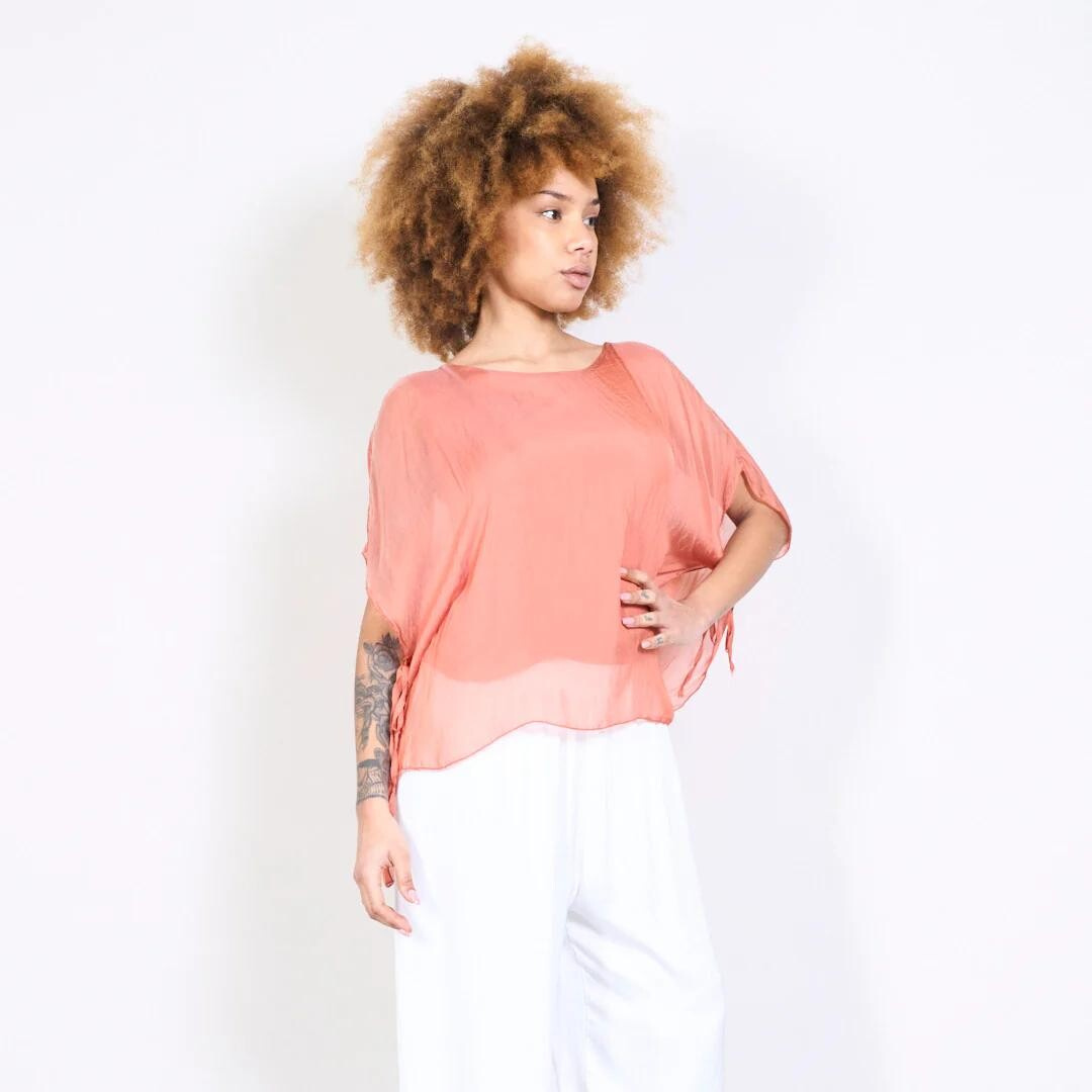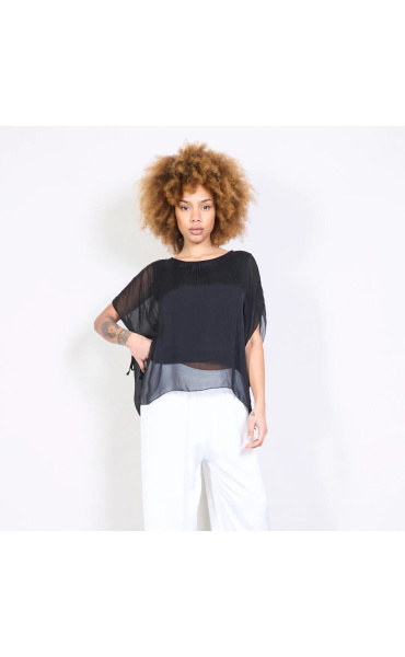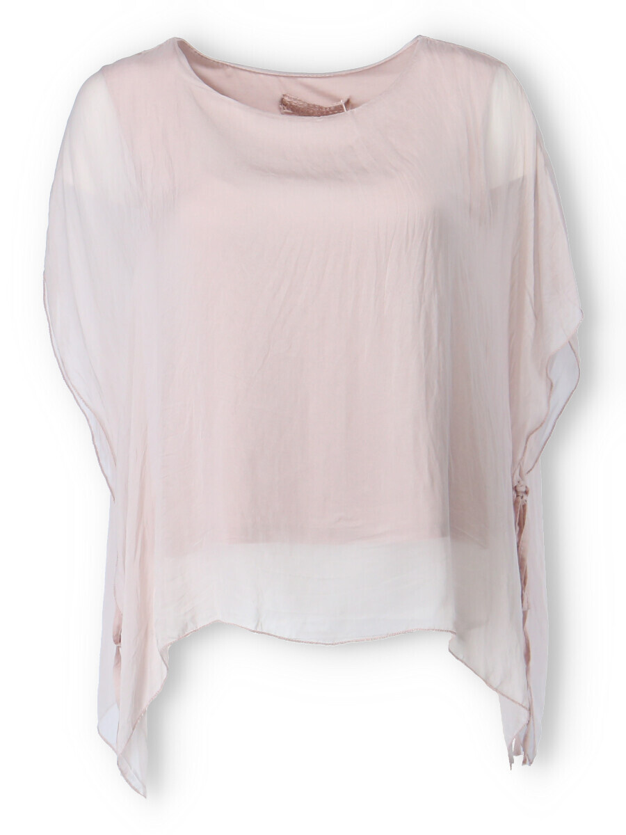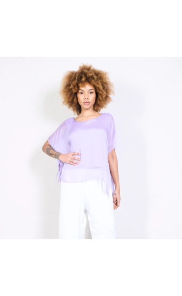 Dámská elegantní hedvábná halenka s raglánovým rukávem, řešeným ve spodní části vázáním. Halenka je kratšího střihu a má kulatý výstřih a podšívku.