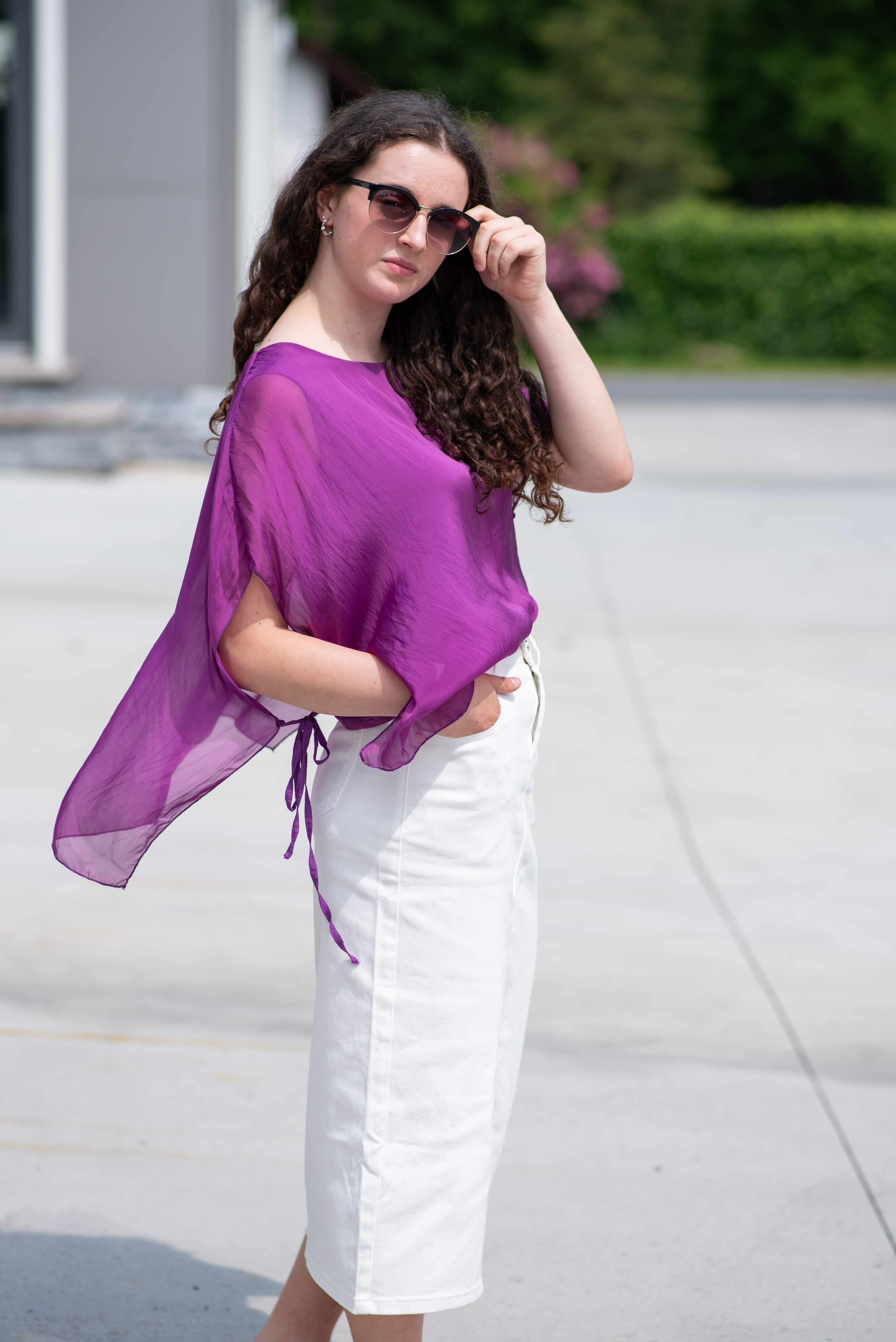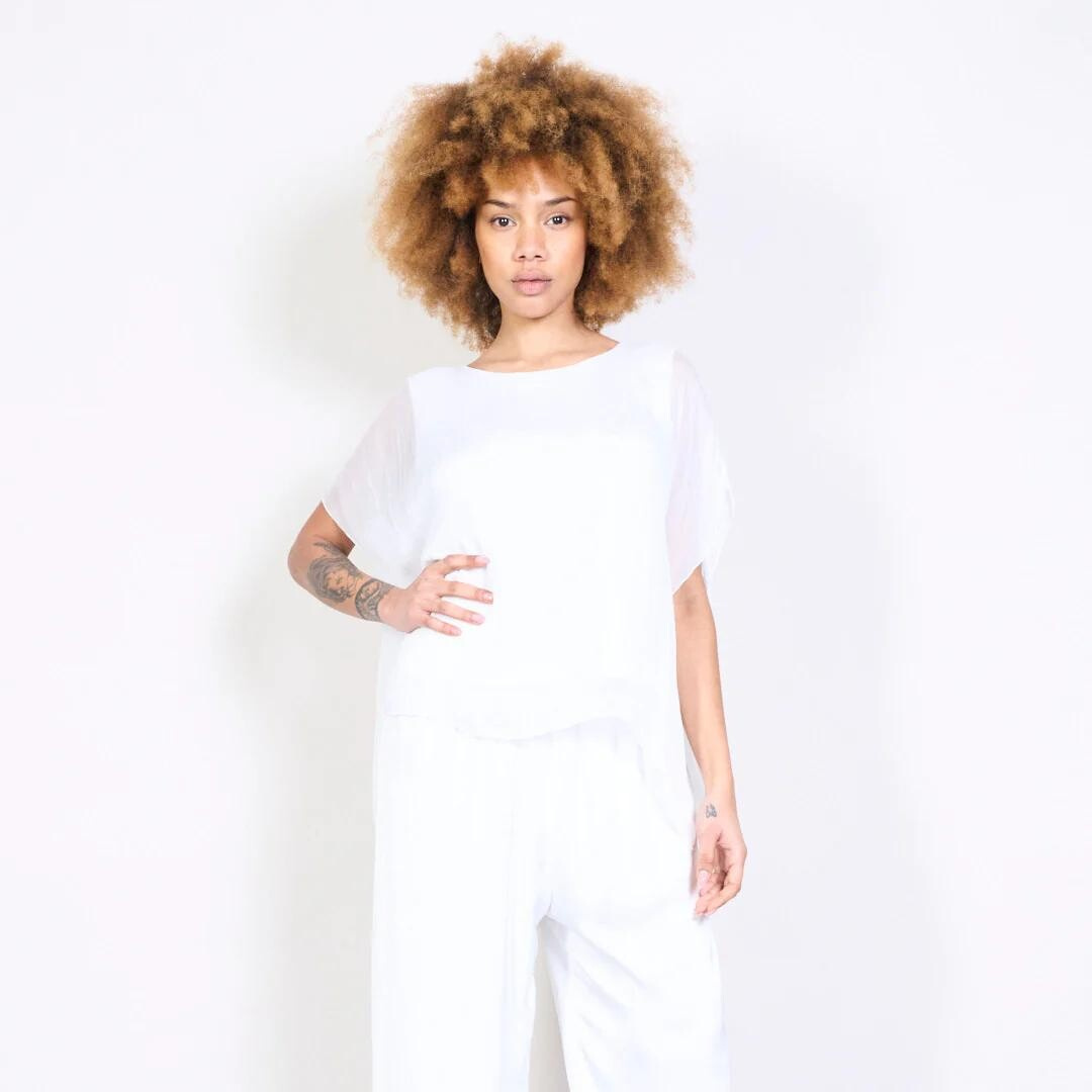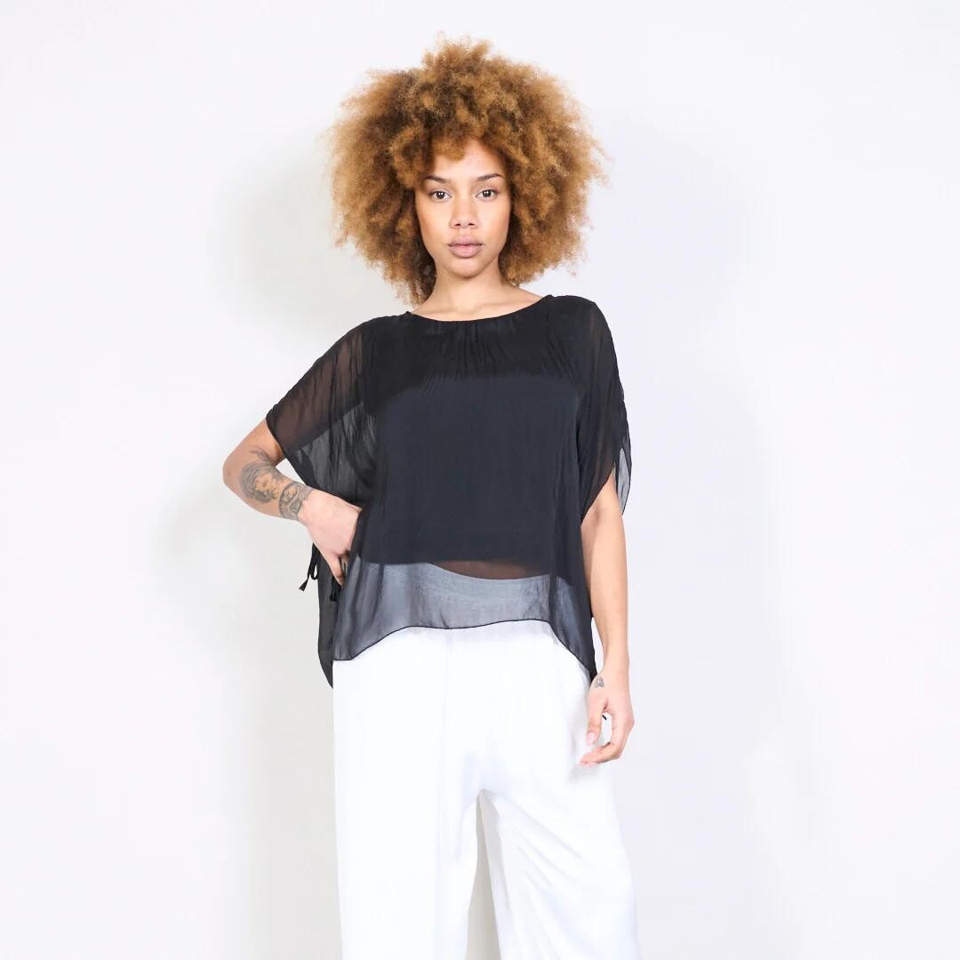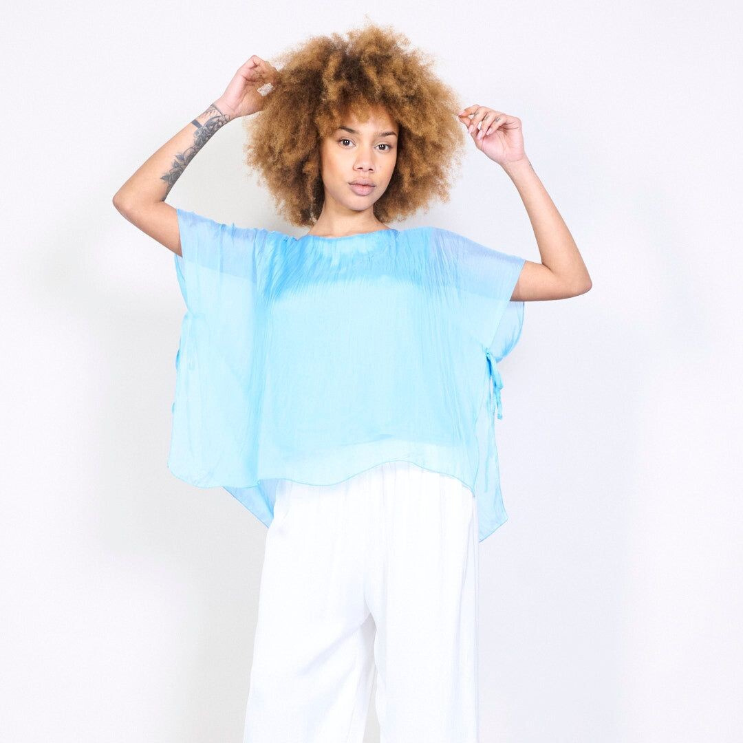 Dámská elegantní hedvábná halenka s raglánovým rukávem, řešeným ve spodní části vázáním. Halenka je kratšího střihu a má kulatý výstřih a podšívku.