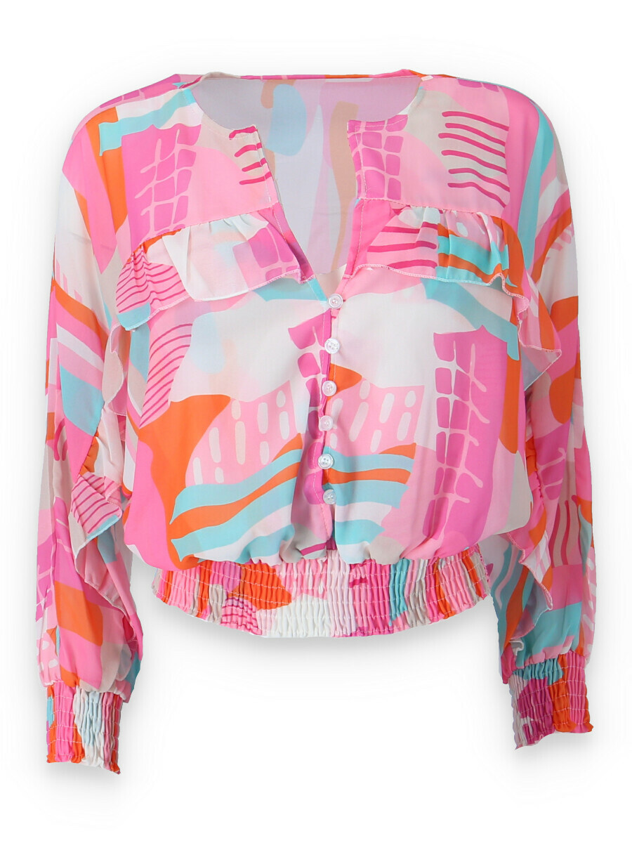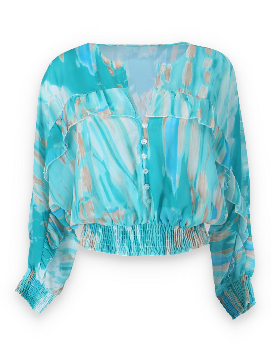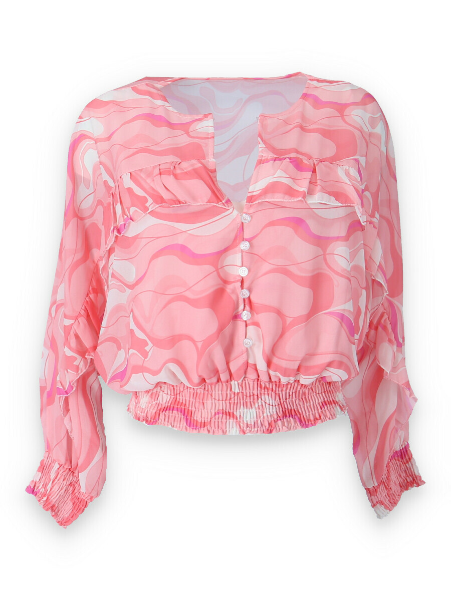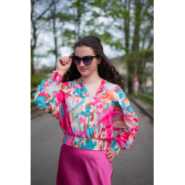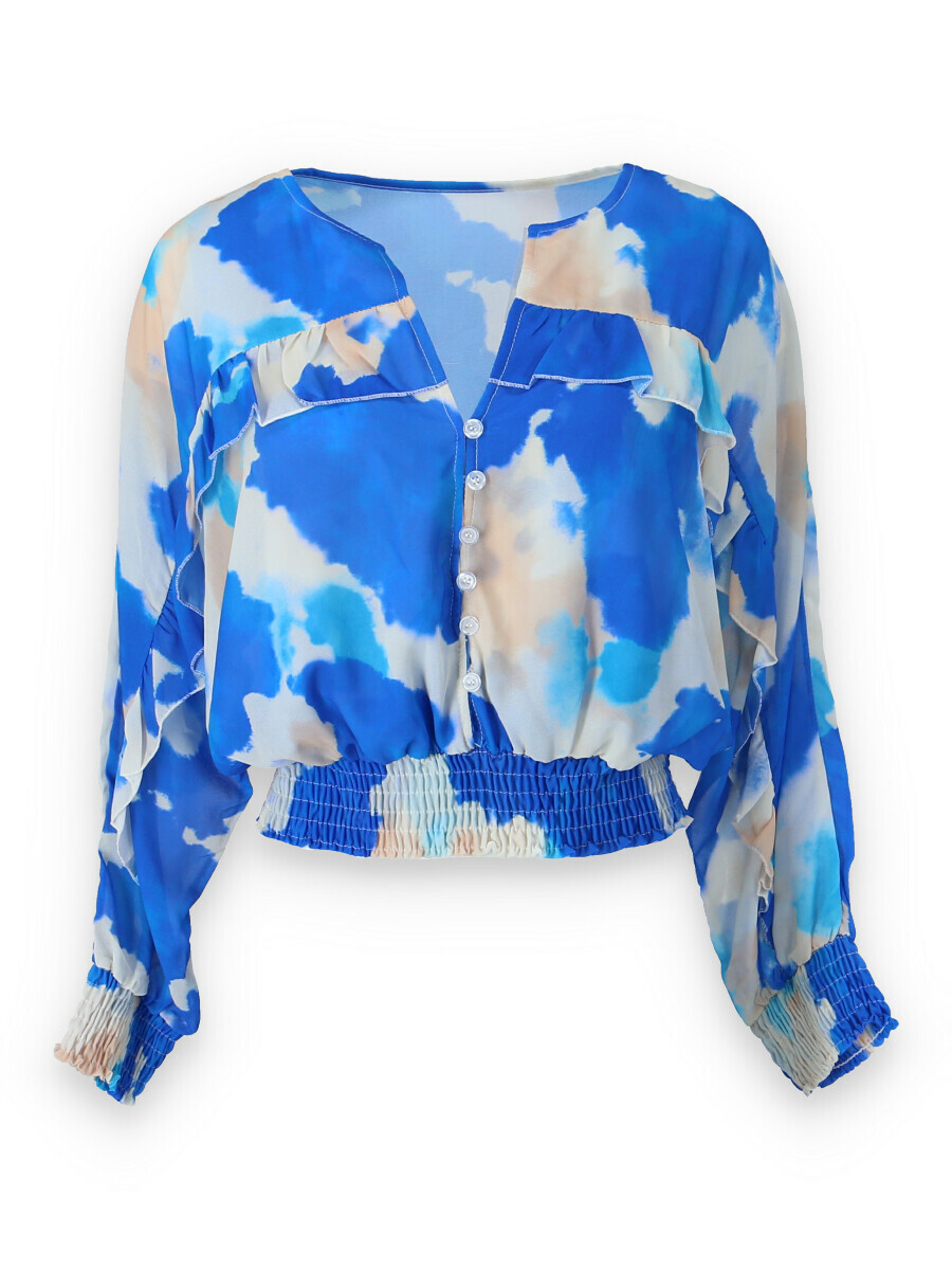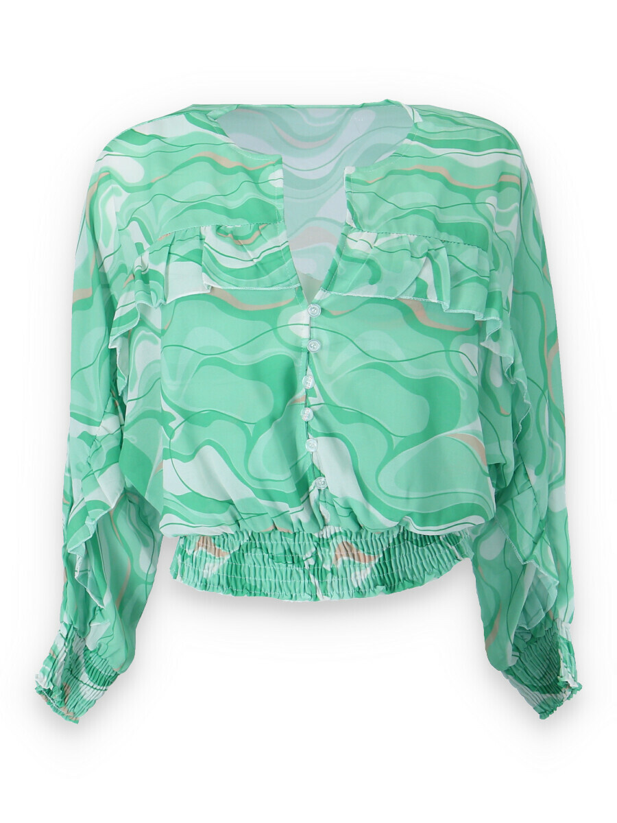Dámská pohodlná halenka se spodním lemem a rukávy do gumy, ozdobné volány na prsou a rukávech. Na předním díle z části knoflíky.