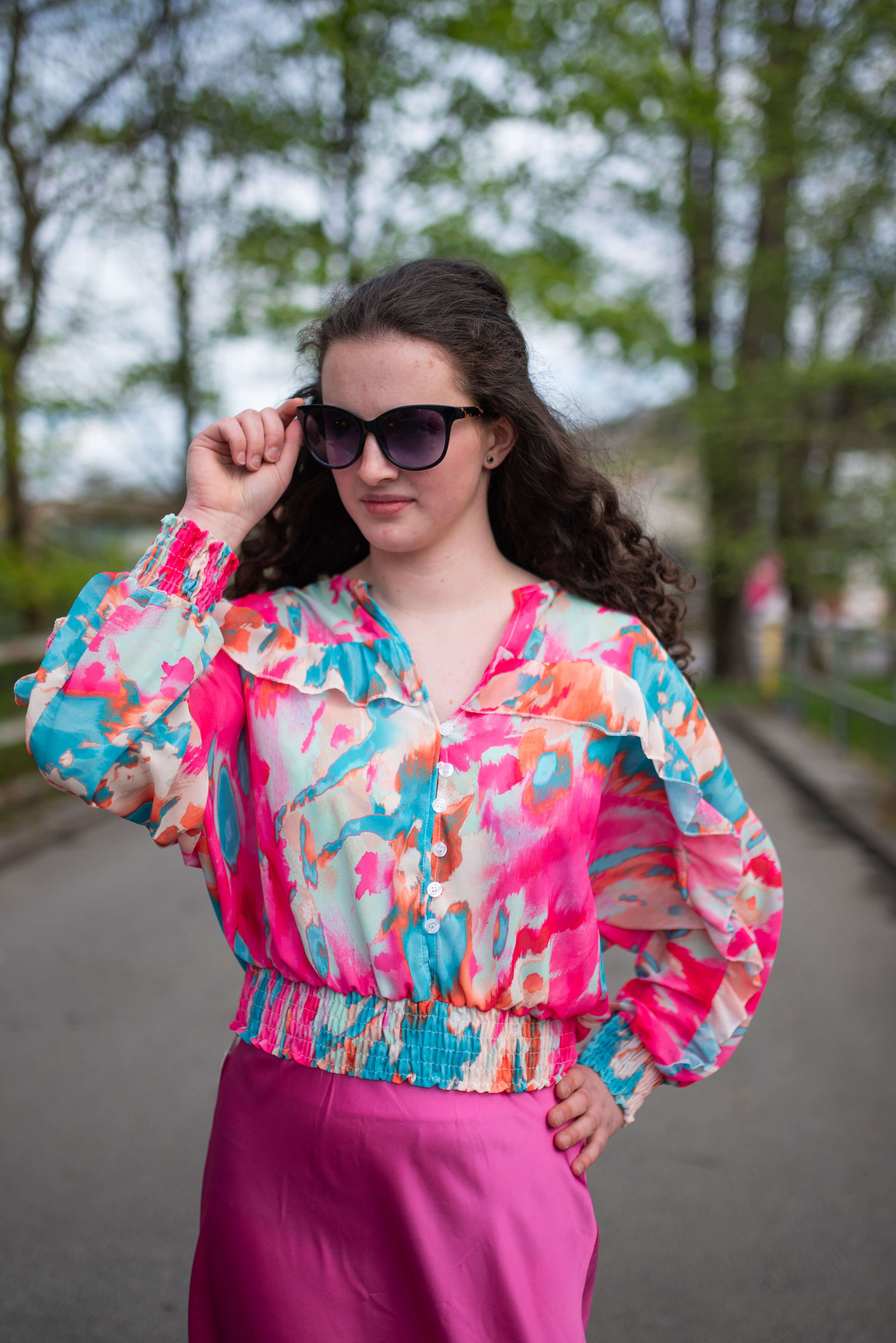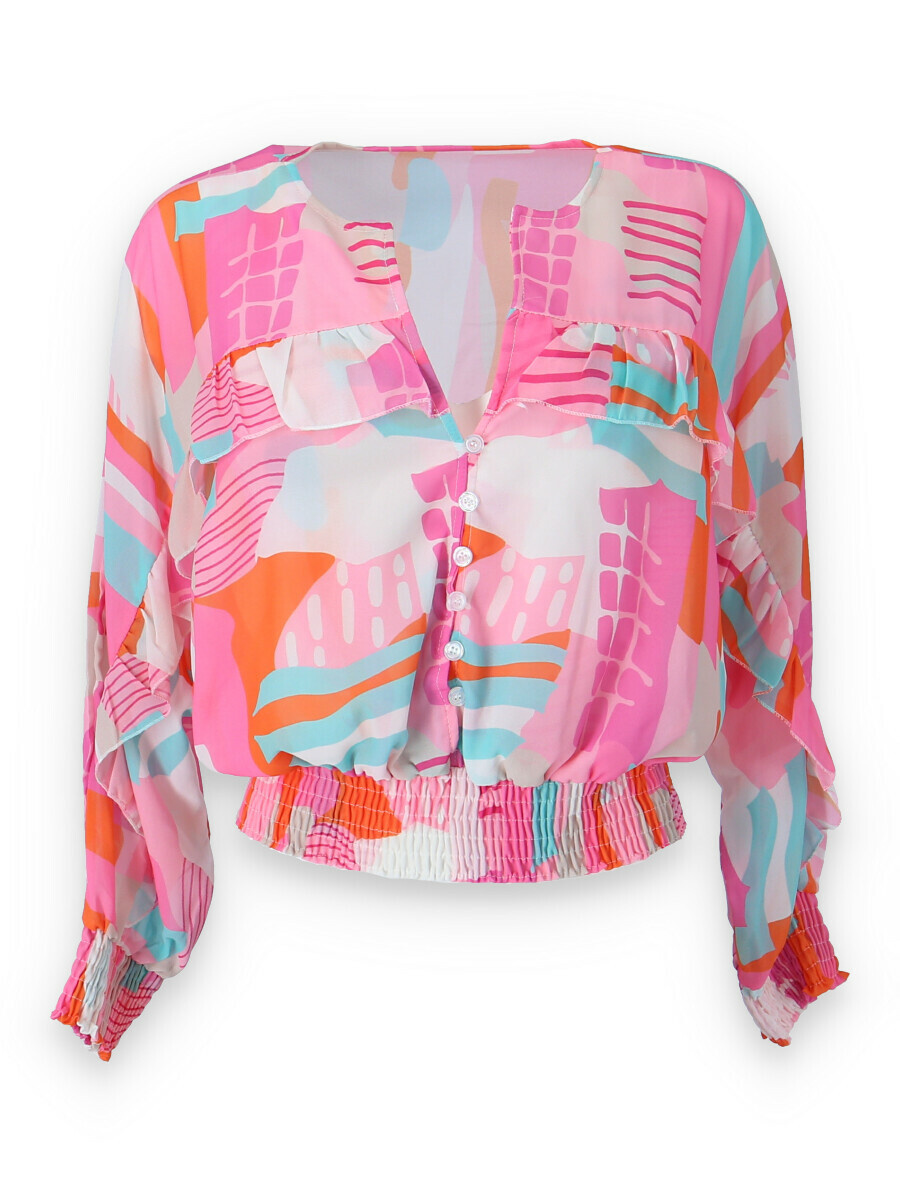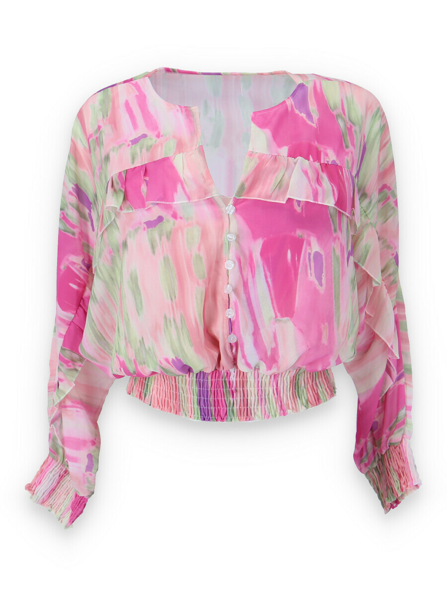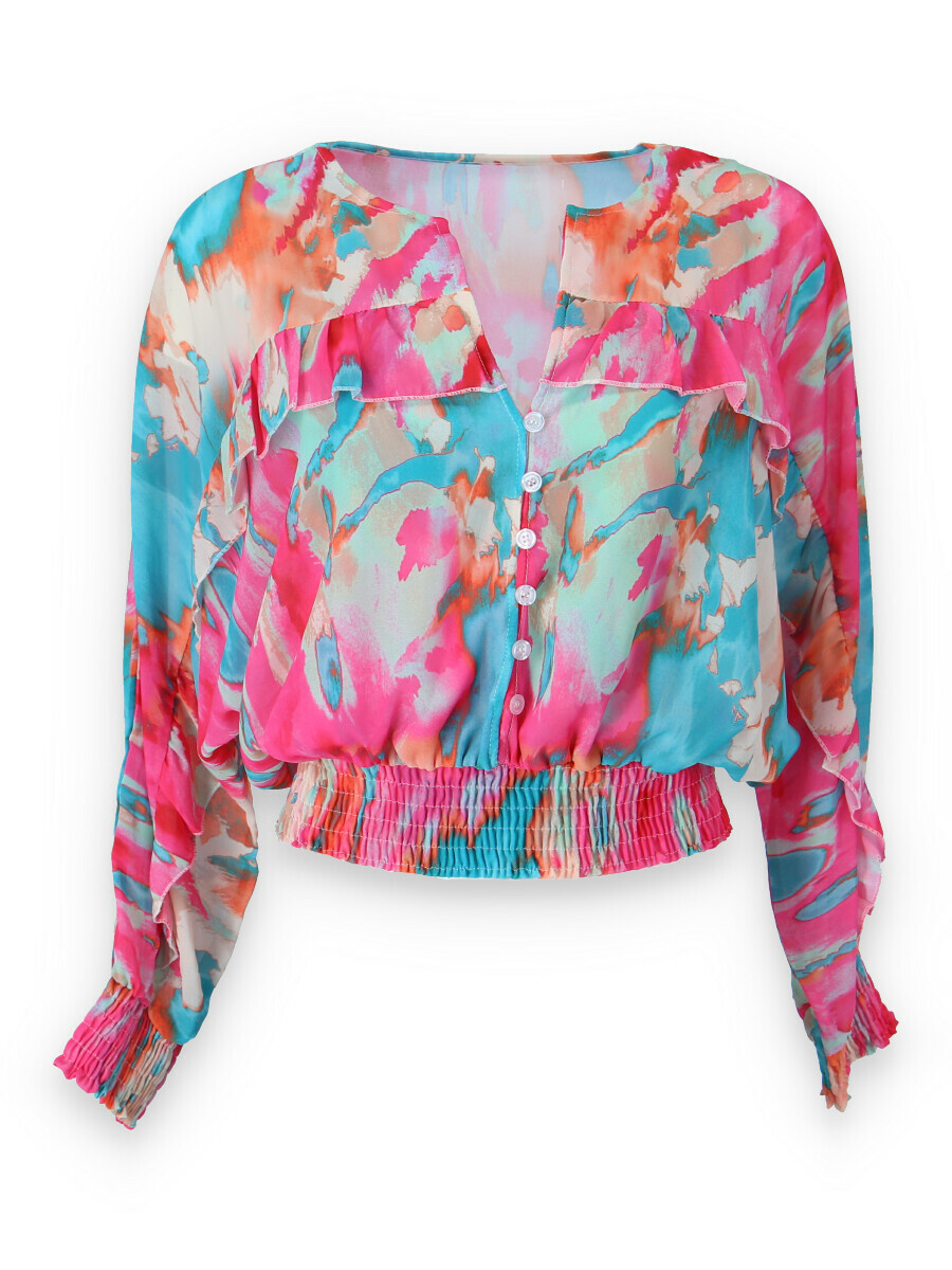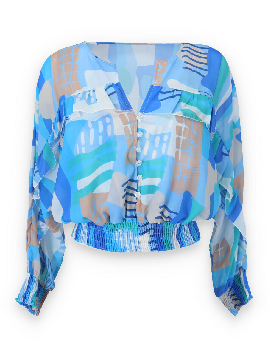 Dámská pohodlná halenka se spodním lemem a rukávy do gumy, ozdobné volány na prsou a rukávech. Na předním díle z části knoflíky.