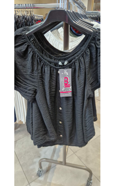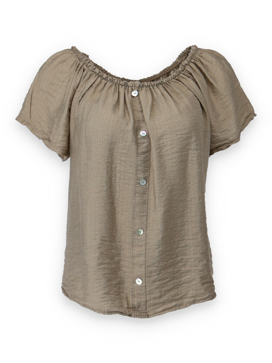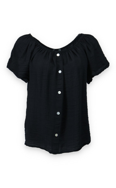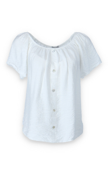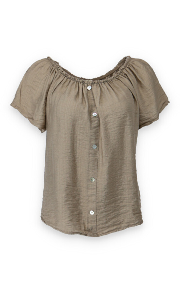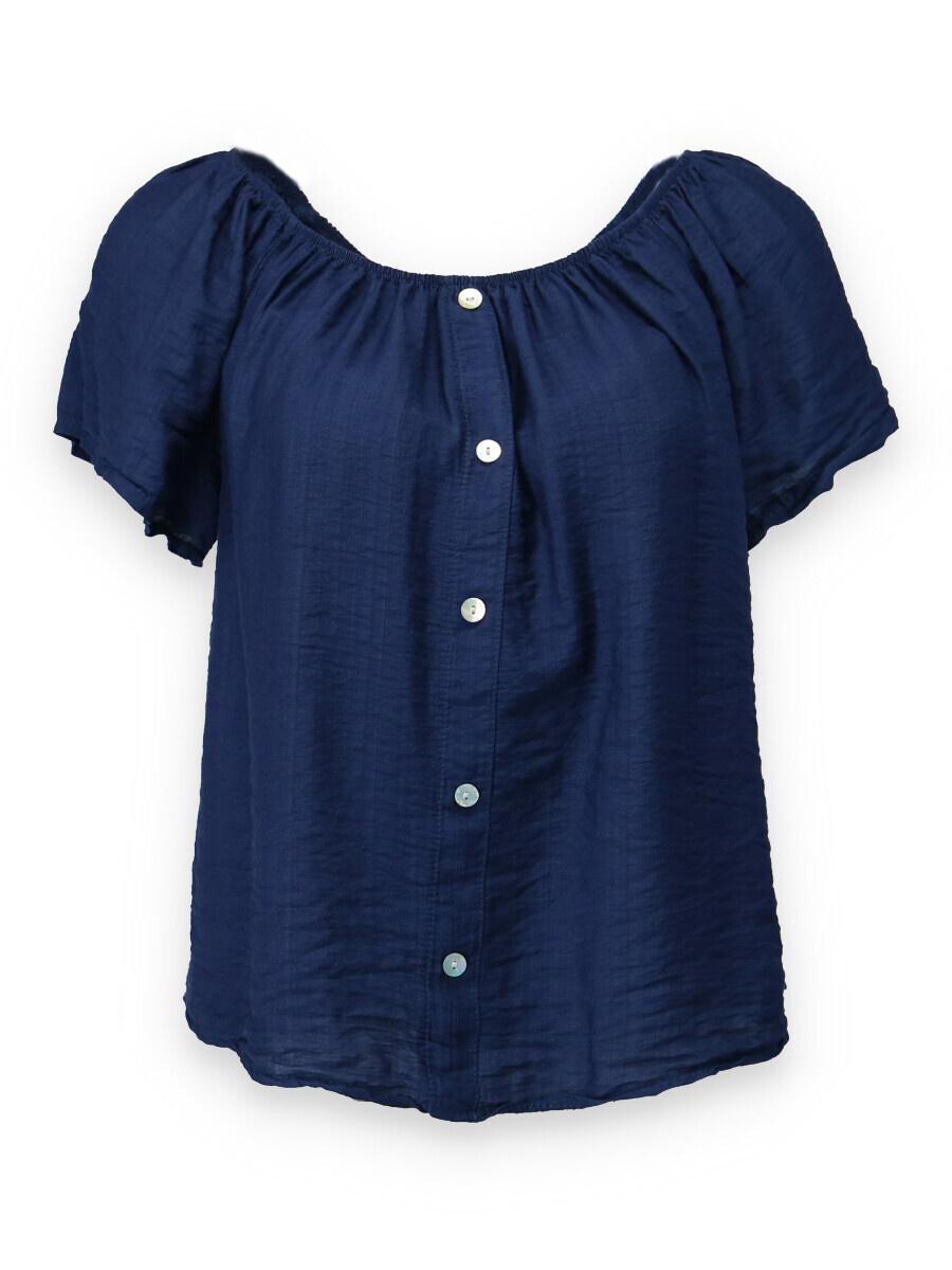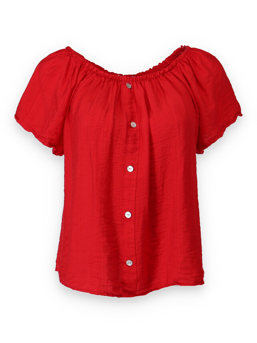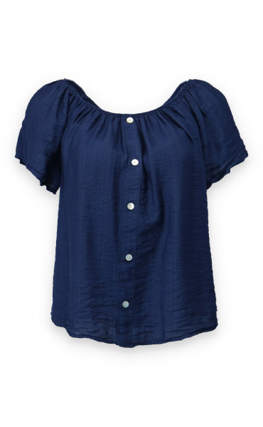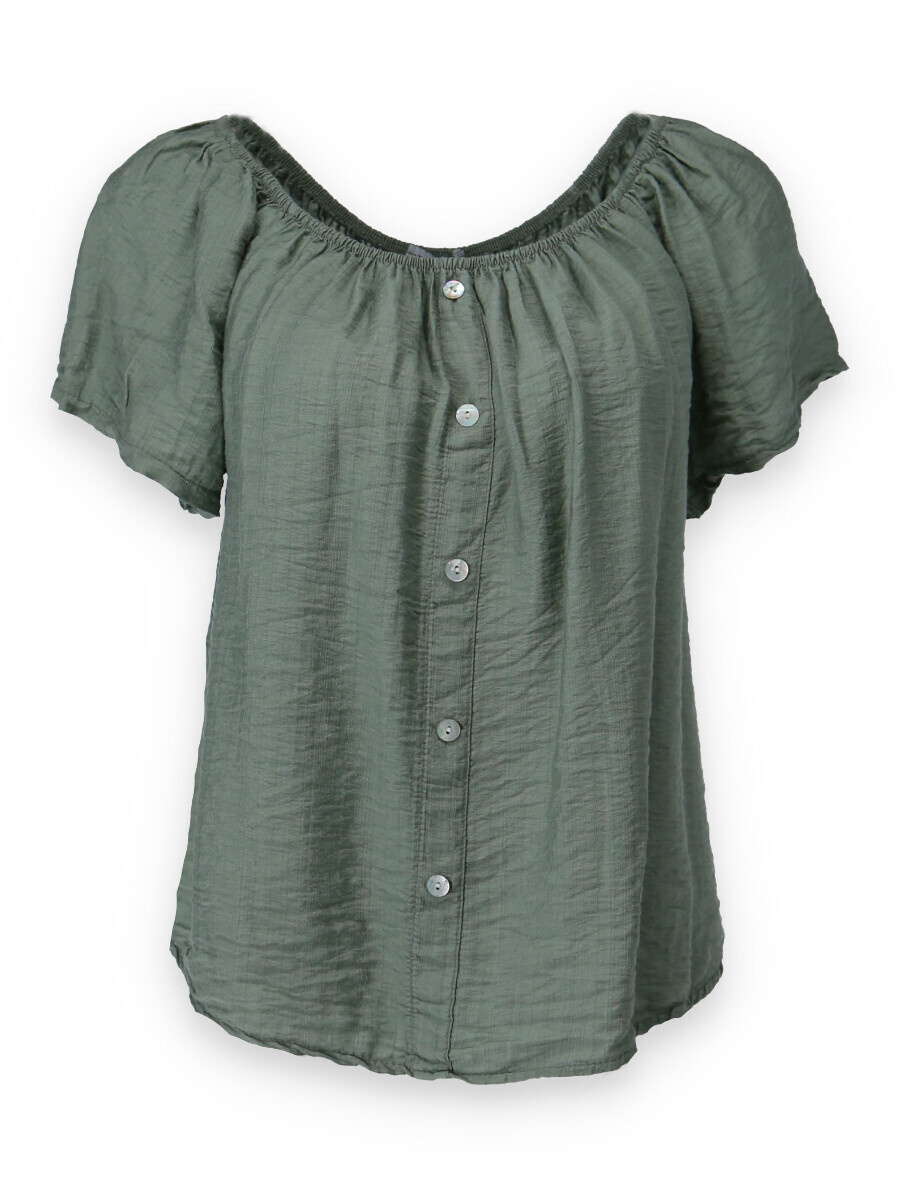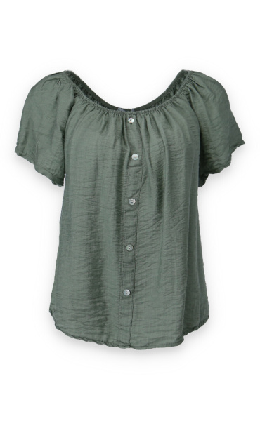 Dámská letní halenka s aplikací knoflíku na přední části. Halenka je lemovaná gumičkou, jde tedy stáhnout i přes ramena, vyrobeno v Itálii