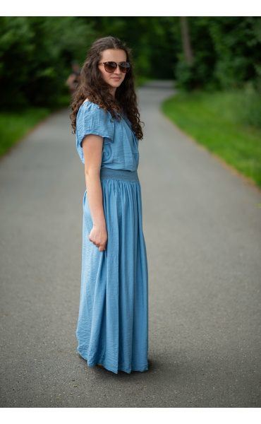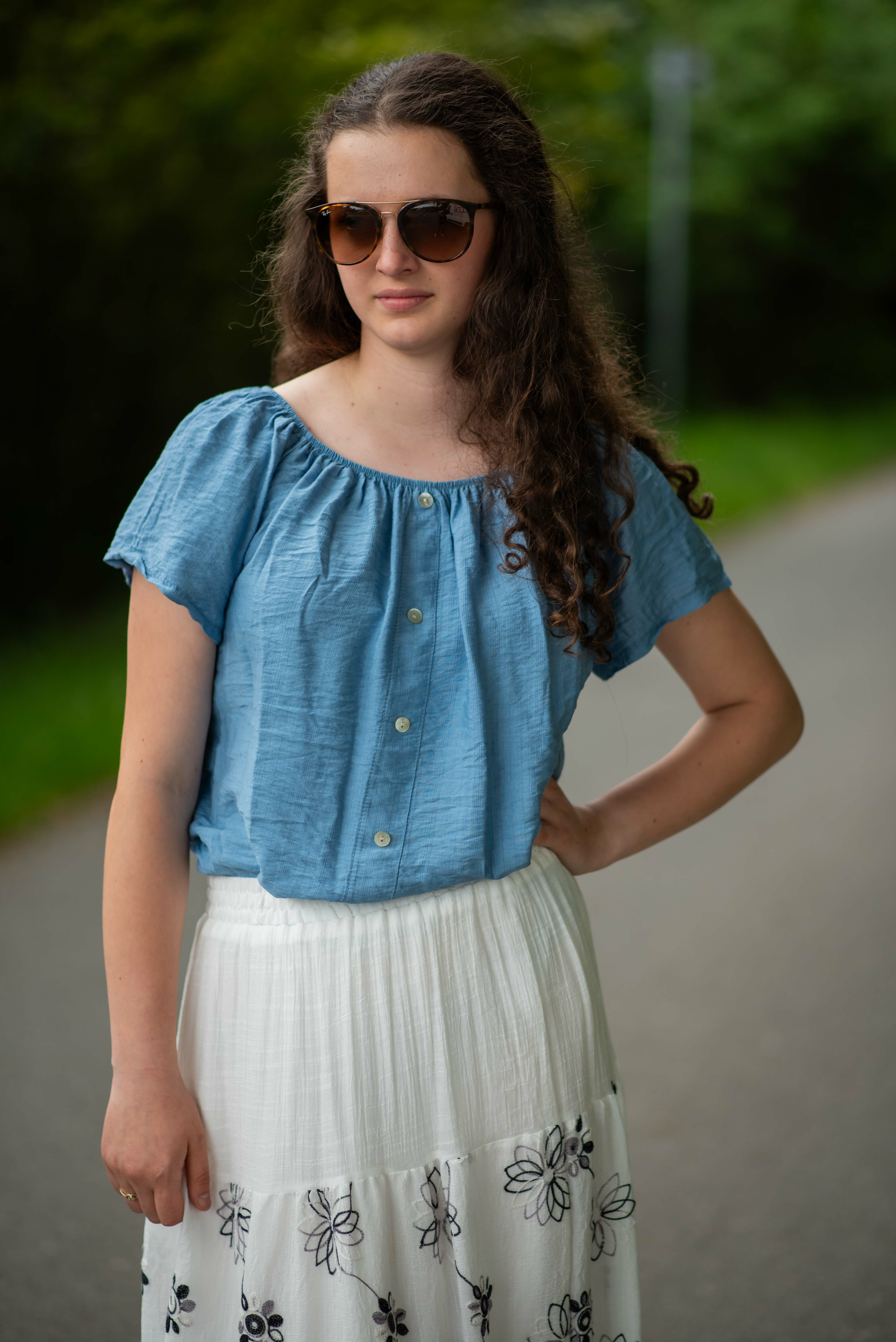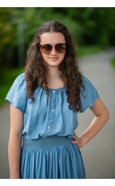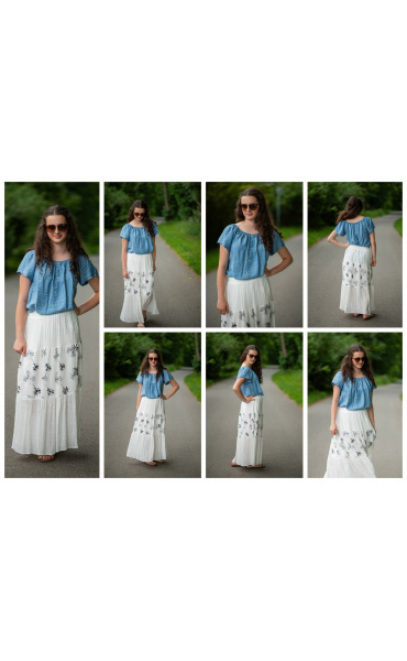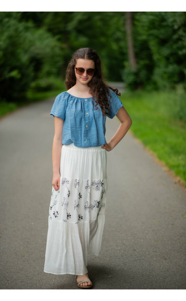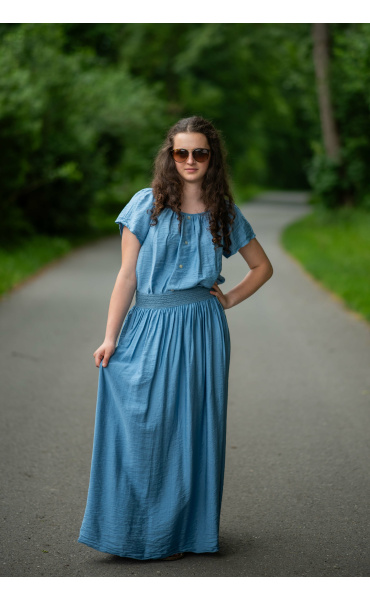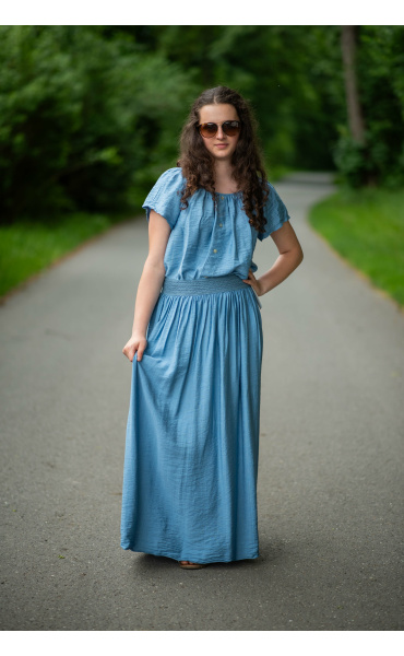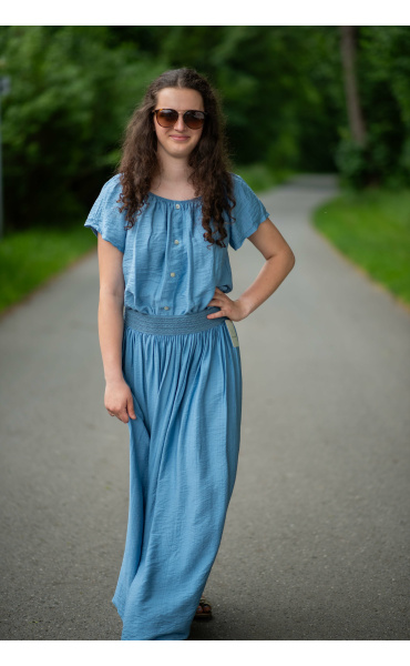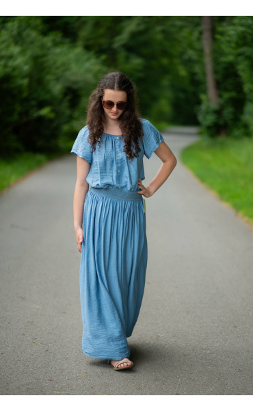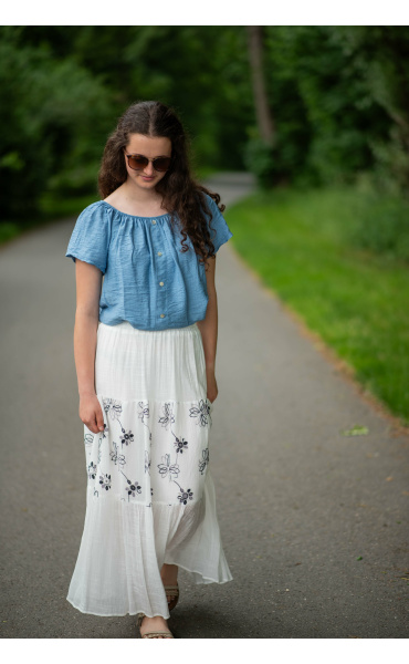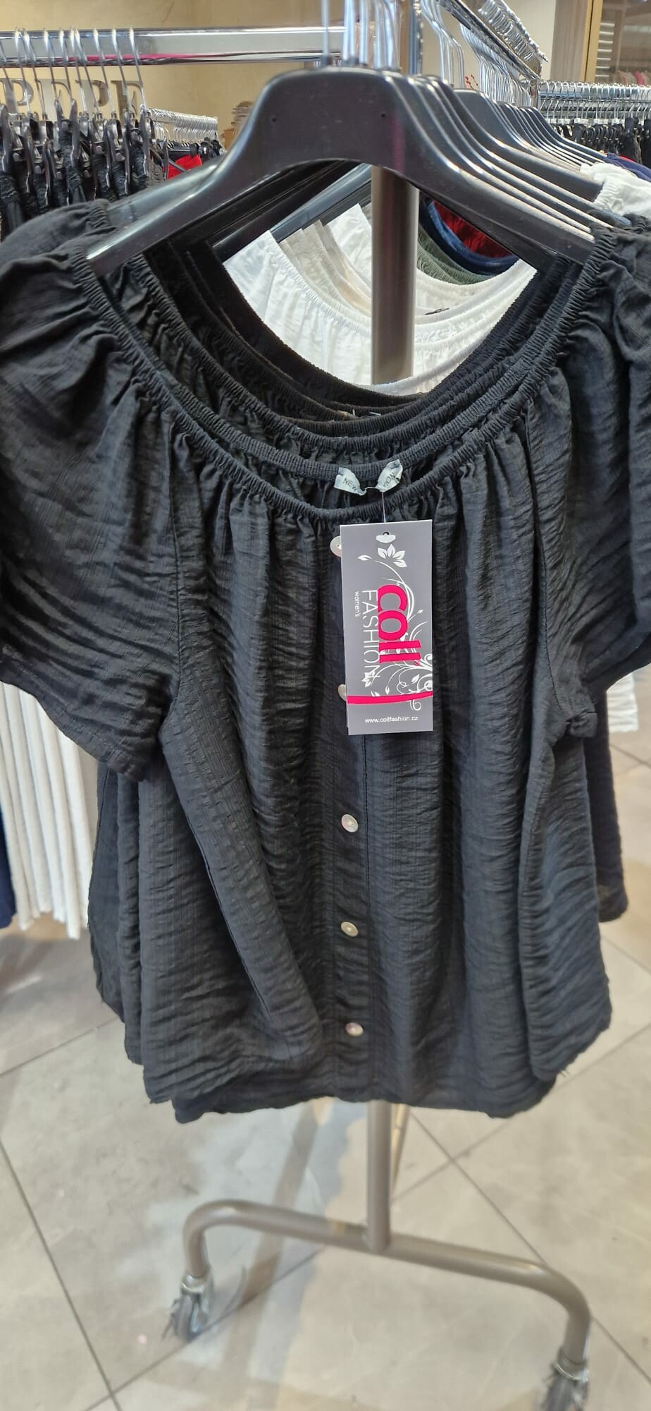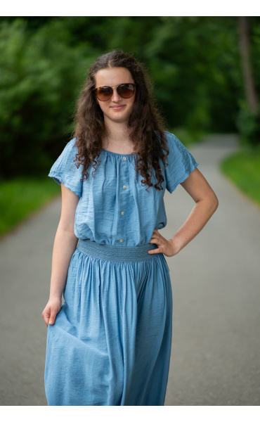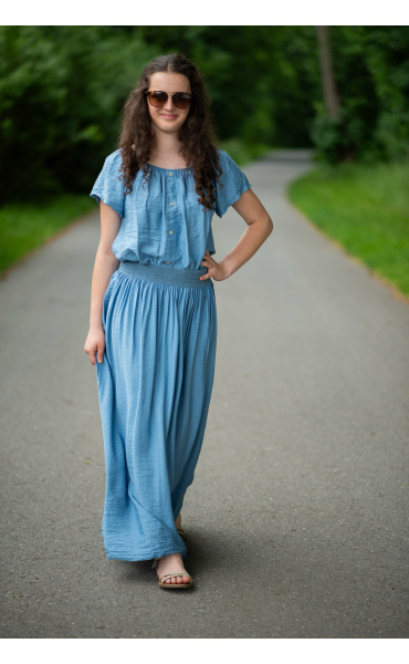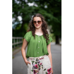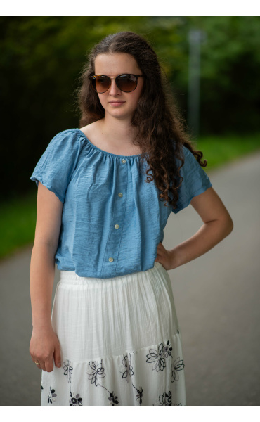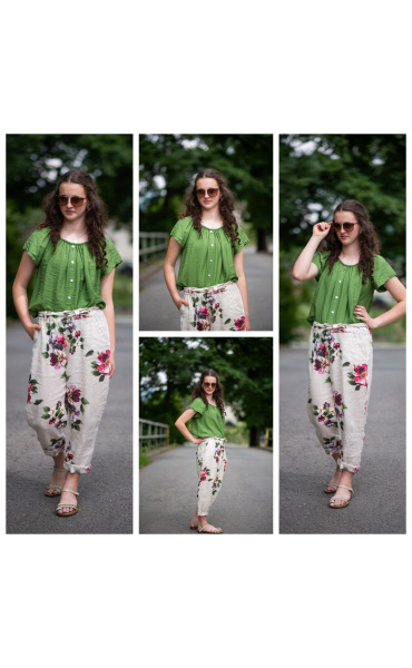 Dámská letní halenka s aplikací knoflíku na přední části. Halenka je lemovaná gumičkou, jde tedy stáhnout i přes ramena, vyrobeno v Itálii