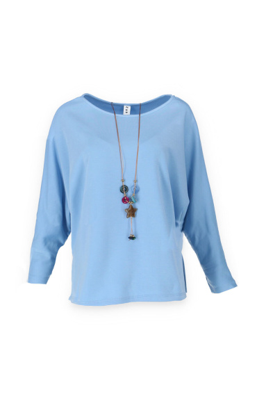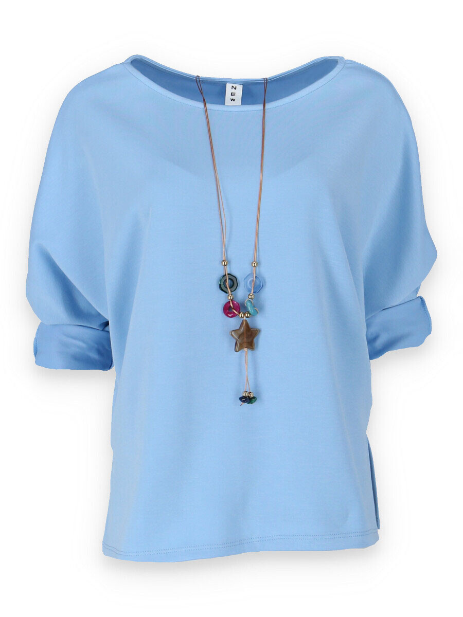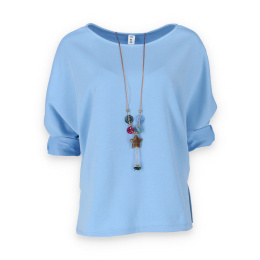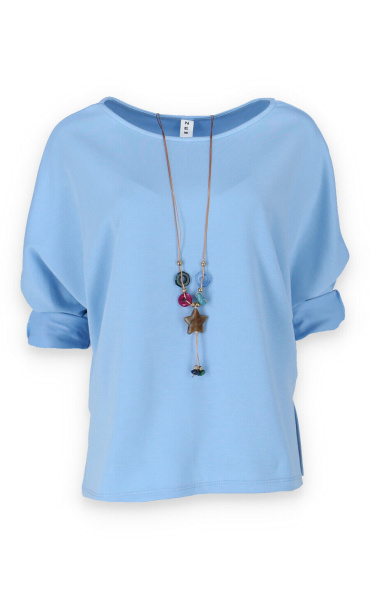 Dámská halenka s raglánovým rukávem, doplněna přívěškem.