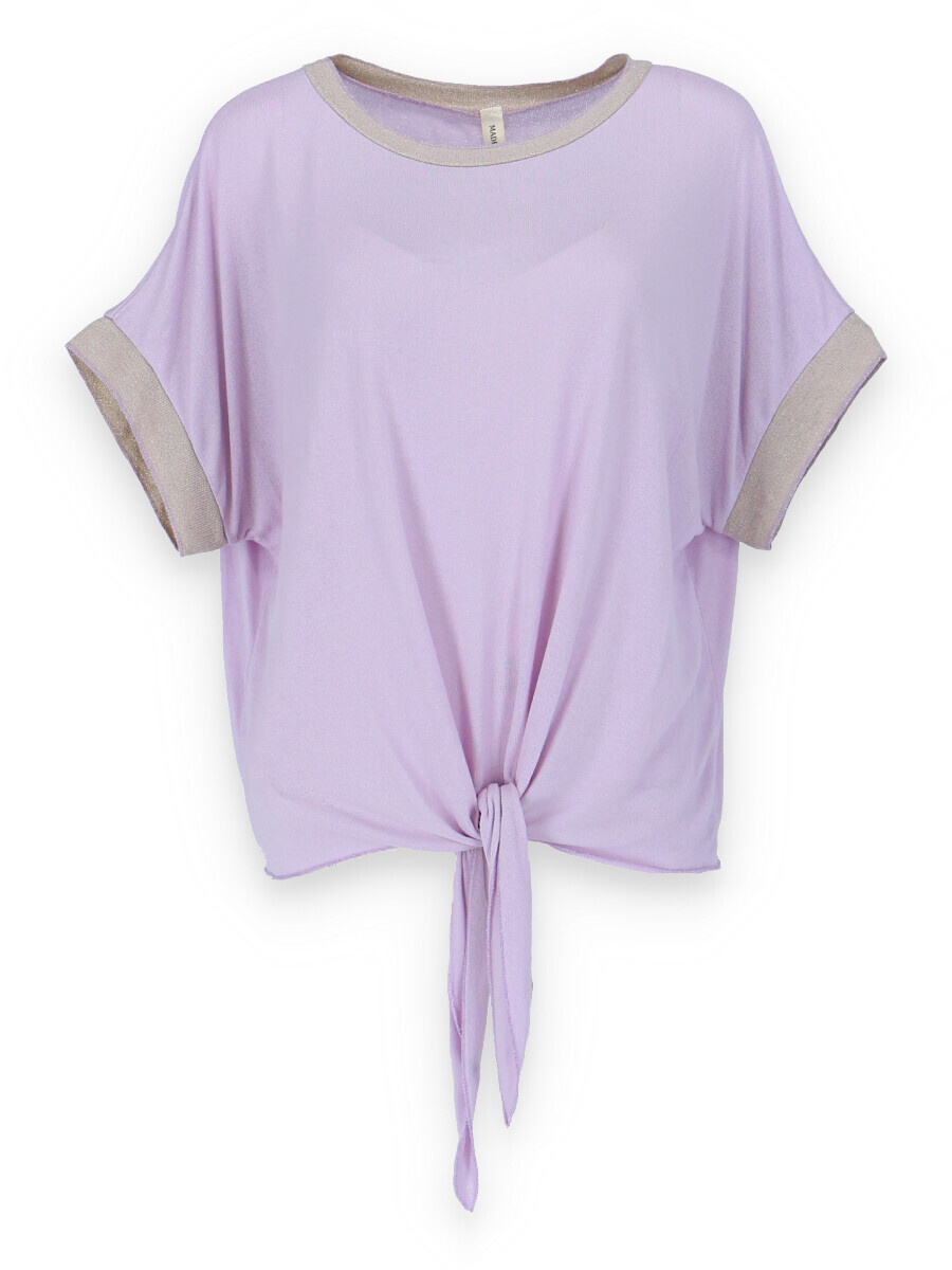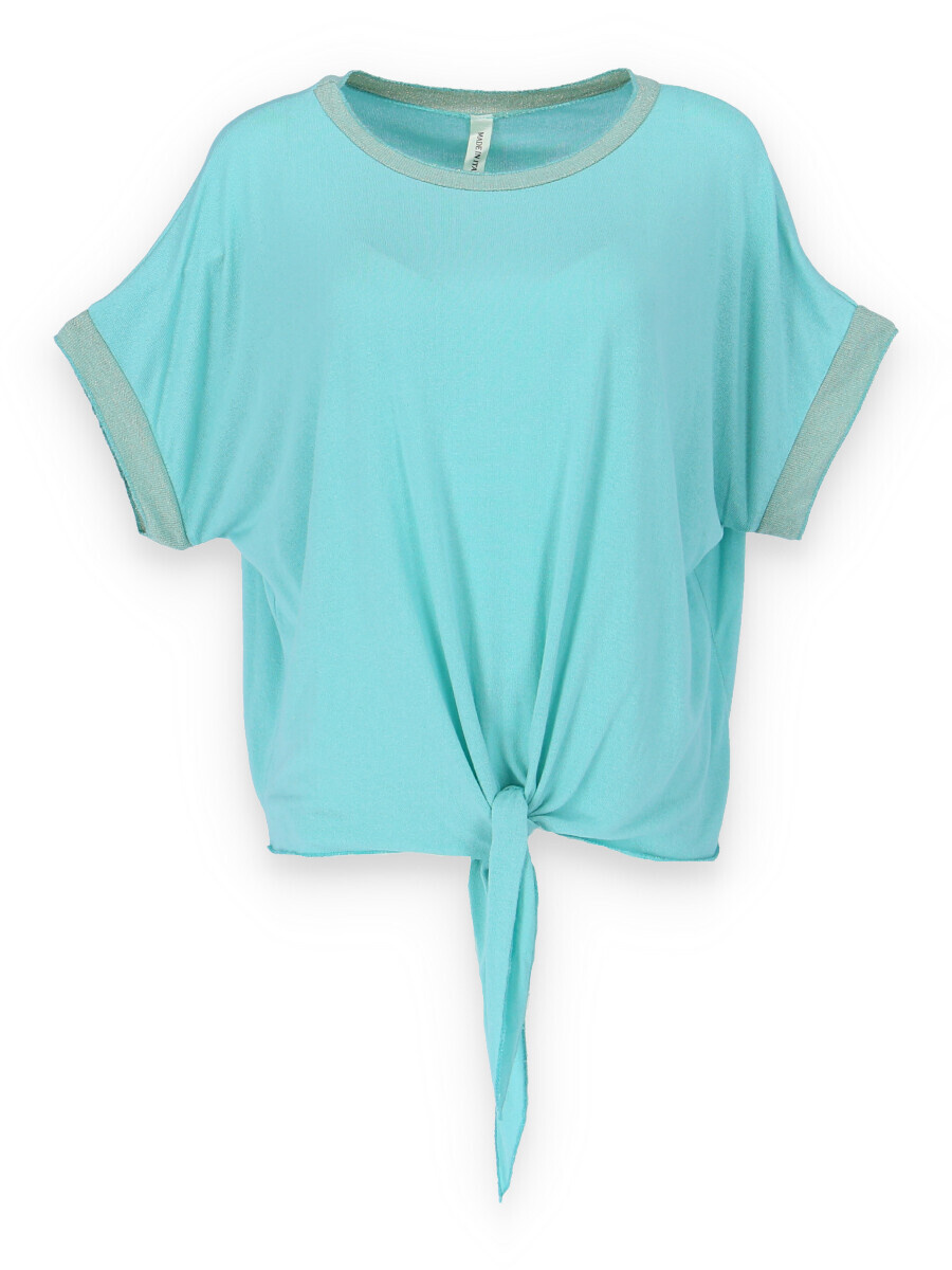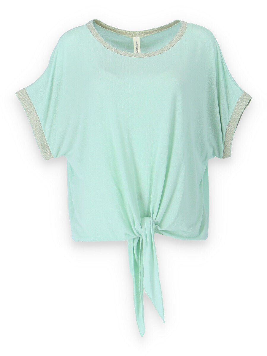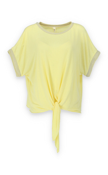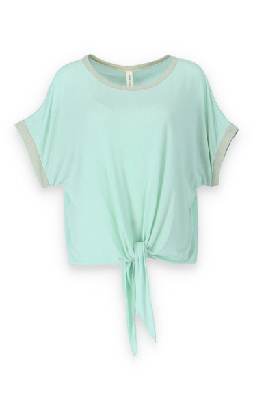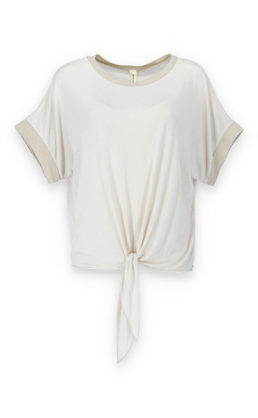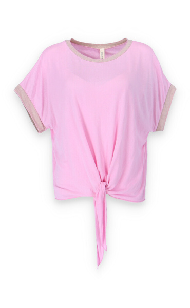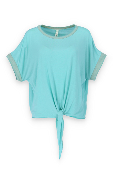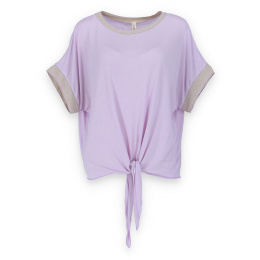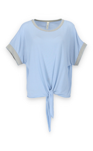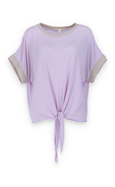 Dámská halenka s vázáním v pase volnějšího střihu. Halenka má krátký rukáv a kulatý výstřih.