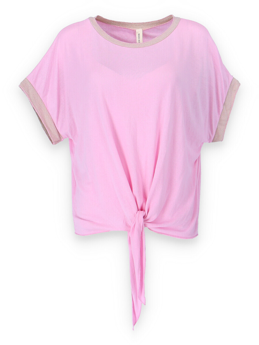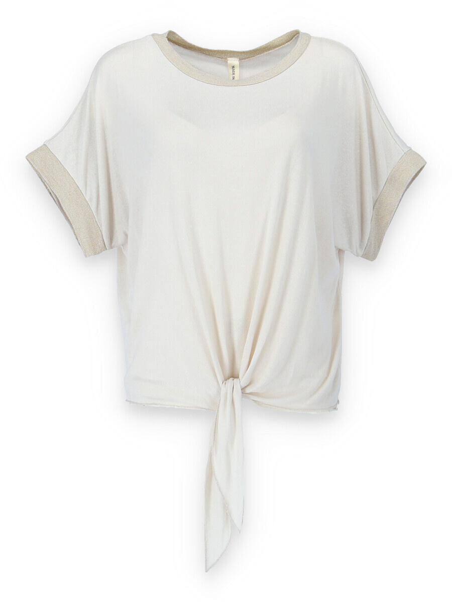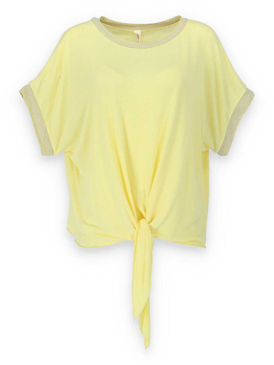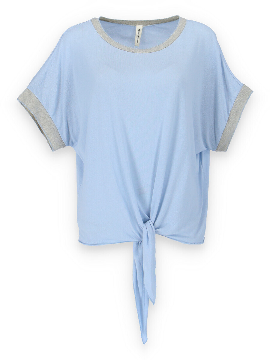 Dámská halenka s vázáním v pase volnějšího střihu. Halenka má krátký rukáv a kulatý výstřih.