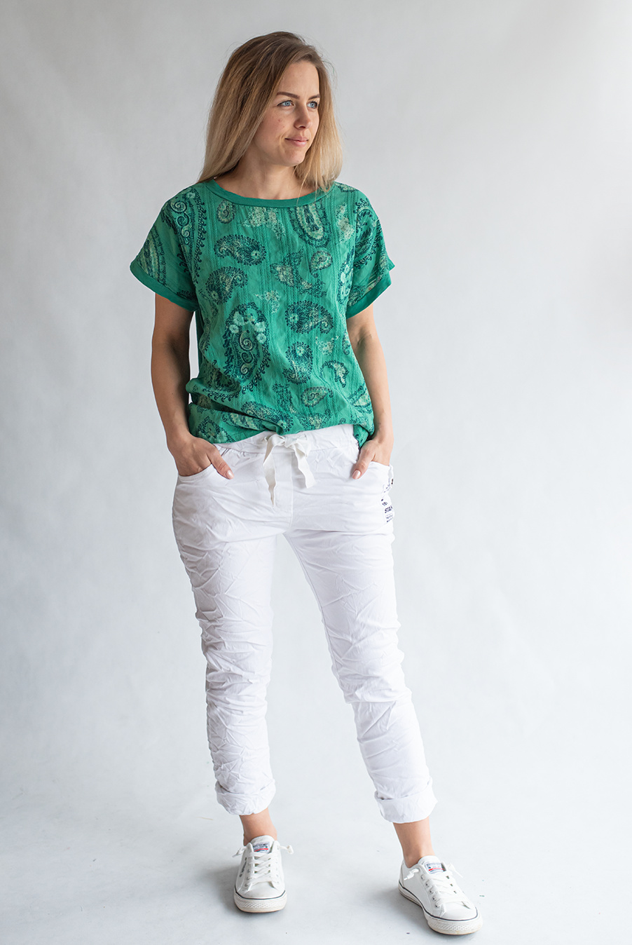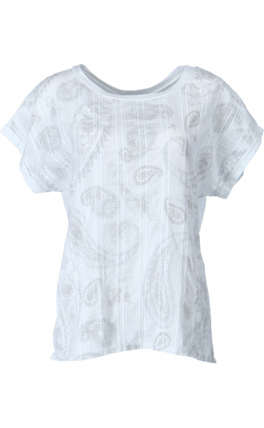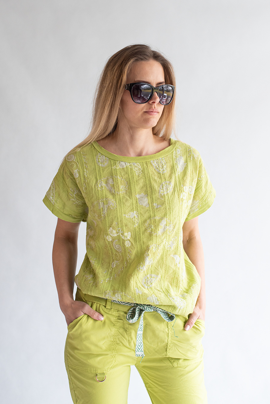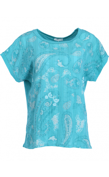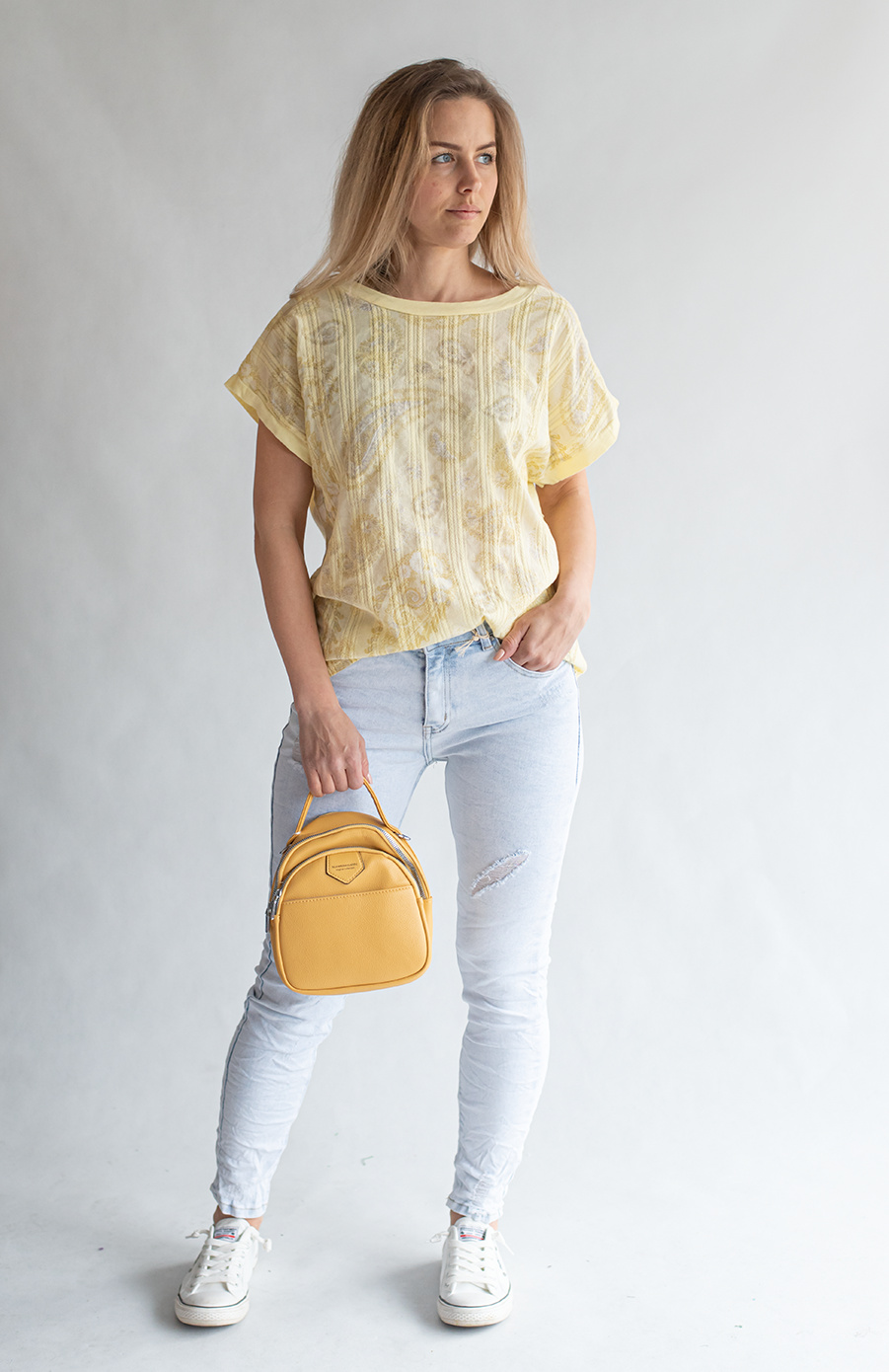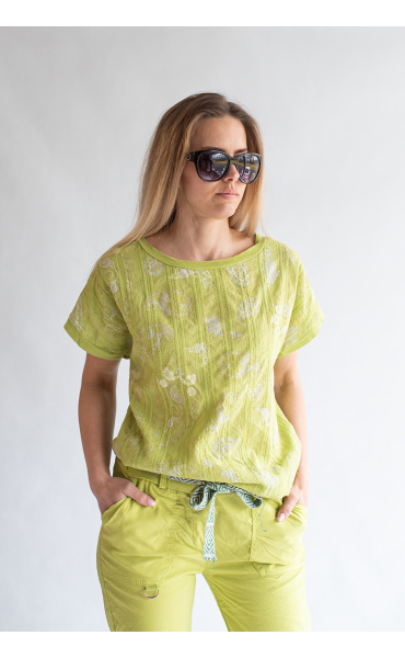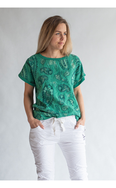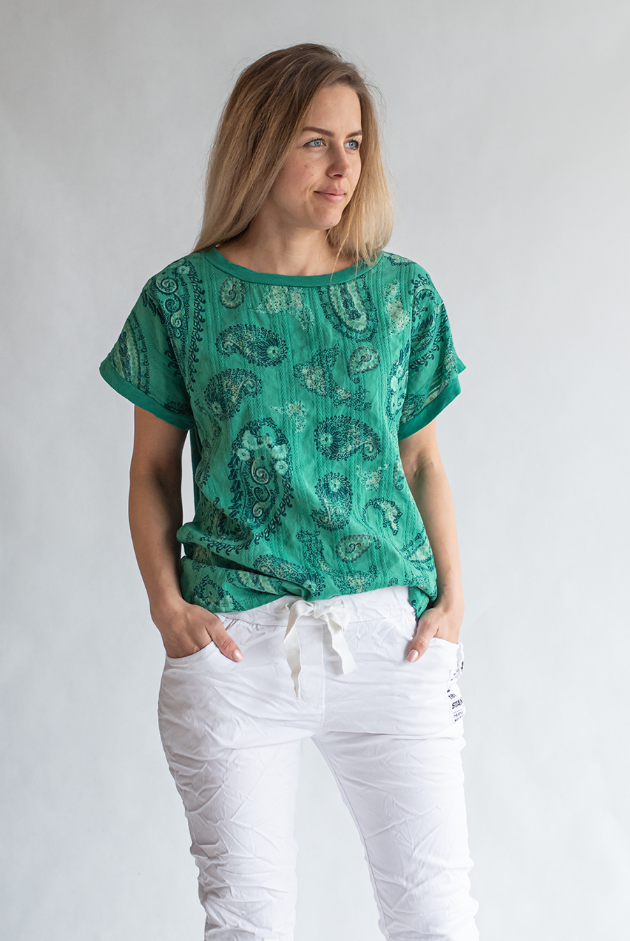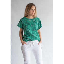 Módní dámská bavlněná halenka volnějšího střihu a krátkým rukávem.