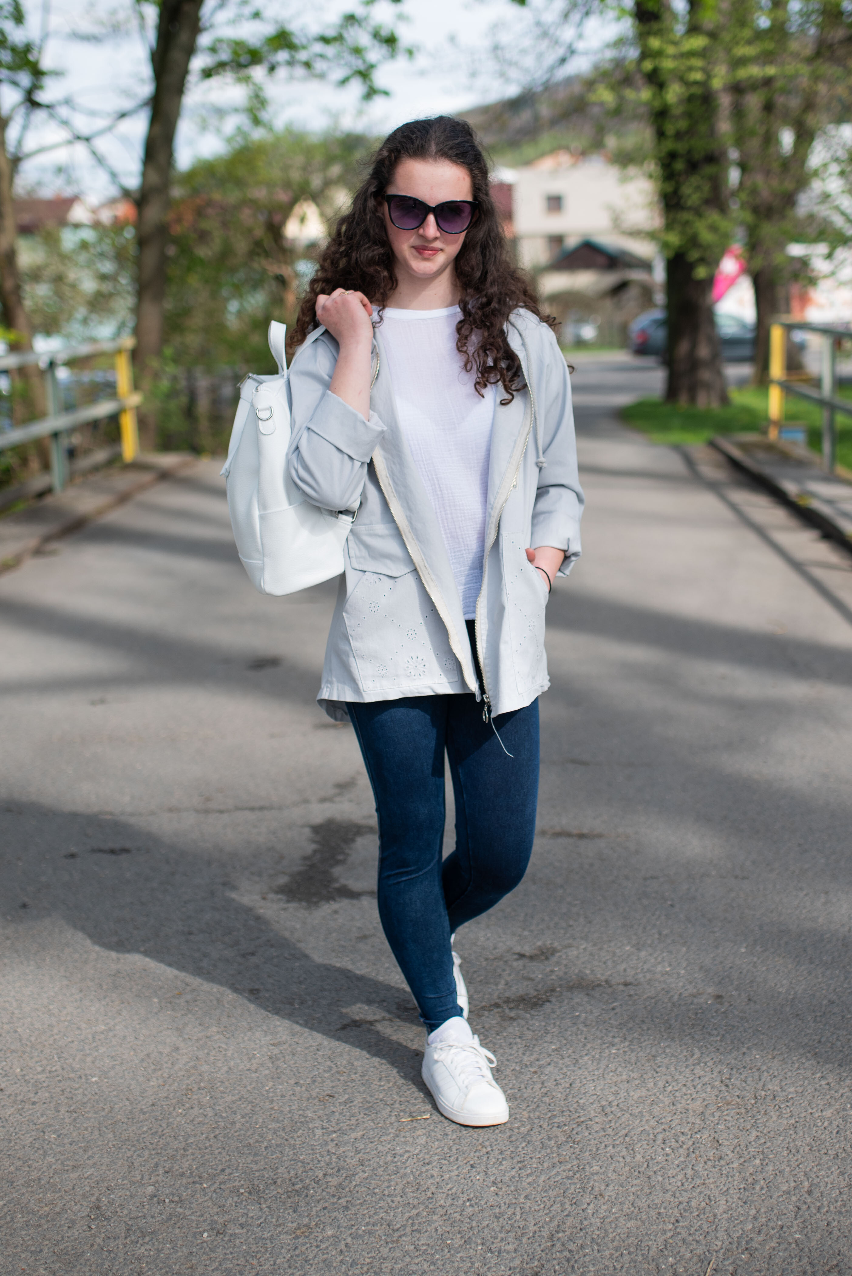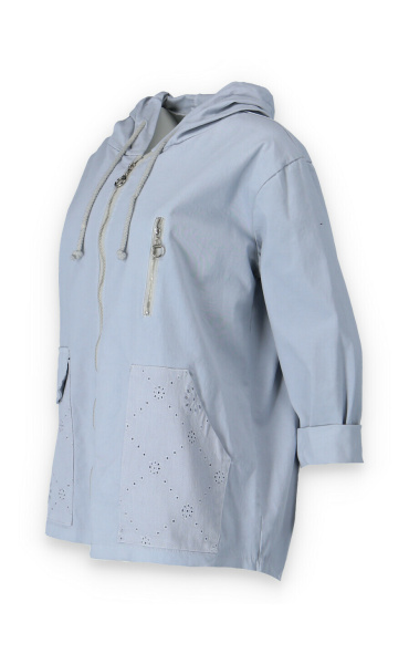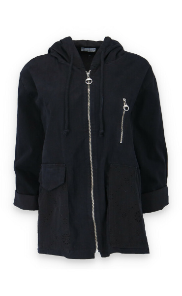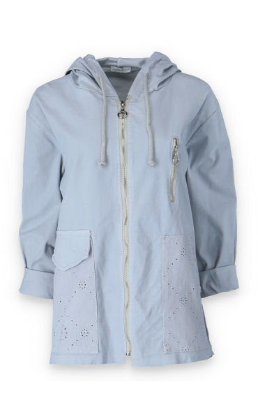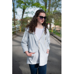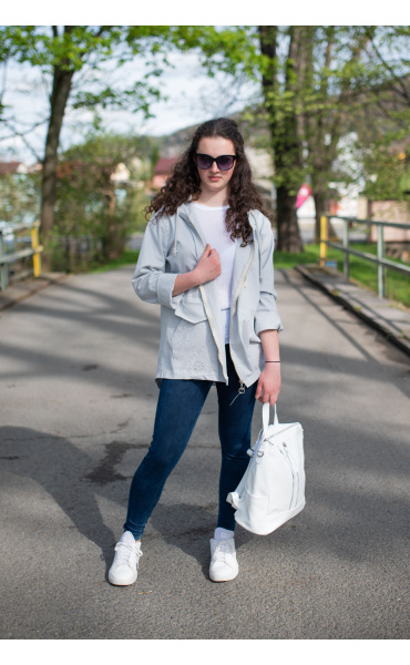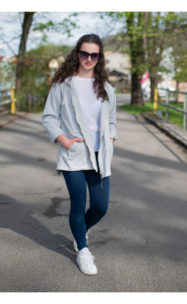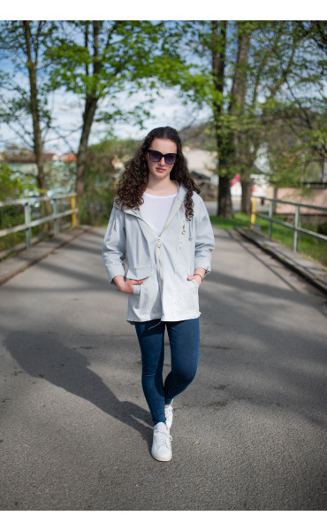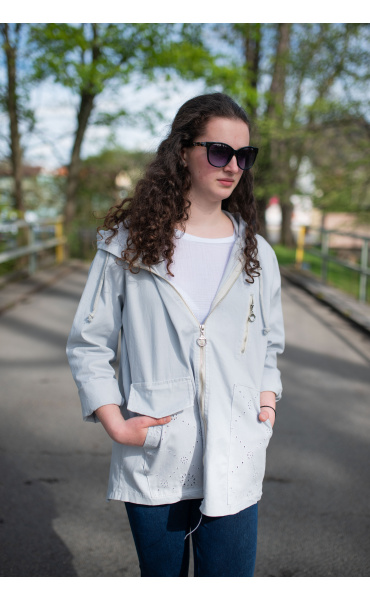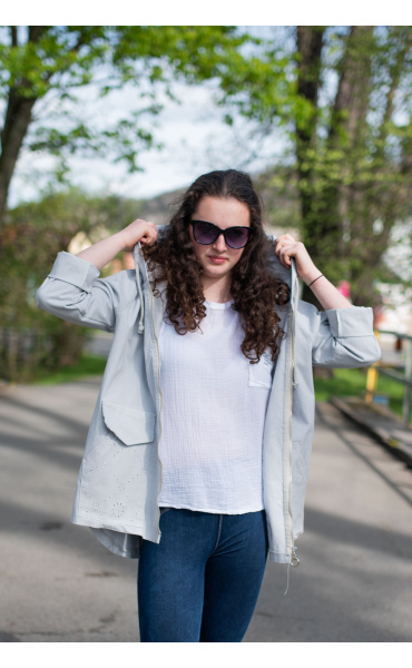 Lehká bavlněná jarní bunda/kabátek, s kapucí, přední kapsy, výšivky na kapsách
