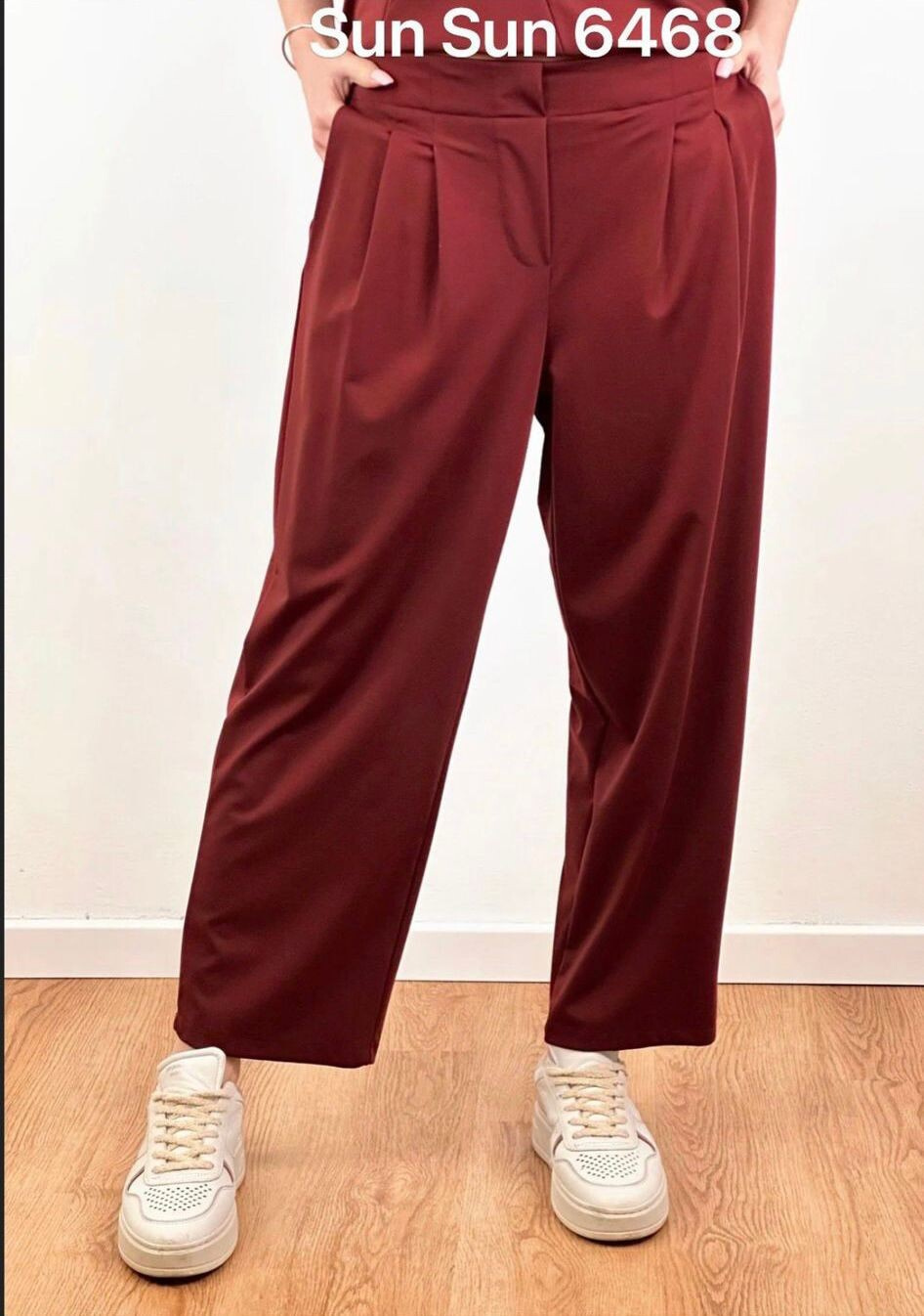Dámské kalhoty 7/8 délky v pase do gumy. Kalhoty mají všité kapsy po stranách. Vyrobeno v Itálii.