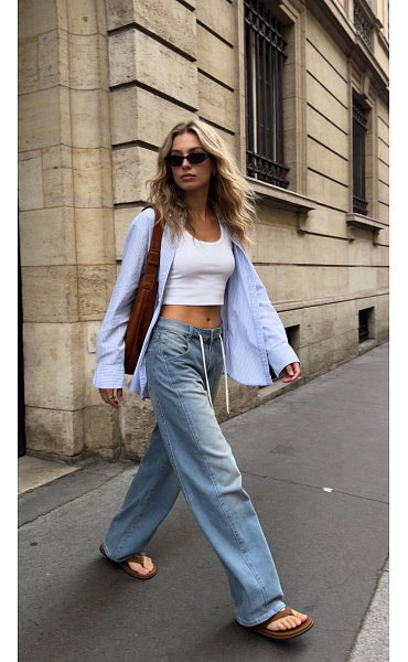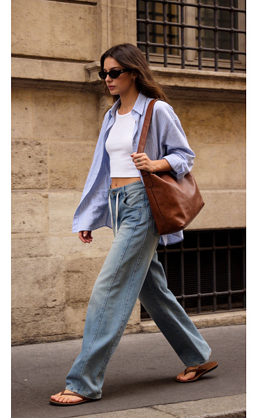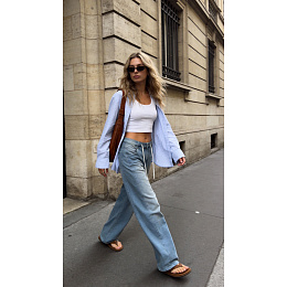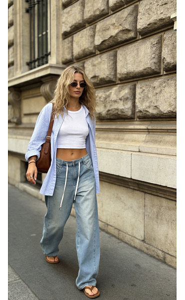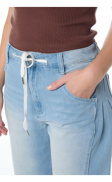 Módní džínové kalhoty balónového střihu doplněny šňůrkou v pase.
