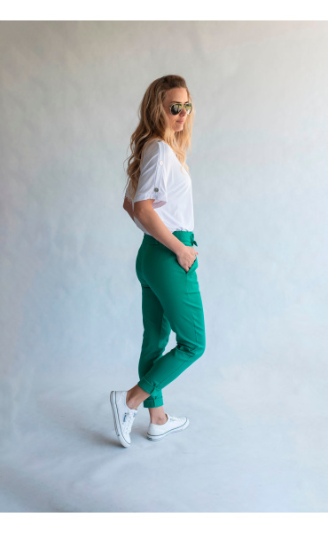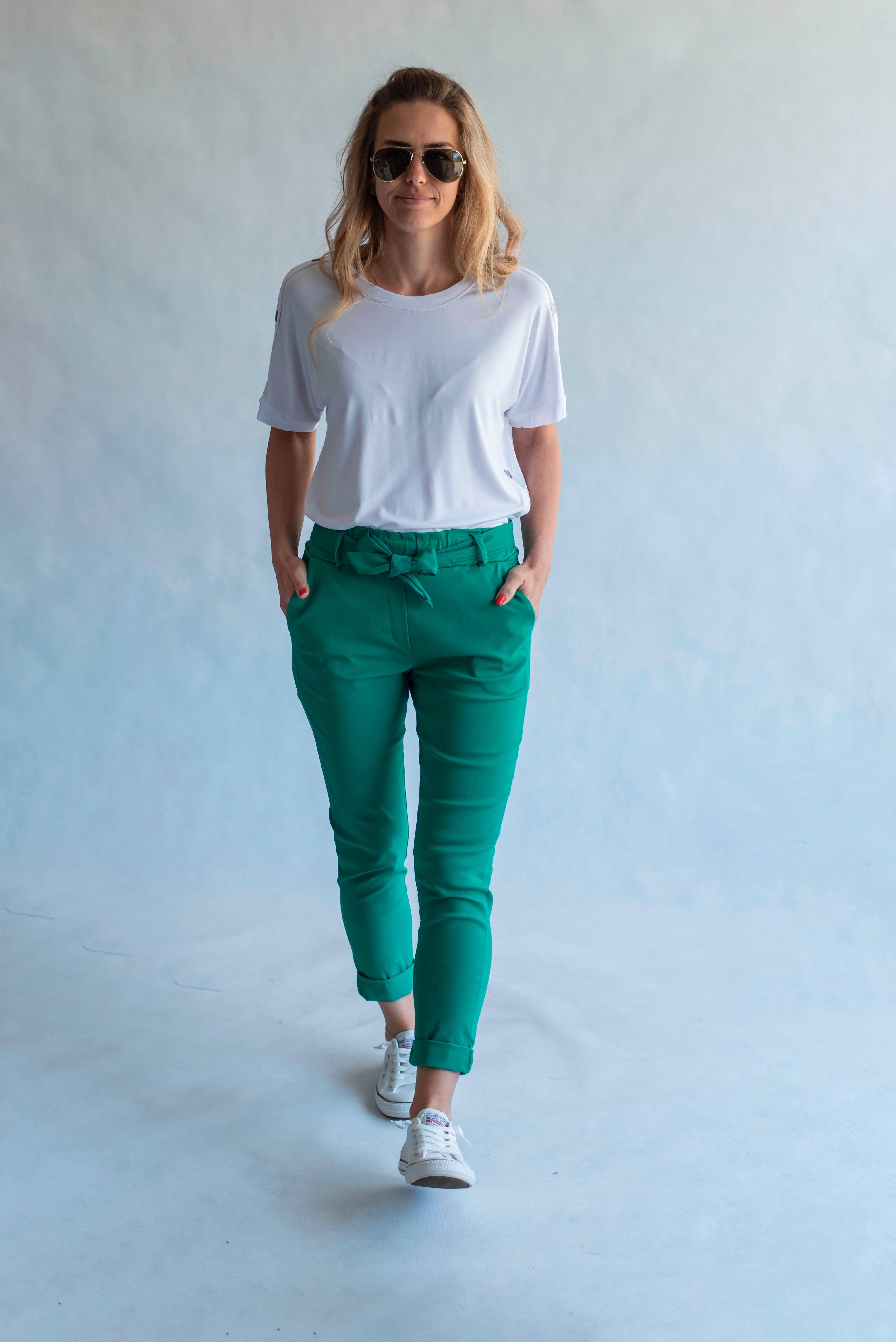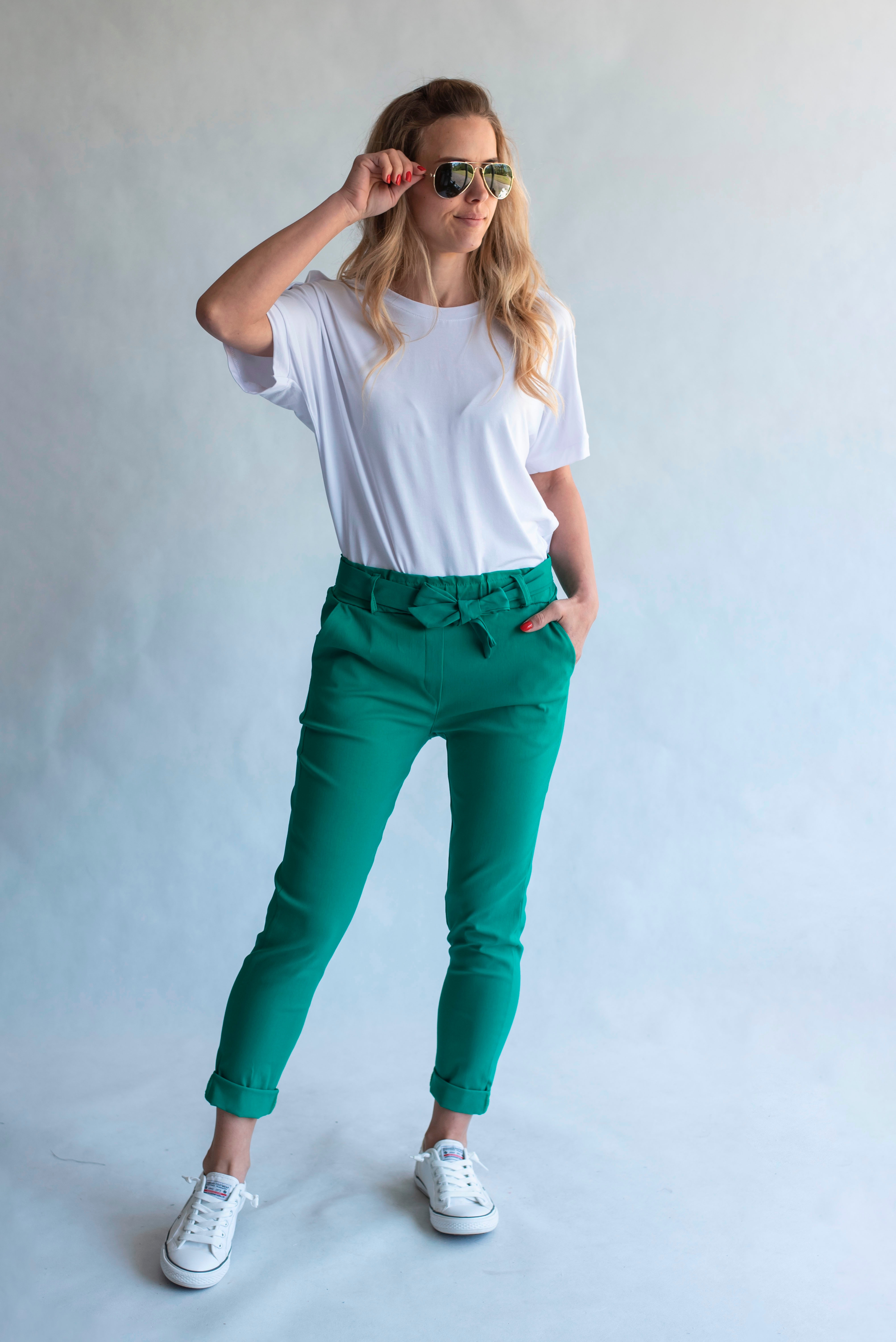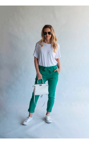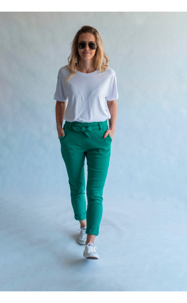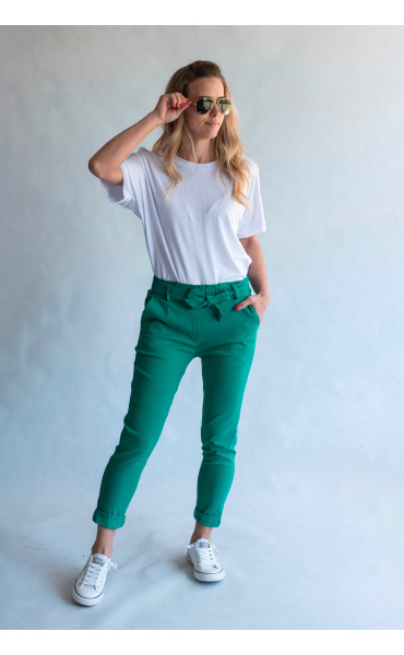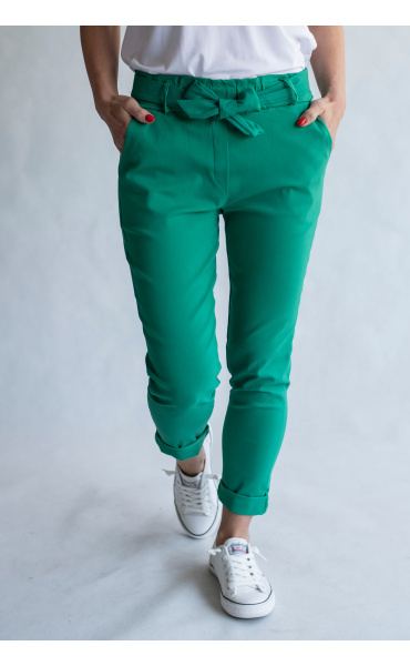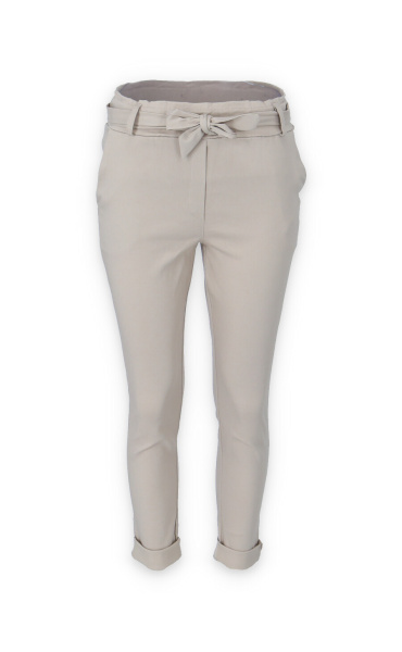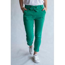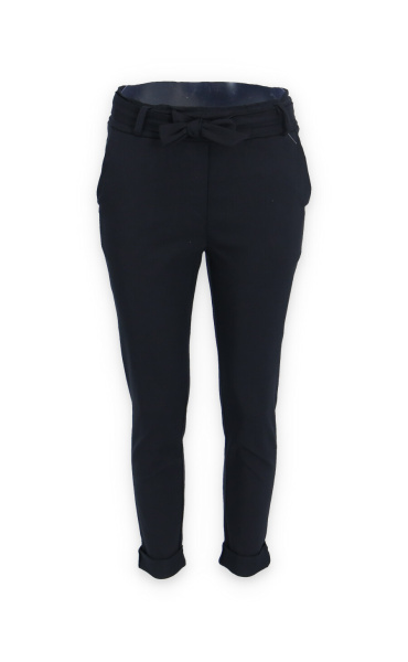 Módní kalhoty pohodlného střihu, elastický pas, opasek a 2x přední kapsy, vázaní na mašli v pase
