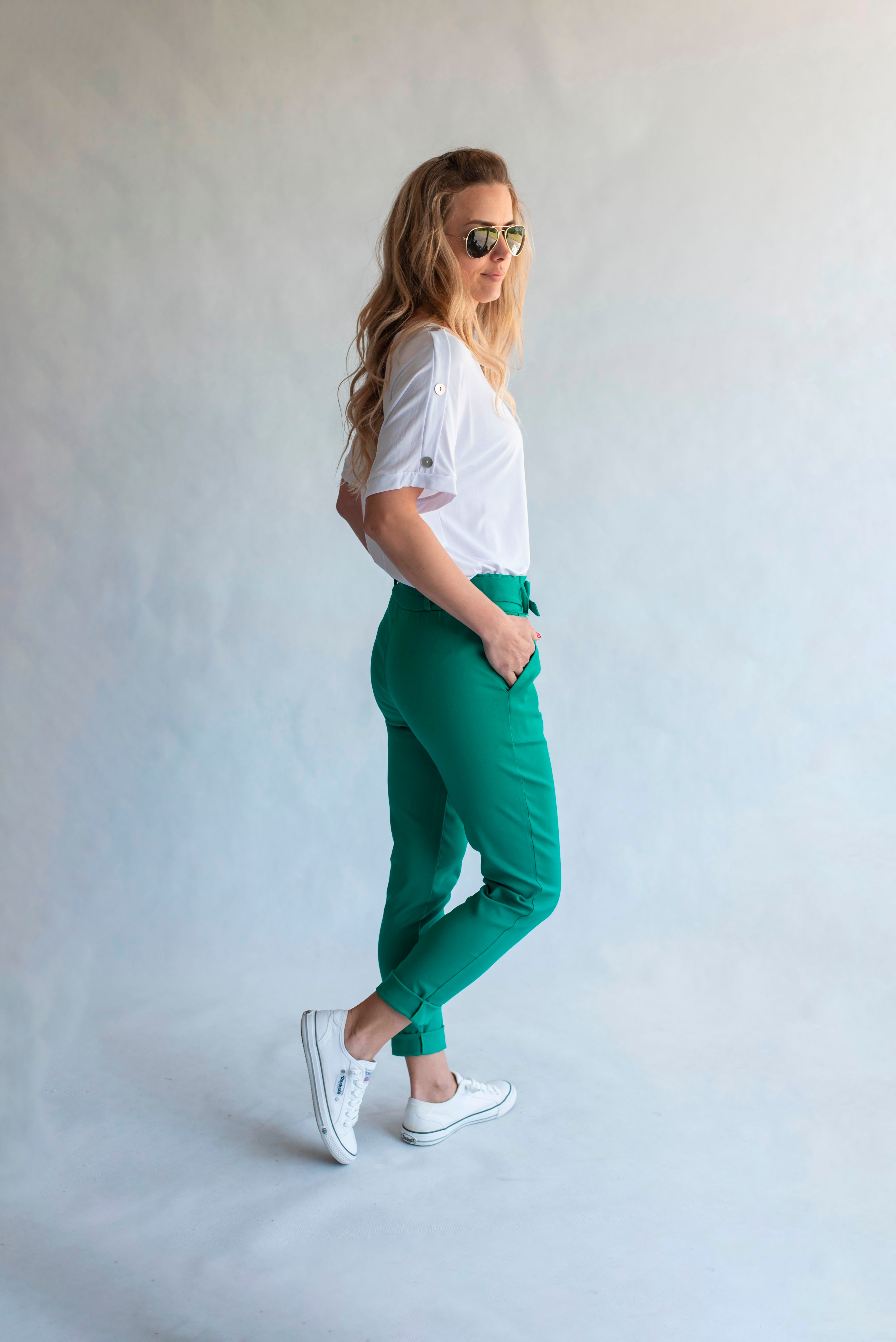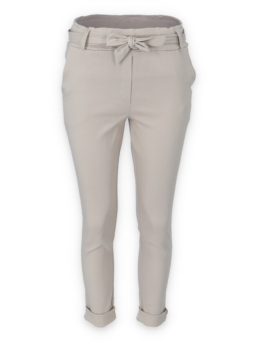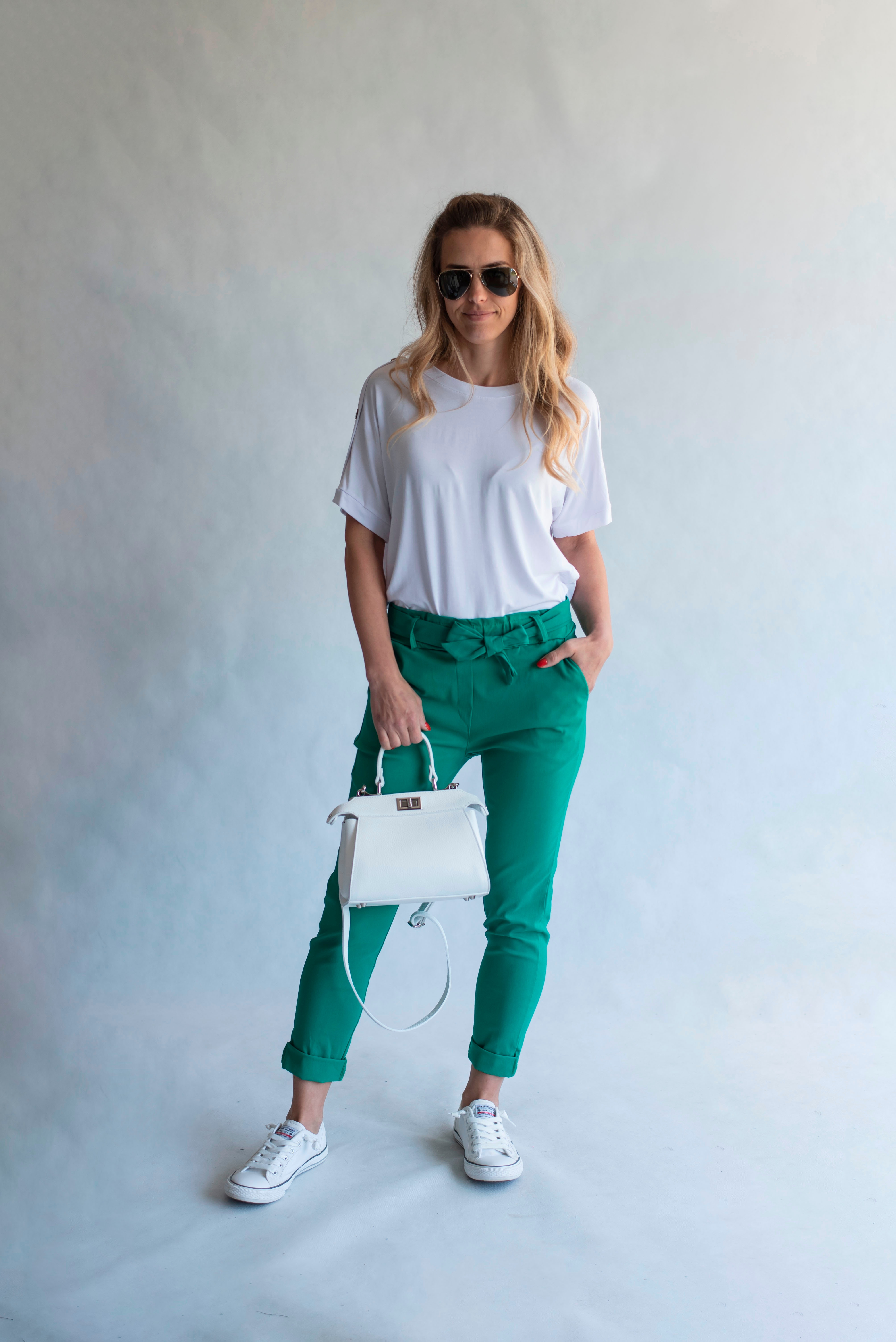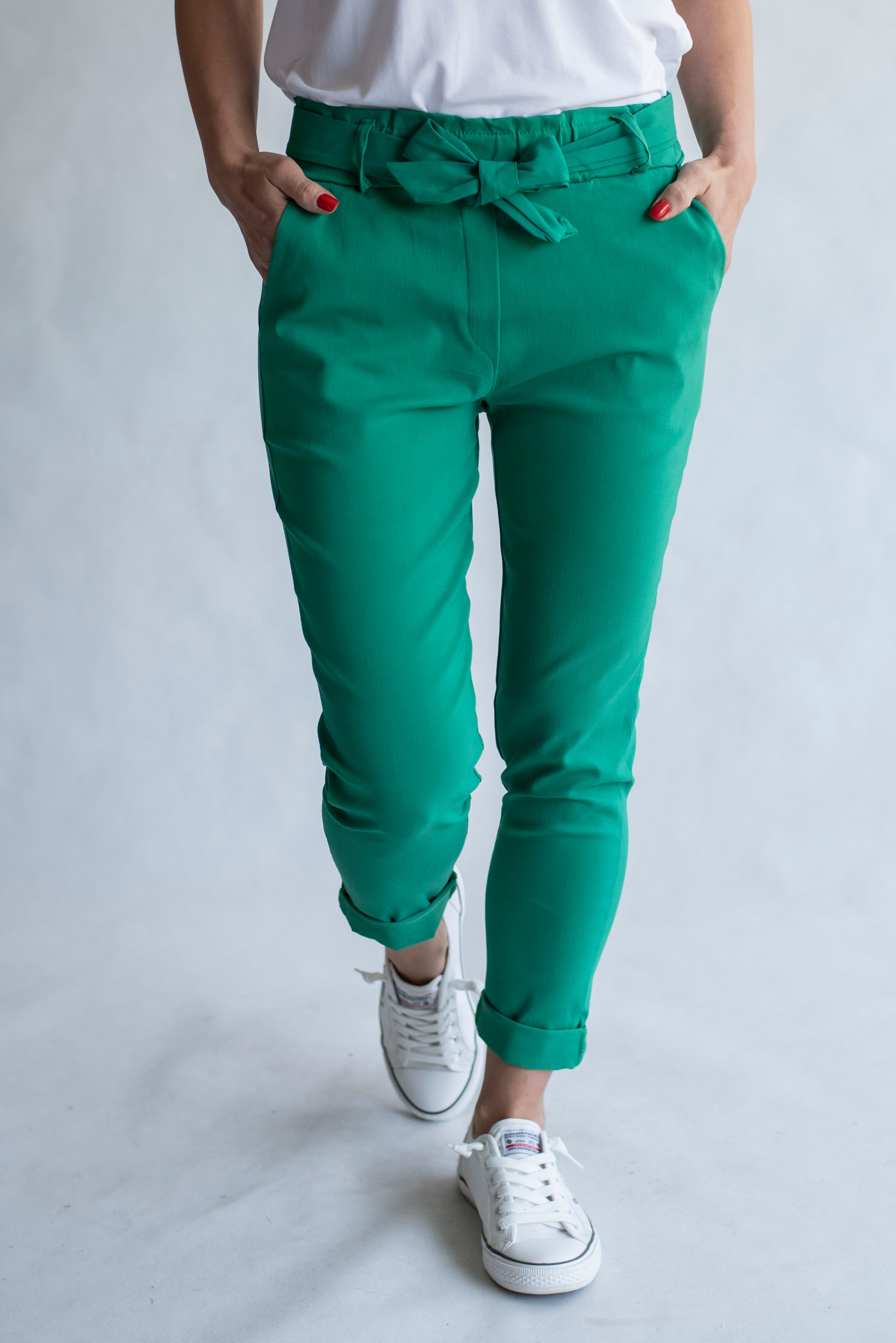 Módní kalhoty pohodlného střihu, elastický pas, opasek a 2x přední kapsy, vázaní na mašli v pase