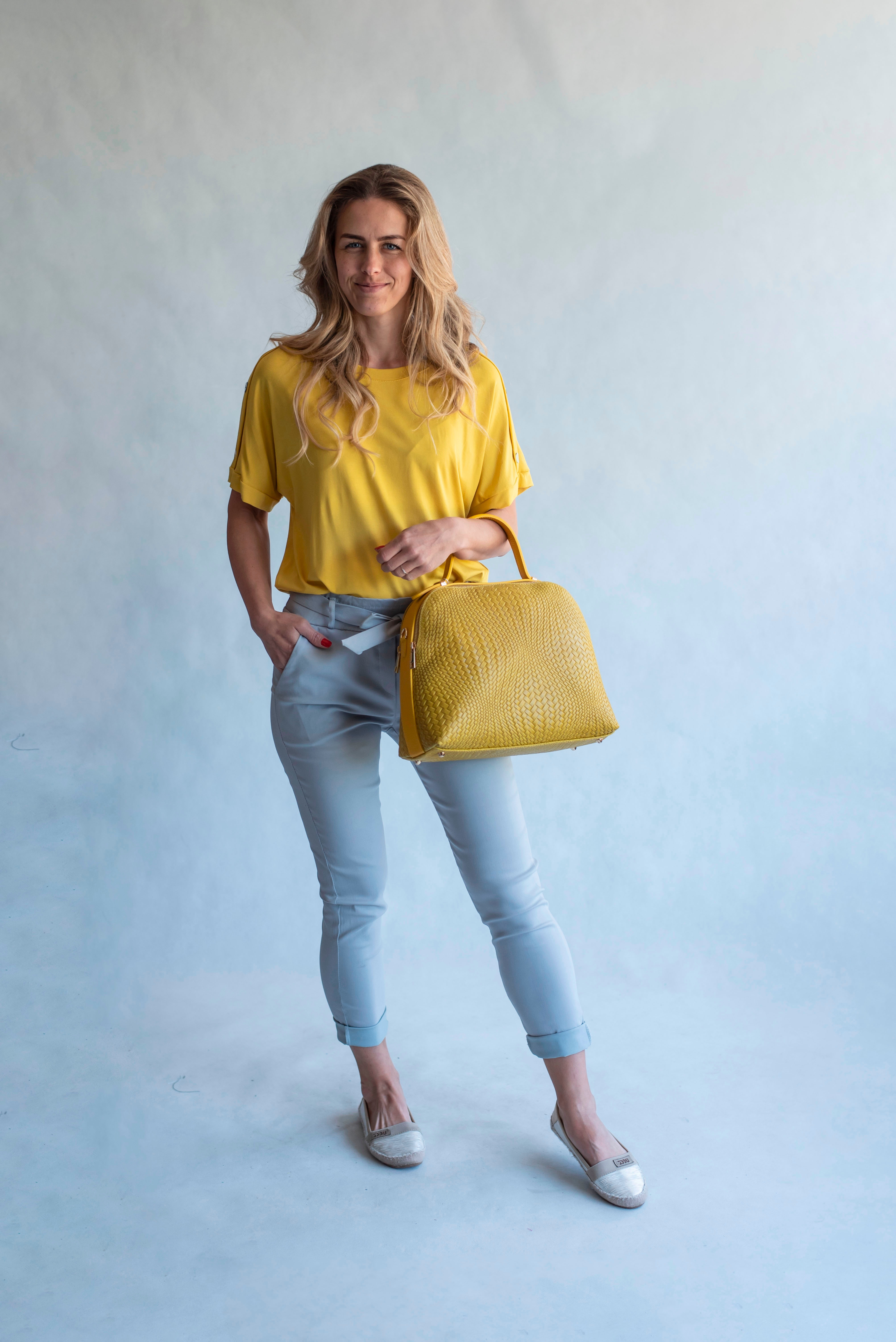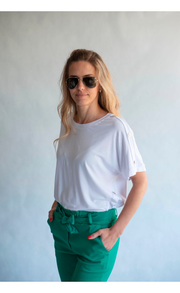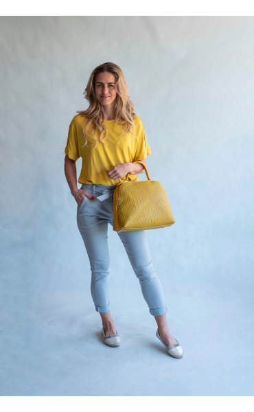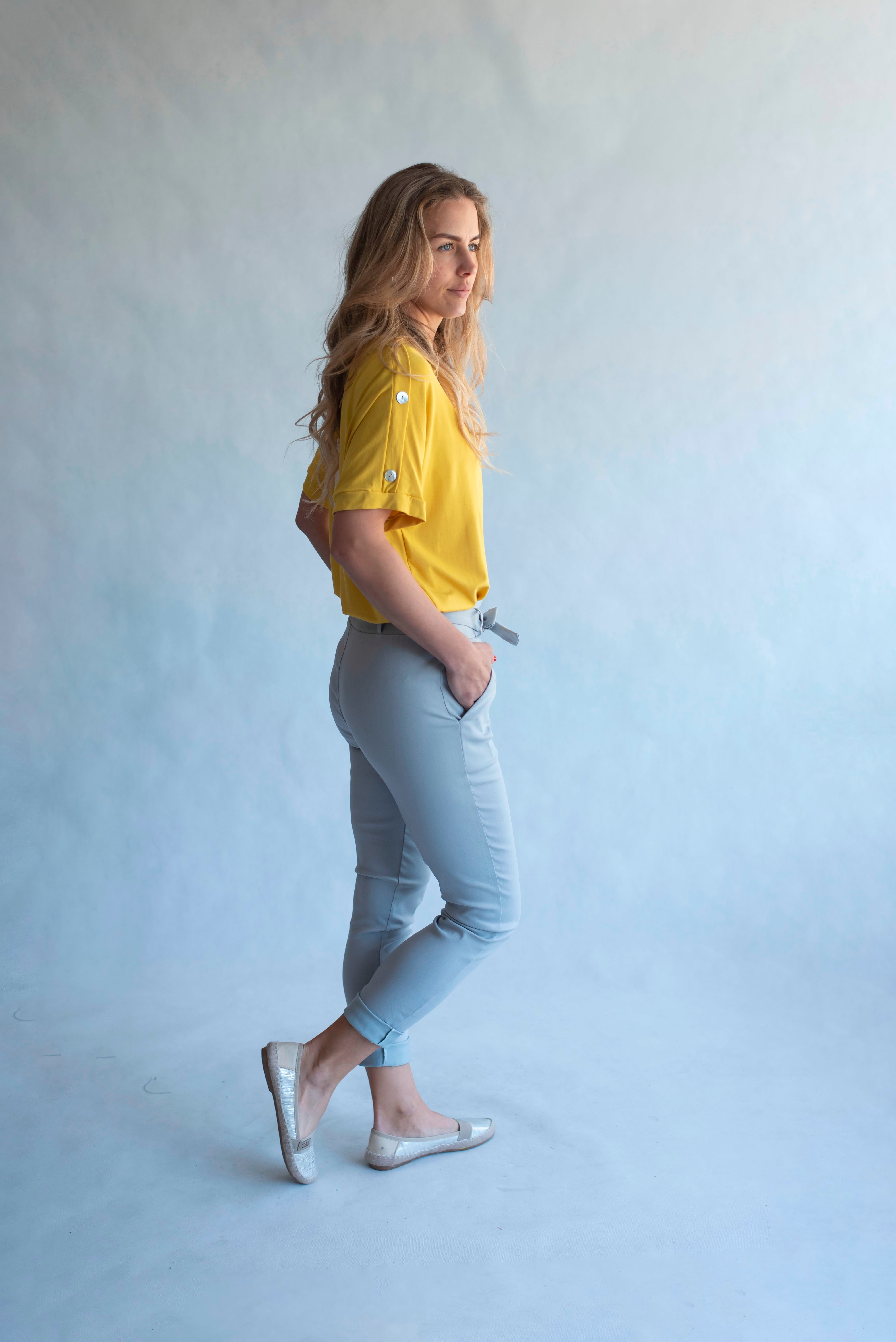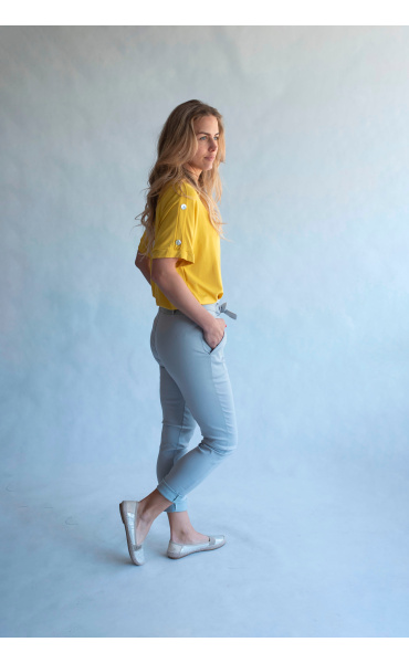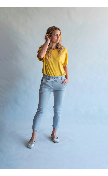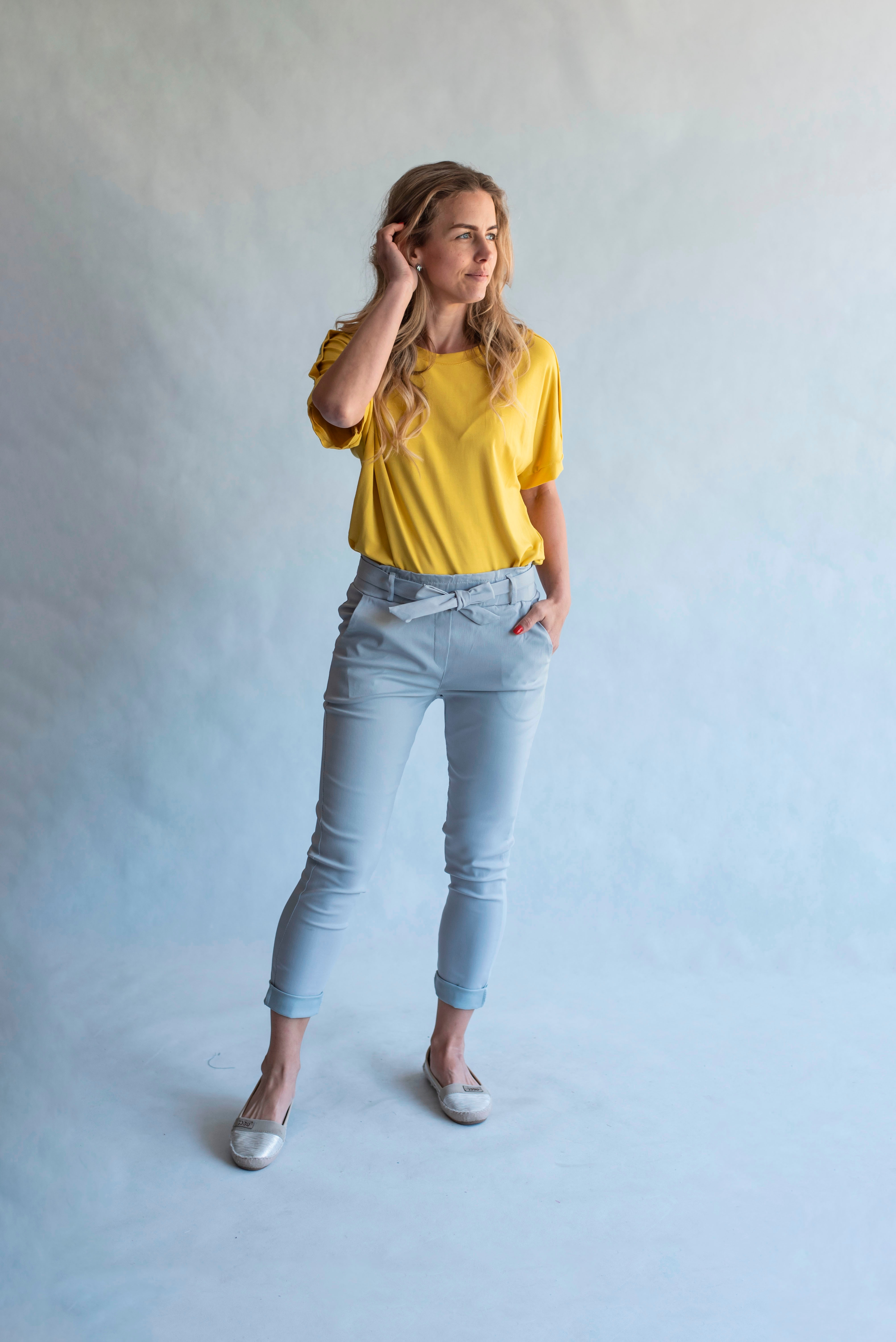Módní kalhoty pohodlného střihu, elastický pas, opasek a 2x přední kapsy, vázaní na mašli v pase
