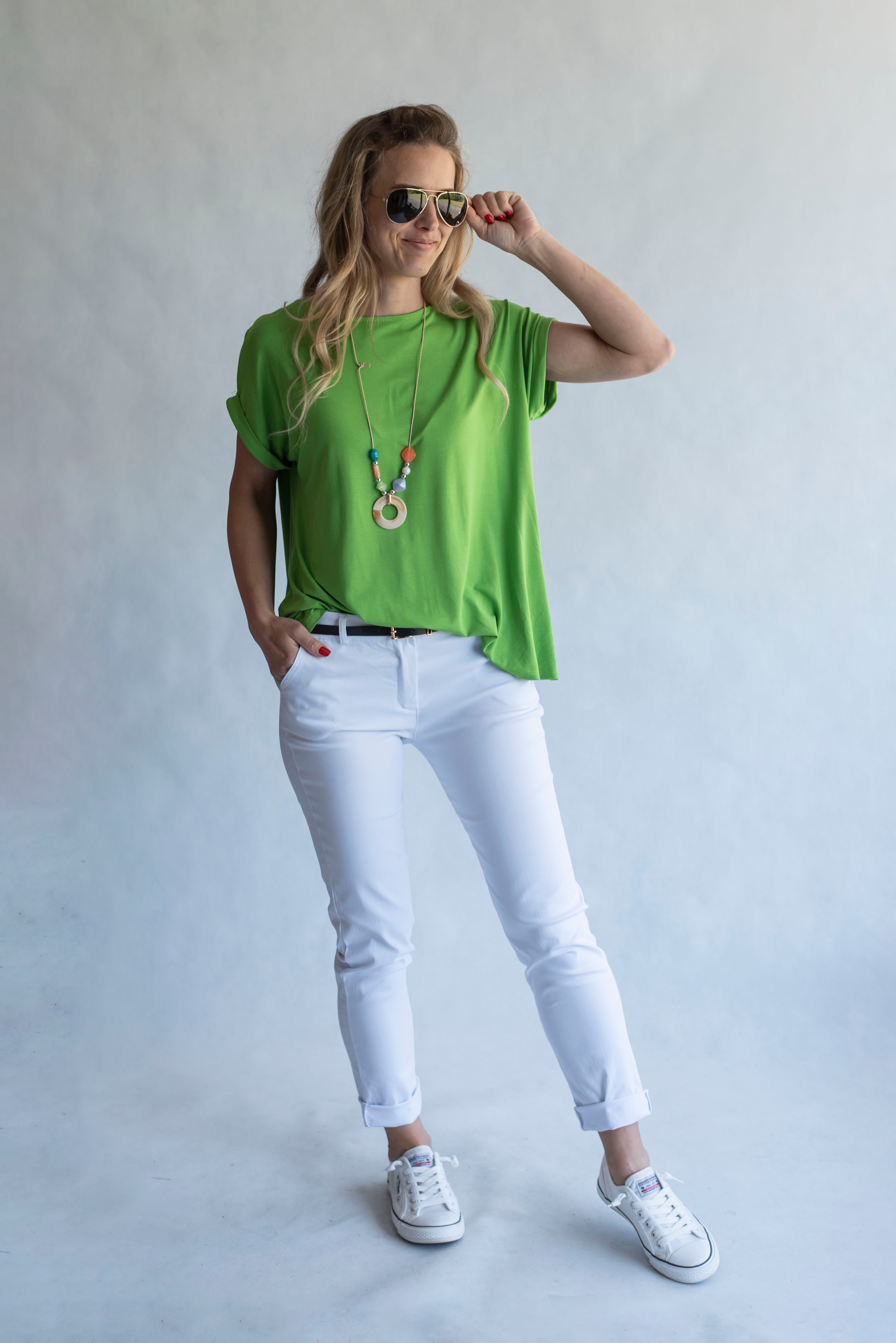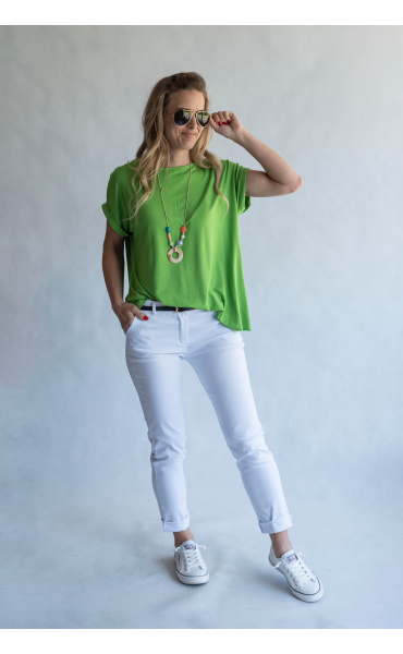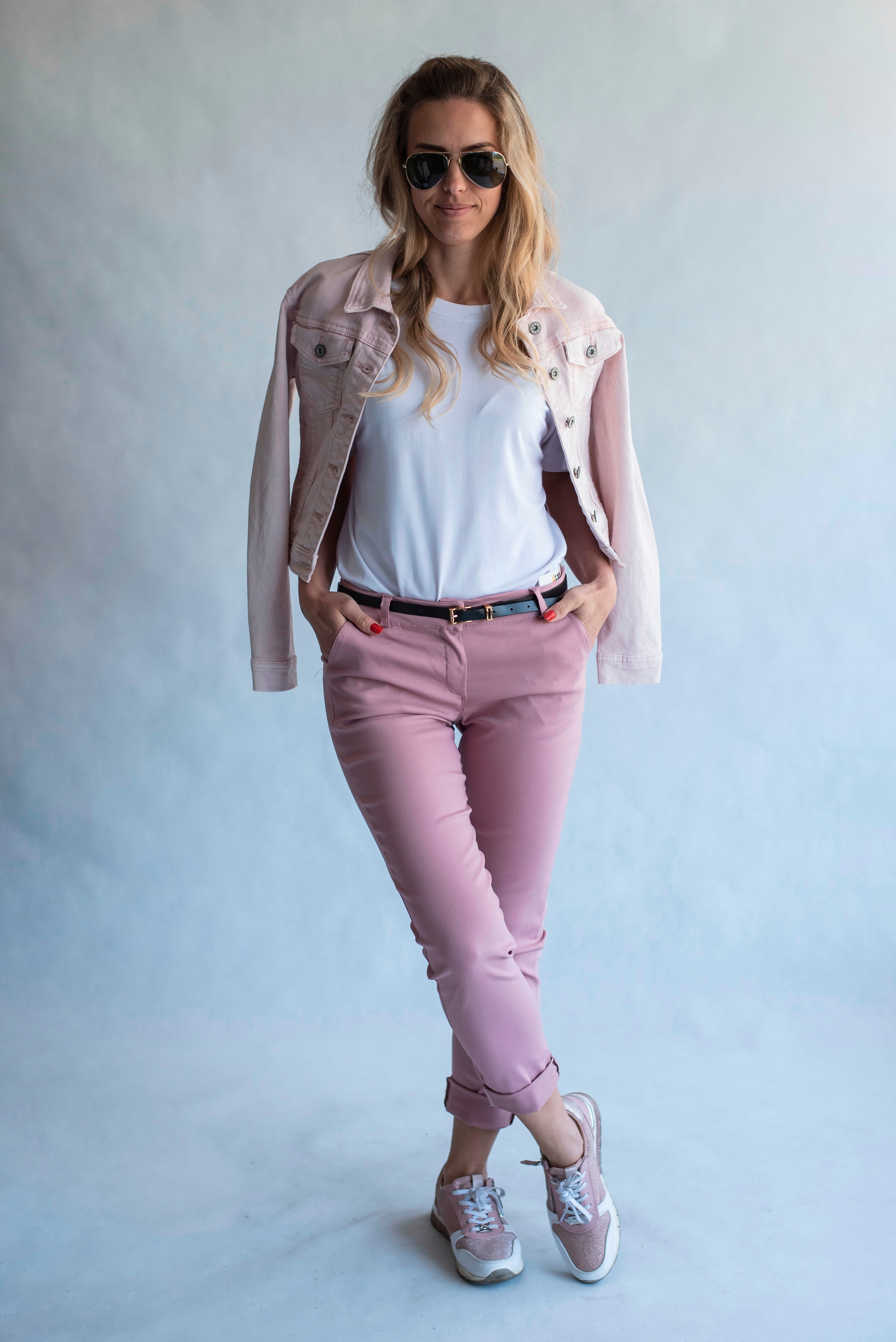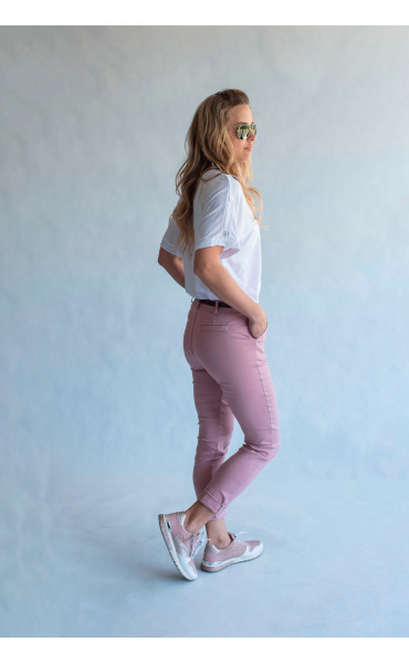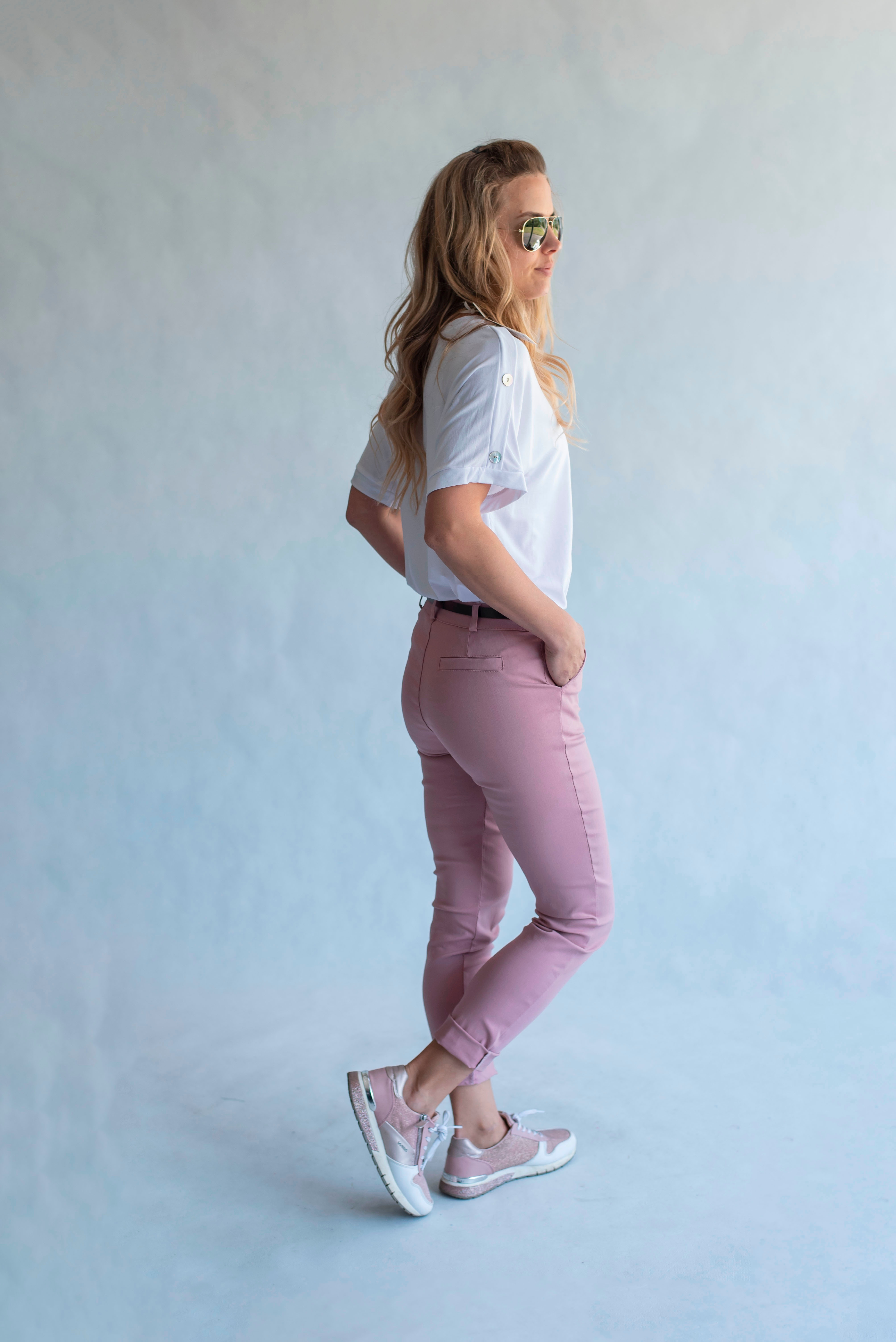 Módní kalhoty pohodlného střihu, elastický pas, opasek a 2x přední kapsy, jedna zadní