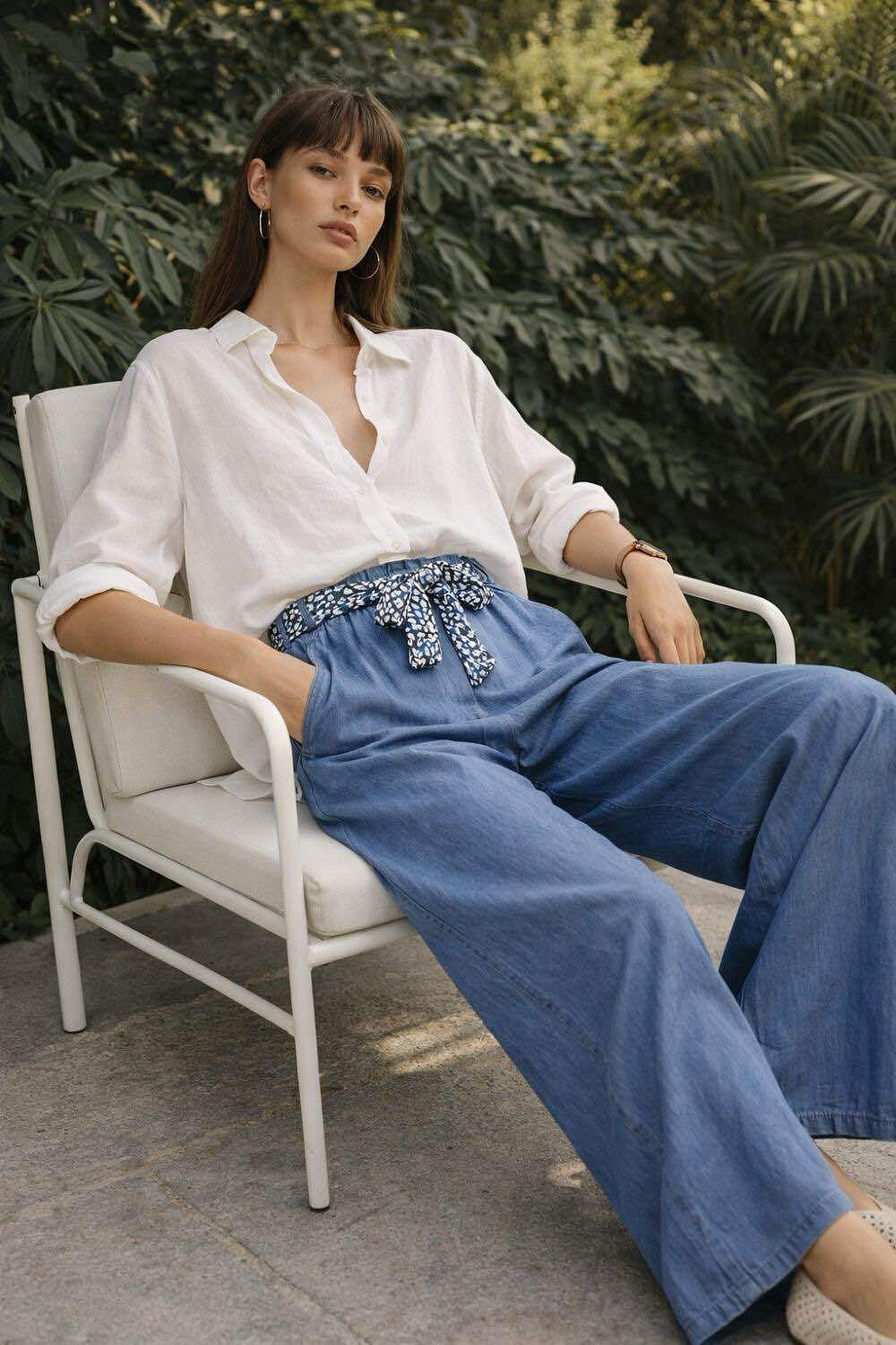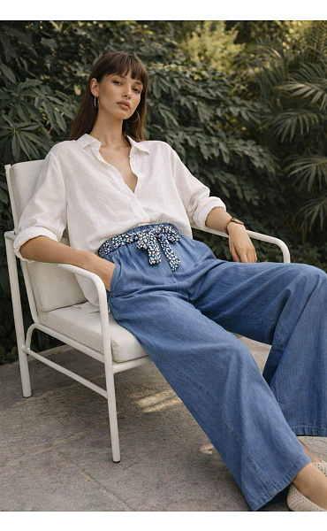 Dámské kalhoty s širokými nohavicemi WIDE-LEG střihu. Kalhoty jsou z prodyšného, odlehčeného materiálu Lyocell, v pase jsou do gumy, doplněny stylovým šátkem.